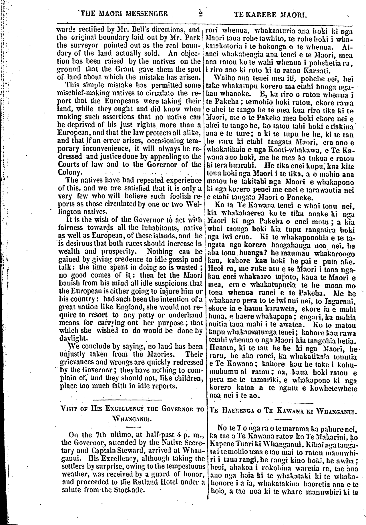 -THE MAORI MESSENGER. TE KARERE MAORI. VoI. VI.] AUCKLAND, JUNE 15, 1859.—AKARANA, HUNE 15, 1859. [No.ll. PORT NICHOLSON. Wo have heard that some Wellington na- tives have been circulating reports that the Europeans were depriving them of some of their reserves, and we feel called upon to contradict this assertion, as it is unfounded. We believe the report to have originated from a simple mistake in surveying. Porutu, a chief of the Ngatiawa at Wel- lington, bought a section of 100 acres from the Europeans. The survey of it was made in the presence of the natives, they were sat- isfied with it, fenced the land in, and nothing more was said on the subject: in the course of lime a fresh survey was made, preparatory to the issue of a Crown Grant. This survey differed slightly from the former one, as it included a small piece, about 3½ acres of an adjoining section belonging to a European, and this portion has been by mistake inclu- ded in Porutu's Grant: the survey was after- PONEKE. Kua rongo matou e korerotia ana e etahi o nga Maori o Poneke, kei te tangohia etahi o o ratou whenua rahui e te Pakeha; na, o mea ana matou me. whakahe enei korero, inahoki kahore he take pono. E mea ana matou, ko te take i tupu ake ai enei korero, he ruritanga pohehe. Hokona ana e Porutu, rangatira no Nga- tiawa i Poneke, kotahi tekihana whenua, 100 nga eka, he mea hoko nana i te Pakeha. Ruritia ana taua whenua, i reira ano nga Maori i te ruritanga, a pai ana hoki ratou; taiepatia ana e ratou, a mutu iho i reira nga korero. Roa noa te takiwa ki muri iho, na ka ruritia ano taua whenua, he ruritanga hoki kia puta ai te Karauna Karaati, ara, te pukapuka o Te Kuini mo te whenua; ko te- nei ruritanga kihai i tino tika ki Io te tua- tahi, i riro hoki tetahi wahi whenua o tetahi Pakeha ki roto, e toru pea eka me te hawhe o taua pihi; na, i riro he tenei ki roto ki to rohe o te whenua i tukua ki a Porutu; muri iho ka whakatikaia tenei he, na Te Pere hoki i mea: a whakahokia ana te tohe ki tera i whakatakotoria i te tuatahi e Te Paka, kai