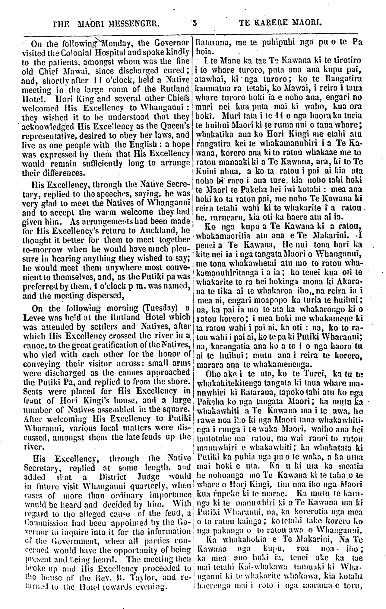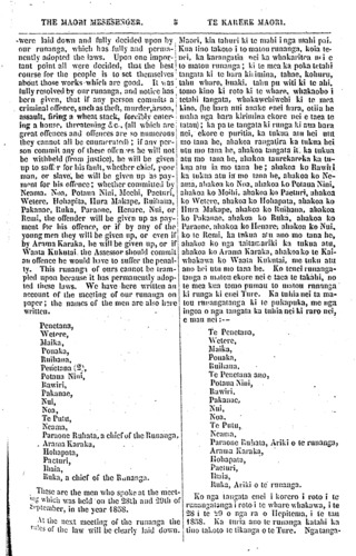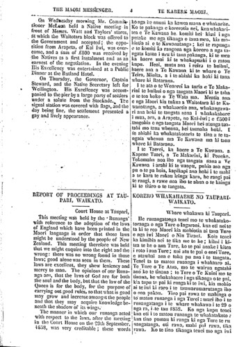 THE MAORI MESSENGER. 4 TE KARERK -1IAOSL. O:il Wednesday moming: RIr. Comniiit- s?o"Acr McUsrt h"eld a Native meel!ng in front of Messrs. Walt and Taylors' stbrcs; at which ihe Waitotara b!ocly was oucrcd to (lie Government and accepted; iho oppo- sition from Arapcta> of Kai Iwi, was ovcr- Conic, and a sum of £SOO was rcccivcil by the NAtivcs as a first instalment and as an earnost of the negotiation. In ihe evening K5s Excellency was ciilcrt;inicd at a Public Dinncr at t!ic Rutland Hotel. On Thursday, the Governor, Captain Stcward, and l!ie Native Sccrctary left for Wc'ilington. His Excellency was accom- panied to the pier by a !arge parly of selllers under a salulc from l!ie Stockauc.^ Ihe signal station was covcrci! wil!l flag?, and ihe day being fine, the settlement prcsenlcd a gay and lively appcarancc. REPORT OF PROCEEDINGS AT TAU- PAKI, WAIKATO. Court House at Tanpari, Tli!s meeting was lie!d by ihe ' Runanga' i ivllh rcfercnce to l!ie adoption of the laws j of England which have been p» inted in the Maori language in order ibai those laws might be undcrslood by l!ie people of Now Zealand. This meeting ihcreforc was held thai we might cnquirc into the riglit anri iho wong: there was no wrong found in lliose laws; good alone was seen in them. These laws are excellent, they shew leniency and mcrcy to man. T!ie opinions of onr Runa- nga are, that the laws oi God are for both llic soul and the body, bill that ihe law of the! Qneen is for the body, for ihe purposc of carrying oni good rulcs» so ihat v»'hat is good inny grow and incrcasc amongst t!ic people and lliat llicy may acquirc knowledge bc- ncaih llic shadow of ils wing-;. The manncr in which onr rnnanga acted •With respect to ihe laws, aflor llic nicciing »n Iho Co'.irl House on the 29l!i Septembcr, i 8^8, wa? vcry crcculablc ; tlicsc words konga he nunui ka kawea maea e whakarita. Ko is pakanga e fcorerot«a nei, kua whakar i- lea e To Kawana he. komili hei kimi i nga p"in?;e mo nga tikanga o taua moa, hi:i mo- l!iolia ai e to Kawanatanga ; kei ie rapnng.t e* lc komili ka rangona nga korero a nyi l;i- ngata katoa » Ui-u ki iai;a pakanga, ki io mea ka hacrft mai U te whakapuaki i o ratou kupu. Heoi, mulii ana i reira ta h«ilmT, liaere ana a To Kawana ki to whare o "'J'c Teira, BIinita, a i io ahiahi ka hoki ki iana whare ki Katarann. I lc aio o te Wenonn ka turia e Te MnRa- rini te huihui o nga tangata Maori ki te tn!ia o lc toa hoko o Te Waia ma. Meatia ana e nga TJaori kia i«?vn:» n Wailotara ki to Ku- wanatr»nga, a whakaaetia ana» wliakaiTgawa- n ana hoki te tangata nana i whakakahor^ ji mua, arn, a Arapcta, no Kai-ivn; c foOOi tangoliia e nga tangata Maori hei utunga laa- tai» mo taua whenua, Iiei lanna?ia hoki. I (e ahia!» ka whakatakolon;i to tinei u lc ta- ngata whenua asa Te Kawana ina ki tana whare I« Ualarana. I lc Taerci, ka Iiaere a Te Kawana. 3 1 Kapene Taari, a Te AIakarini, ki Poneke. Tokomaha noa iho ng;i tangata nan;i a Te Kawana i arahi ki te waapu, pu?iia ana nga pu o te pa hoi;i, kapikap» ana hoki i te mahi a ie kara lc raliau «ringa- kar;), he rangi pai te rangi, a rawe noa iho te alma o te kainga ki te liliro o lc tangata. KOREKO WHAKAHAERE A'O TAUPAHI» WAIKATO» Whare vkakawa ki Taupari. Ue nmangatan^a tenei rno te whakatako- toranga o nga Turc olngarani. kua oti neilc ta ki te reo Maori kia mohiotia ai tana Ture e nga iwi .Maori o Niu Tirai!?. Ko;;» ter.c» ka kimihia nei lc tika ine to lie; kih;ii i ki- tea te he o ana Tare, ko te pai anake i kitea i rolo i aua Ture; nui atu te pai o enei Tnre» e atawhai ana e toha pu ana i te tangata* Tenei ta io matou riiaangti i whakaaro ai* Te Tu re o Te Atua, mo lc wairna ngatahi ano ko to tinana ; te Tnre o Te Kuini mo t& tinana, he whakahakre i nga tikanga o te pai, kia tupu to pai ki rnnga ki lc i\\\\i, kia mohio ai lc iwi ki raro i te launiaruniarutanga iho o ona pakau. Tino pai rawa 1& mahinga o io matou runapga i nga Turci: muri iho i te runaugatanga i te whare whakawa i io 29 o j nga ra, i-te tau JSoS. Ko nga kupu tene» 1 kua oti i to matou ninanga io ^whakatakoto : 1 kua tino pumau ki runga ki nga Tnrc lc ru hangatanga, oi! rawa, mahi p:i? rav.'a, tika rawa. Ko to lino tikanga tenei mo nga hu