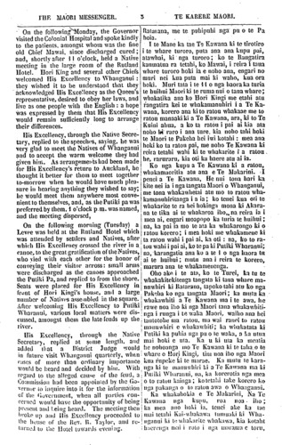 THE MAORI MESSENGER. 5 TE KARERE MAORI. On the following Monday, the Governor visited the Colonial Hospital and spoke kindly to the patients, amongst whom was the fine old Chief Mawai, since discharged cured; and, shortly after 11 o'clock, held a Native meeting in the large room of the Rutland Hotel. Hori King and several other Chiefs welcomed His Excellency to Whanganui: they wished it to be understood that they acknowledged His Excellency as the Queen's representative, desired to obey her laws, and live as one people with the English: a hope was expressed by them that His Excellency would remain sufficiently long to arrange their differences. His Excellency, through the Native Secre- tary, replied to the speeches, saying, he was very glad to meet the Natives of Whanganui and to accept the warm welcome they had given him. As arrangements had been made for His Excellency's return to Auckland, he thought it better for them to meet together tomorrow when he would have much plea- sure in hearing anything they wished to say; he would meet them anywhere most conve- nient to themselves, and, as the Putiki pa was preferred by them. 1 o'clock p.m. was named, and the meeting dispersed, On the following morning (Tuesday) a Levee was held at the Rutland Hotel which was attended by settlers and Natives, after which His Excellency crossed Ihe river in a canoe, to the great gratification of the Natives, who vied with each other for the honor of conveying their visitor across: small arms were discharged as the canoes approached the Putiki Pa, and replied to from the shore. Seals were placed for His Excellency in front of Hori Kingi's house, and a large number of Natives assembled in the square. After welcoming His Excellency to Putiki Wharanui, various local matters were dis- cussed, amongst them the late feuds up the liver. His Excellency, through the Native Secretary, replied at some length, and added that a District Judge would in future visit Whanganui quarterly, when cases of more than ordinary importance would be heard and decided by him. With regard to the alleged cause of the feud, a Commission had been appointed by the Go- vernment to inquire into it for the information i of the Government, when all parties con- cerned would have the opportunity of being p'.'c.scni. mid l.eing liearu. The meeting then ! If'okp up anil His Excellency proceedcd lo| t!ic IK-USC ol' llic Huv. n. T;I) Ior, and re-! liifi!cJ io l!ie lloLcl luwarLis evening. ; Ralaiana, me te puhipuhi nga pu o te Pa hoia. T te Mane ka tae T° Kawana ki te tirotiro i te whare turoro, puia ana ana kupu pai, atawhai, ki nga luroro; ko te Kangatira kaumatua ra tetahi, ko Mawai, i reira I taua whare luroro holti ia e noho ana, engari no muri nei kua puia mai ki waho, kua ora hoki. Muri tata i te H o nga liaoraka turia le huihui Maori ki te ruma nui o taua whare; whakatika ana ko Hori Kingi me elalii atu rangaiira kei te whakamanuhiri i a Te Ka- wana, korero ana ki to raiou whakaae me to ratou manaaki ki a Te Kawana, ara, ki to Te Kuini ahua, a ko ta ratou i pai ai kia aia noho hi raro i ana ture, kia noho lalii hoki te Maori le Pakeha hei iwi kotahi: mea ana hoki ko la ralon pai, me nolio Te Kawana ki reira tetahi wahi ki te whakaute r a raiou , he, raruraru, kia oti ka liaere alii ai ia. Ko nga Itupu a Te Kawana ki a ralou, [whakamaoritia atu ana e Te Makarini. I ! penei a Te Kawana, He nui tona hari ka I kite nei ia i nga tangata Maori o Whanganui, ! me tona whakawhetai atu mo to raiou wha- i kamanuhiritanga i a ia; ko tenei kua oti te i whakaute te ra liei hoking;» mona ki Akara- i na te tika ai le whakarea iho,, na reira ia i \\ mea ai, engari luoapnpo ka turia te huihui; na, ka pai ia mo te aia ka whakarongo ki o ratou korero; i mea hoki me whakamene ki ta raiou wahi i pai ai, ka oti : na, ko to ra- tou wahi i pai ai, ko te pa ki Putiki Whakanui; na, karangatia ana ku a te 1 o nga liaora tu ai te huihui; mutu ana i reira le korero, marara ana te whakahekenga. Oho ake. i te ai;), ko te Tiirei, ka io te wbakakitekitenga tangata l<i Iaua whare ma- nnwhiri h\\ Kaiarana, tapoko tahi atu ko nga Pakeha ko nga tangata Maori; ka muia ka whakawhiti a Te Kawana ma i te awa, he rawe noa iho ki nga Maori iana whakawhiti- nga i runga i te waka Maori, waiho nna hei laiiloiolie ma r;nou, ina wai ranei to ratou manuwhiri e whakawhiti; It;i whakatata ki Niniki l<a puhia nga pu o Io waka, a ka utua mai hoki e ina. Ka u ki ma ka meatia he nohoanga ino Te Kawana ki to taha.o te whare o Hori Kingi, tini noa iho nga Maori kua rnpcke ki te m;irae. ICa mniu le kara- nga ki le manuwhiri ki a Te Kawana ma L'i PU! iki Wli;iraiiiii, na, k;i korerolia nga mea o Io ralon kainga; ko tetahi take korero I«;o nga pukanu:i o to ralun awa o Whanganui. Ka whakahokia e Te Alaliarim, Na To Kawana nga kupu, ro.i noa - iho; ka me;i ano hoki ia, tenei ake ka luo rnai leiahi Kai-\\vluikaw;i luii!it;tki ki Wh;i- ng;inui ki Ifuhak;mic whakawa, kiu kotahi li;icmt^;i ru:ii i rolo i na;i i;i;u'ai«a c toru,