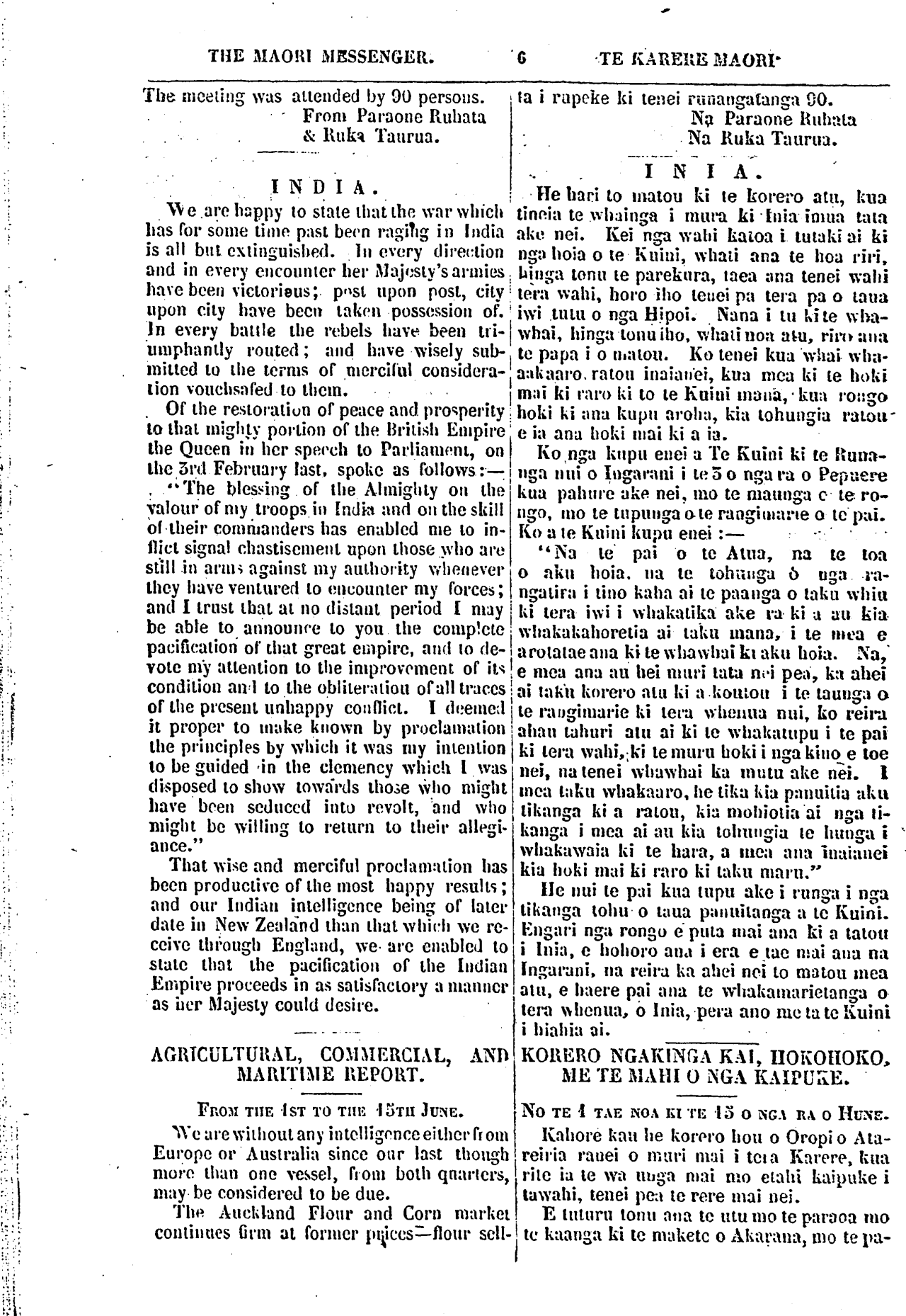 THE MAORI MESSENGER. 6 TE KARERE MAORI The meeting was attended by 90 persons. - From Paraone Ruhata & Ruka Taurua. INDIA We aro happy to state that the war which has for some time past been raging in India is all but extinguished. In every direction and in every encounter her Majesty's armies have been victorious; post upon post, city upon city have been taken possession of. In every battle the rebels have been tri- umphantly routed; and have wisely sub- mitted to the terms of merciful considera- tion vouchsafed them. Of the restoration of peace and prosperity to that mighty portion of the British Empire the Queen in her speech to Parliament, on the 3rd February last, spoke as follows:— "The blessing of the Almighty on the valour of my troops in India and on the skill of their commanders has enabled me to in- flict signal chastisement upon those who are still in arms against my authority whenever they have ventured to encounter my forces; and I trust that at no distant period I may be able to announce to you the complete pacification of that great empire. and to de- vote my attention to the improvement of its condition and to the obliteration of all traces of the present unhappy conflict. I deemed it proper to make known by proclamation the principles by which it was my intention to be guided in the clemency which I was disposed to show towards those who might have been seduced into revolt, and who might bo willing to return to their allegi- ance." That wise and merciful proclamation has been productive of the most happy results; and our Indian intelligence being of later date in New Zealand than that which we re- ceive through England, we are enabled to state that the pacification of the Indian Empire proceeds in as satisfactory a manner as her Majesty could desire. AGRICULTURAL, COMMERCIAL, AND MARITIME REPORT. FROM THE 1ST TO THE •I5TH JUNE . We are without any intelligence either from Europe or Australia since our last though more than one vessel, from both quarters, may be considered to be due. The Auckland Flour and Corn market continues firm at former prices flour sell- ta i rupeke ki tenei runangatanga 90. Na Paraone Ruhata Na Ruka Taurua. I N I A. He hari to matou ki te korero atu, kua tineia te whainga i mura ki Inia imua tata ake nei. Kei nga wahi katoa i tutaki ai ki nga hoia o te Kuini, whati ana te hoa riri. hinga tonu te parekura, taea ana tenei wahi tera vvahi, horo iho tenei pa tera pa o taua iwi lulu o nga Hipoi. Nana i tu kite wha- whai, hinga tonu iho. whau noa atu, riro ana te papa i o matou. Ko tenei kua what wha- aakaaro. ratou inaianei, kua mea ki te hoki mai ki raro ki to te Kuini mana, kua rongo hoki ki ana kupu aroha, kia tohungia ratou e ia ana hoki mai ki a ia. Ko nga kupu enei a Te Kuini ki te Runa- nga nui o Ingarani i te 3 o nga ra o Pepuere kua pahure ake nei, mo te maunga e te ro- ngo, mo te tupunga o te rangimarie o te pai. Ko a te Kuini kupu enei:— - " Na te pai o te Atua, na te toa o aku hoia. na te tohunga o nga ra- ngatira i tino kaha ai te paanga o taku whiu ki tera iwi i whakatika ake ra ki a au kia whakakahoretia ai taku mana, i te mea e arotatae ana ki te whawhai ki aku hoia. Na, e mea ana au hei muri tata nei pea, ka ahei ai taku korero atu ki a koutou i te taunga o te rangimarire ki tera whenua nui, ko reira ahau tahuri atu ai ki te whakatupu i te pai ki tera wahi, ki te muru hoki i nga kino e toe nei, na tenei whawhai ka mutu ake nei. I mea taku whakaaro, he tika kia panuitia uku tikanga kia ratou, kia mohiotia ai nga a ti- kanga i mea ai au kia tohungia te hunga i whakawaia ki te hara, a mea ana inaianei kia huki mai ki raro ki taku maru." He nui te pai kua tupu ake i runga i nga tikanga tohu o taua panuitanga a te Kuini. Engari nga rongo e puta mai ana ki a tatou i Inia, e hohoro ana i era e lac mai ana na Ingarani, na reira ka ahei nei to matou mea atu, e haere pai ana te whakamarietanga o tera whenua, o Inia, pera ano me ta te Kuini i hiahia ai. KORERO NGAKINGA KAI, HOKOHOKO, ME TE MAHI O NGA KAIPUKE. NO TE i TAE NOA KI TE Io O NGA RA O HUNE. Kahore kau he korero hou o Oropi o Ata- reiria ranei o muri mai i tera Karere, kua rite ia te wa unga mai mo etahi kaipuke i tawahi, tenei pea te rere mai nei. E tuturu tonu ana te utu mo te paraoa mo te kaanga ki te makete o Akarana, mo te pa-