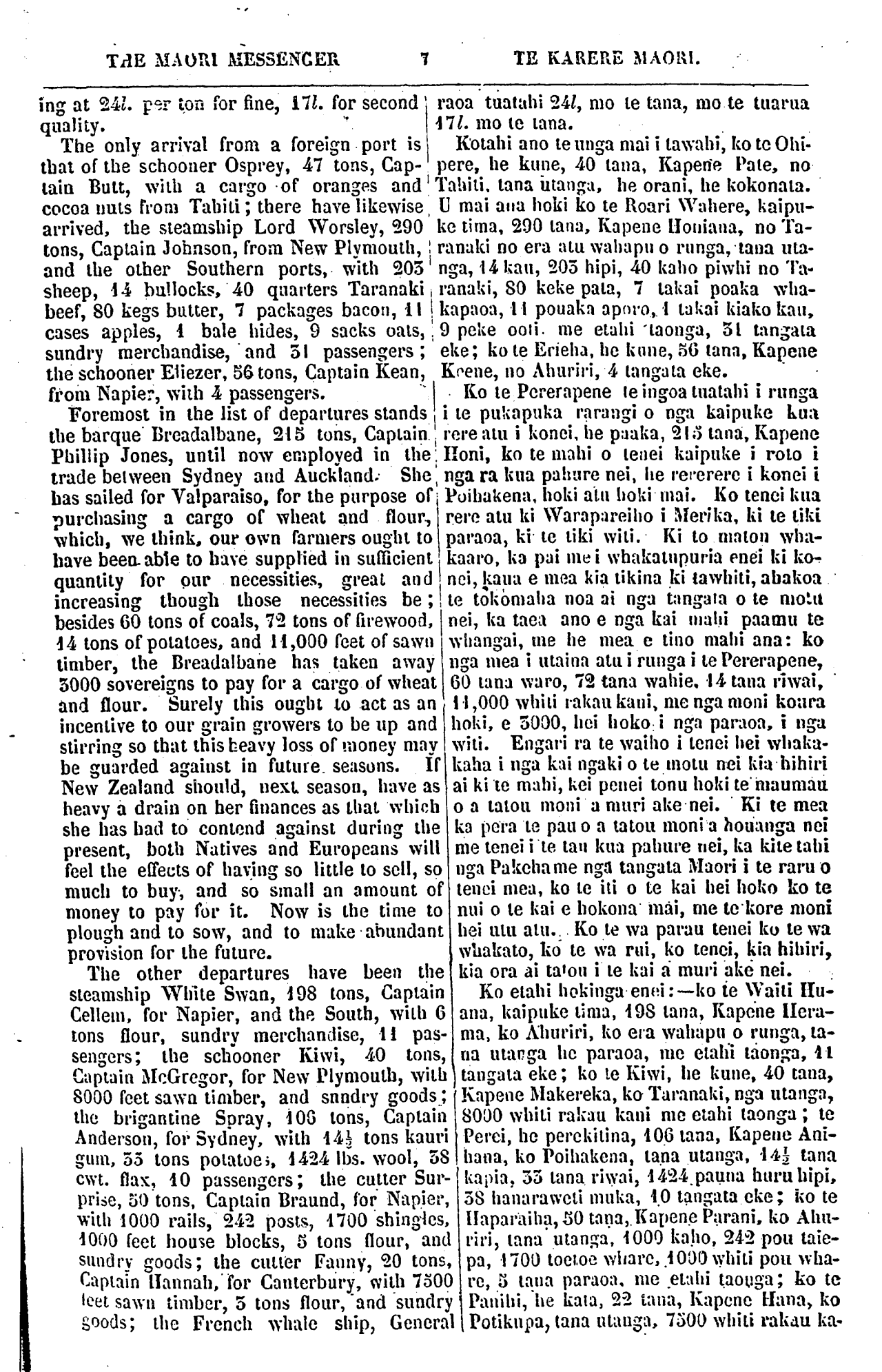 THE MAORI MESSENGER TE KARERE MAORI. ing at 241 per ton for fine, 171. for second quality. The only arrival from a foreign port is that of the schooner Osprey, 47 tons, Cap- tain Butt, with a cargo of oranges and cocoa nuts from Tahiti; there have likewise arrived, the steamship Lord Worsley, 290 tons, Captain Johnson, from New Plymouth,; and the other Southern ports, with 203 sheep, 14 bullocks, 40 quarters Taranaki beef, 80 kegs butter, 7 packages bacon, 11 cases apples, 4 bale hides, 9 sacks oats, sundry merchandise, and 51 passengers; the schooner Eliezer, 56 tons, Captain Kean, from Napier, with 4 passengers. Foremost in the list of departures stands the barque Breadalbane, 215 tons, Captain Philip Jones, until now employed in the trade between Sydney and Auckland. She has sailed for Valparaiso. for the purpose of purchasing a cargo of wheat and flour, which, we think, our ovvn farmers ought to have been able to have supplied in sufficient, quantity for our necessities, great and increasing though those necessities be; besides 60 tons of coals, 72 tons of firewood, 14 tons of potatoes, and 11, 000 feet of sawn timber, the Breadalbane has taken away 5000 sovereigns to pay for a cargo of wheat and flour. Surely this ought to act as an incentive to our grain growers to be up and stirring so that this heavy loss of money may be guarded against in future. seasons. If New Zealand should, next season, have as heavy a drain on her finances as that which she has had to contend against during the present, both Natives and Europeans will feel the effects of having so little to sell, so much to buy, and so small an amount of money to pay for it. Now is the time to plough and to sow, and to make abundant provision for the future. The other departures have been the steamship White Swan, 198 tons, Captain Cellem, for Napier, and the South, with 6 tons flour, sundry merchandise, 11 pas- sengers; the schooner Kiwi, 40 tons, Captain McGregor, for New Plymouth, with 8000 feet sawn timber, and sundry goods; the brigantine Spray, 106 tons, Captain Anderson, for Sydney, with 14½ tons kauri gum, 55 tons potatoes, 1424 Ibs. wool, 58 cwt. flax, 10 passengers; the cutter Sur- prise, 50 tons. Captain Braund, for Napier, with 1000 rails, 242 posts, 1700 shingles, 1000 feet house blocks, 5 tons flour, and sundry goods; the cutter Fanny, 20 tons, Captain Hannah for Canterbury, with 7300 feet sawn timber, 5 tons flour, and sundry goods; the French whale ship, General raoa tuatahi 241, mo te tana, mo te tuarua 171. mo te tana. Kotahi ano te unga mai i tawahi, ko te Ohi- pere, he kune, 40 tana, Kapene Pate, no Tahiti, tana utanga, he orani, he kokonata. U mai ana hoki ko te Roari Wahere, kaipu- ke tima, 290 tana, Kapene Honiana, no Ta- ranaki no era atu wahapu o runga, tana uta- nga, 14 kau, 203 hipi, 40 kaho piwhi no Ta- ranaki, 80 keke pata, 7 takai poaka wha- kapaoa, 11 pouaka aporo, 1 takai kiako kau, 9 peke ooti. me etahi taonga, 31 tangata eke; ko te Erieha, he kune, 56 tana, Kapene Keene, no Ahuriri, 4 tangata eke. Ko te Pererapene te ingoa tuatahi i runga i te pukapuka rarangi o nga kaipuke kua rere atu i konei, he paaka, 215 tana. Kapene Honi, ko te mahi o tenei kaipuke i roto i nga ra kua pahure nei, he rererere i konei i Poihakena, hoki atu hoki mai. Ko tenei kua rere atu ki Warapareiho i Merika, ki te tiki paraoa, ki te tiki witi. Ki to matou wha- kaaro, ka pai mei whakatupuria enei ki ko- nei, kaua e mea kia tikina ki tawhiti, ahakoa te tokomaha noa ai nga tangata o te motu nei, ka taea ano e nga kai mahi paamu te whangai, me he mea e tino mahi ana: ko nga mea i utaina atu i runga i te Pererapene, 60 tana waro, 72 tana wahie. 14 tana riwai, 11, 000 whiti rakau kani, me nga moni koura hoki, e 5000, hei hoko i nga paraoa, i nga witi. Engari ra te waiho i tenei hei whaka- kaha i nga kai ngaki o te motu nei kia hihiri ai ki te mahi, kei penei tonu hoki te maumau o a tatou moni a muri ake nei. Ki te mea ka pora te pau o a tatou moni a houanga nei me tenei i te tau kua pahure nei, ka kite tahi nga Pakeha me nga tangata Maori i te raru o tenei mea, ko te iti o te kai hei hoko ko te nui o te kai e hokona mai, me te kore moni hei utu atu. Ko te wa parau tenei ku te wa whakato, ko te wa rui, ko tenei, kia hihiri, kia ora ai tatou i te kai a muri ake nei. Ko etahi hokinga enei:—ko te Waiti Hu- ana, kaipuke uma, 198 tana, Kapene Hera- ma, ko Ahuriri, ko era wahapu o runga, ta- na utanga he paraoa, me etahi taonga, 11 tangata eke; ko te Kiwi, he kune, 40 tana, Kapene Makereka, ko Taranaki, nga utanga, 8000 whiti rakau kani me etahi taonga: te Perei, ho perekitina, 106 tana, Kapene Ani- hana, ko Poihakena, tana utanga, 14½ tana kapia, 55 tana riwai, 1424. pauna huru hipi. 38 hanaraweti muka, 10 tangata eke; ko te Haparaiha, 50 tana,. Kapene Parani. ko Ahu- riri, tana utanga, 1000 kaho, 242 pou taie- pa, 1700 toetoe whare,. 1000 whiti pou wha- re, 5 tana paraoa. me etahi taonga; ko te Panihi, he kata, 22 tana, Kapene Hana, ko Potikupa, tana utanga, 7500 whiu rakau ka-