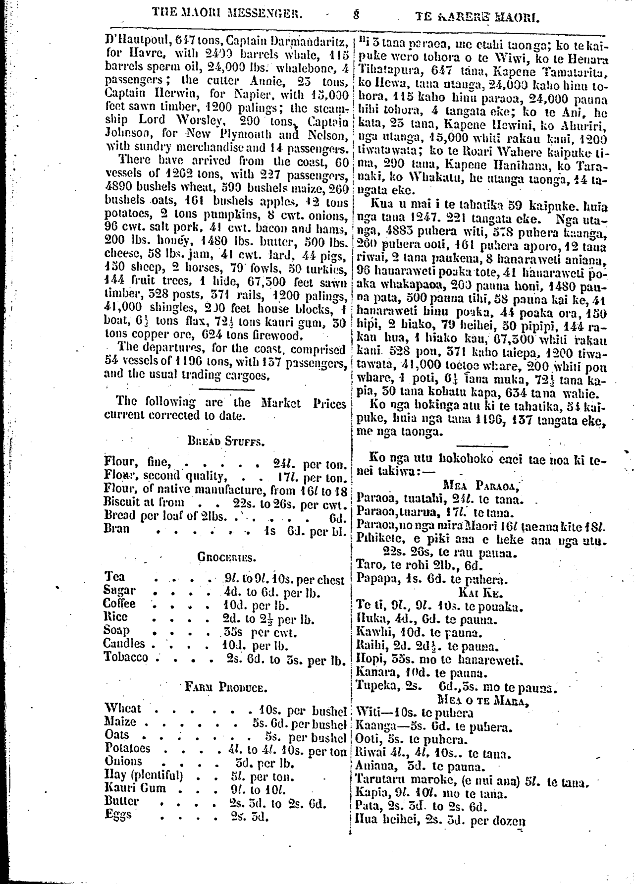 THE MAORI MESSENGER TE KARERE MAORI. D'HaulponI, 647 tons, Captain Darmandaritz, for Havre, with 2400 barrels whale, 115 barrels sperm oil, 24, 000 Ibs. whalebone, 4 passengers; the cutter Annie, 23 tons, Captain Herwin, for Napier, with 15, 000 feet sawn timber, I200 palings; the steam- ship Lord Worsley, 200 tons. Captain Johnson, for New PIymouth and Nelson, with sundry merchandise and 14 passengers. There have arrived from the coast, 60 vessels of 1262 tons, with 227 passengers, 4890 bushels wheat, 590 bushels maize, 260 bushels oats, 161 bushels apples, 12 tons potatoes, 2 tons pumpkins, 8 cwt. onions, 96 cwt. salt pork, 41 cwt. bacon and hams, 200 Ibs. honey, •I 480 Ibs. butter, 500 Ibs. cheese, 58 Ibs; jam, 41 cwt. lard, 14 pigs, 130 sheep, 2 horses, 79 fowls, 50 turkies, 144 fruit trees, 1 hide, 67, 500 fed sawn timber, 328 posts, 571 rails, 1200 palings, 41, 000 shingles, 230 feet house blocks, I boat, 6½ Ions flax, 72½ tons kauri gum, 30 tons copper ore, 624 tons firewood, The departures, for the coast comprised 54 vessels of 1196 tons, with 137 passengers, and the usual trading cargoes, The following are the Market Prices current corrected to date. BREAD STUFFS. Flour, fine, ..... 241 per ton. Flour, second quality, 171. per ion. Flour, of native manufacture, from 161 to 18 Biscuit at from . . 22s. to 26s. per cwt. Bread per loaf of 21bs. . . . . . 6d Bran . . .... 1s 6d. per bl. - GROCERIES. Tea .... 91. to 91. 10s. per chest Sugar . . . 4d. to 6d. per Ib. Coffee .... 10d. per Ib. Rice .... 2d. to 2½ per Ib. Soap ..... 35s per cwt. Candles ... . 10d. per Ib. Tobacco .... 2s. 6d. to 5s. per Ib. FARM PRODUCE. Wheat ... ... 10s. per bushel Maize ...... 5s. 6d. per bushel Oats ....... 5s. per bushel Potatoes .... 41 to 41. 10s. per ton Onions .... 3d. per Ib. Hay (plentiful) . . 51. per ton. Kauri Gum ... 91 to 101. Butter .... 2s. 3d. to 2s. 6d. Eggs .... 2s. 3d. ni 3 tana paraoa, me etahi taonga; ko te kai- puke wero tohora o to Wiwi, ko te Henara Tihatapura, 647 tana, Kapene Tamatarita, ko Hewa, tana utanga, 24, 000 kaho hinu to- hora, 115 kaho hinu paraoa, 24, 000 pauna hihi tohora, 4 tangata eke; ko te Ani, he kata, 25 tana, Kapene Hewini, ko Ahuriri, nga utanga, I 5, 000 whiti rakau kani, 1200 tiwatawata; ko te Roari Wahere kaipuke ti- ma, 200 tana, Kapene Hanihana, ko Tara- naki, ko Whakatu, he utanga taonga, 14 ta- ngata eke. Kua u mai i te tahatika 59 kaipuke. huia nga tana 1247. 221 tangata eke. Nga uta- nga, 4883 puhera witi, 578 puhera kaanga, 260 puhera ooti, 161 puhera aporo, 12 taua riwai, 2 tana paukena, 8 hanaraweti aniana, 96 hanaraweti poaka tote, 41 hanaraweti po- aka whakapaoa, 200 pauna honi, 1480 pau- na pata, 300 pauna tihi, 58 pauna kai ke, 41 hanaraweti hinu poaka, 44 poaka ora, 150 hipi, 2 hiako, 79 heihei, SO pipipi, 144 ra- kau hua, 1 hiako kau, 67, 300 whiti rakau kani. 528 pou, 371 kaho taiepa, 1200 tiwa- tawata, 41, 000 toetoe whare, 200 whiti pou whare, 1 poti, 6¼ tana muka, 72½ tana ka- pia, 30 tana kohatu kapa, 654 tana wahie. Ko nga hokinga atu ki te tahatika, 54 kai- puke, huia nga tana 1196, 137 tangata eke, me nga taonga. I Ko nga utu hokohoko enei tae noa ki te - nei takiwa:— 1 MEA PARAOA, Paraoa, tuatahi, 211 te tana. Paraoa, tuarua, 171. te tana. Paraoa, no nga mira Maori 161 tae a na kite 181. Pihikete, e piki ana e heke ana nga utu. 22s. 26s, te rau pauna. Taro, te rohi 21b., 6d. Papapa, 1s. 6d. te puhera. KAI KE. Te te, 91, 91. 10s. te pouaka. Huka, 4d., 6d te pauna. Kawhi, 10d te pauna. Raihi, 2d. 2d½. te pauna. Hopi, 55s. mo te hanarcweti, Kanara, 10d . te pauna. Tupeka, 2s. 6d., 5s. mo te pauna. MEA O TE MARA, Witi—10s te puhera Kaanga—5s. 6d. te puhera. Ooti, 5s. te puhera. Riwai 41., 41 10s. te tana. Aniana, 3d te pauna. Tarutaru maroke, (e nui aua) 51. te tana, Kapia, 91. 101. mo te tana. Pata, 2s. 3d. to 2s. 6 d Hua heihei, 2s. 3d. per dozen