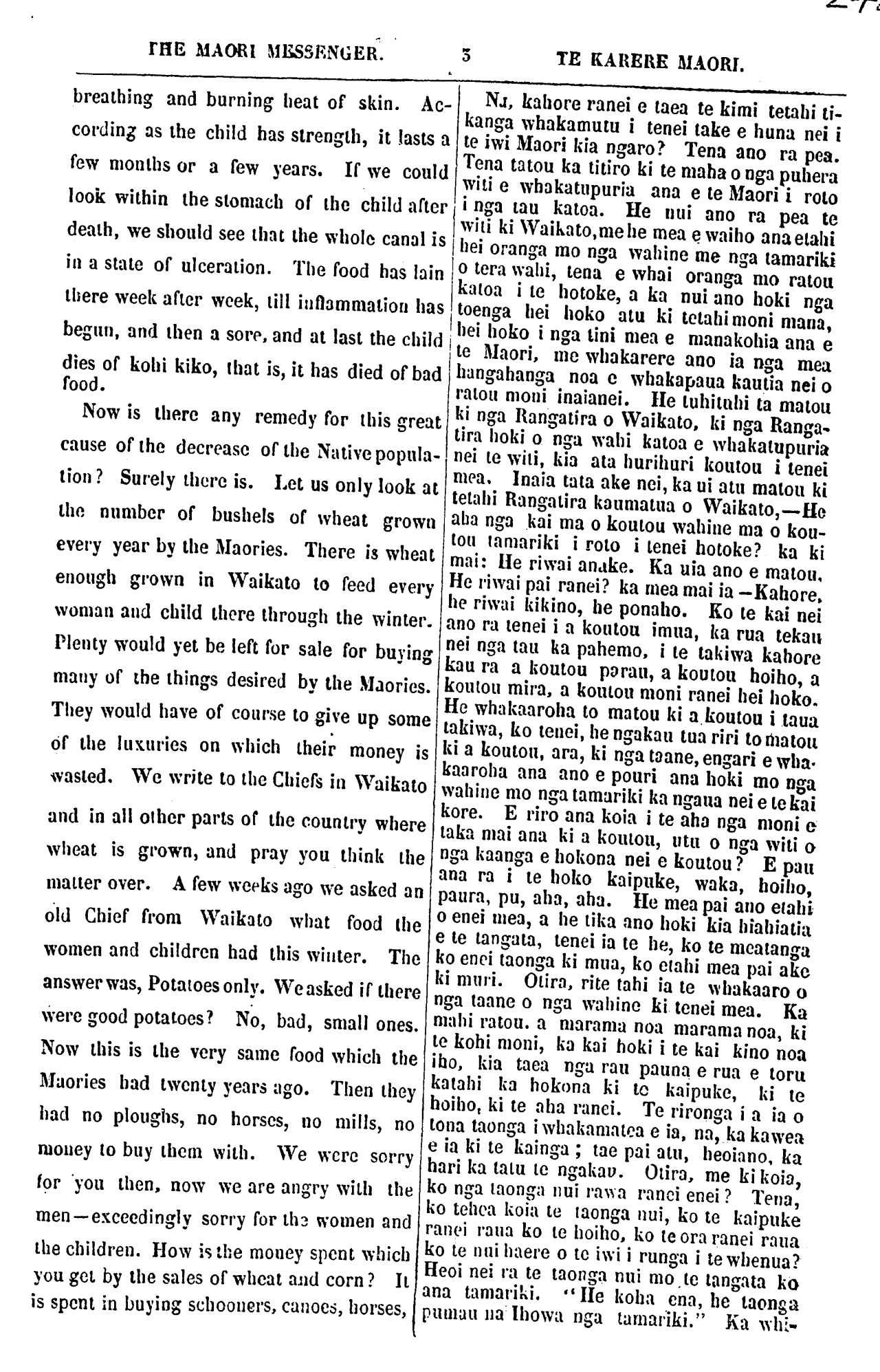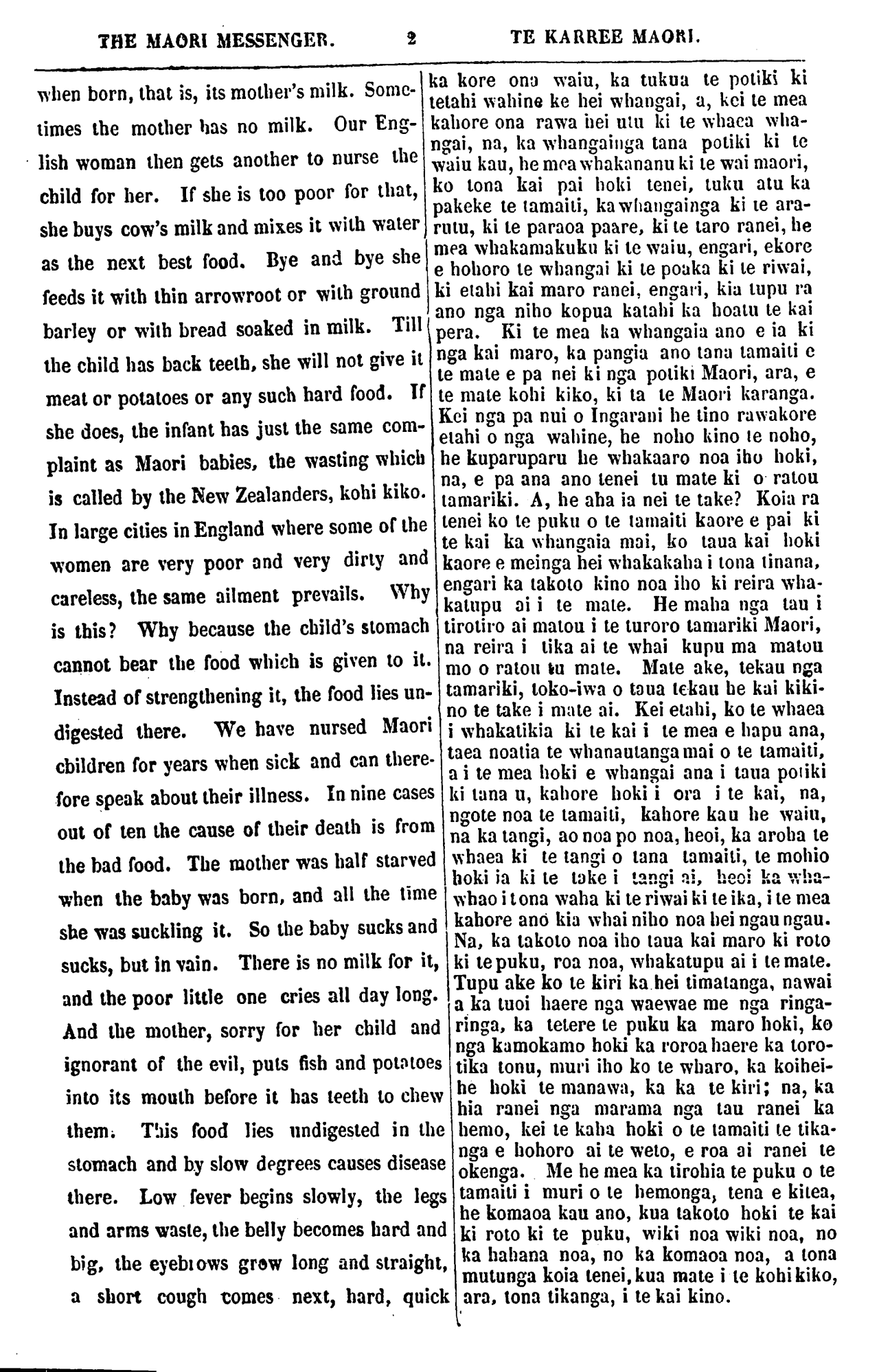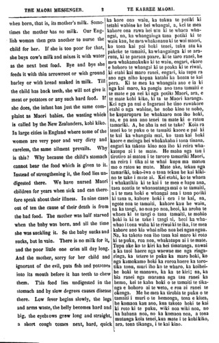 THE MAORI MESSENGER. TE KARERE MAORI. VOL. VI.] AUCKLAND, AUGUST 15, 1859. AKARARA, AKUHATA 15, 1859. [No. 17. HINTS FOR THE MAORI PEOPLE. CHAPTER II. But it is not only the women who suffer from want of good food. Some of them are strong enough still to bear many chil- dren. Again and again we have heard Maori women number up on their fingers the chil- dren they have had. But it ends with the same sad words always, " they are dead." Perhaps out of six or seven children born alive five are dead, or four. Now why is this? It is not the common lot of infants thus to die? It is not so in other countries. It may be pre- vented in New Zealand. The main cause of the death both of babies and of older chil- dren is from bad food when they are weaned. God has provided the fit food for the infant KUPU WHAKAMAHARAHARA I NGA TANGATA MAORI. UPOKO 2. Otira, ehara i te mea ko nga wahine anake e mate ana i te kore kai pai mana. E kaha ana ano etahi o ratou, e whanau ano he tamariki mana. muha noa iho. Ko tenei, whanau hoki, ka pehea? Ina hoki te noho i te ao maori. Kua whakarongo atu matou ki ta tenei wahine Maori ki ta tera wahine Maori ka tatau i runga nga matikara o tona ringaringa, ko nga tamariki i whanau i a ia, engari, ko te mutunga tonu tenei, Kua mate- mate. Ina te whakaaroha! Kei etahi ka tokowhitu pea i whanau ora mai, toko- wha tokorima kua mate. Na, he aha ra te take i penei ai nga tamariki te matemate? Kahore i penei ki etahi whenua, a ka taea ano hoki te mea kia kaua hoki e penei ki Niu Tirani nei. Ko te tino take i matemate ai nga potiki me nga tamariki Maori, he kai kino i te mea e whakamutumutu ana te ngote ki te u o te whaea. Kua whakaritea e Te Atua he kai pai ma te potiki i tona whanautanga, koia ra hoki ko te waiu o tona whaea. He mea ano ra ia kahore he waiu o te whaea, na, ka pera te wahine Pakeha