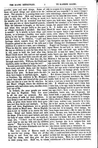 THE MAORI MESSENGER. 4 TE KARERE MAORI. powder, guns and such things. Some of these are good things and much to be de- sired. The mistake is in pulling these sour- ces of wealth first. Men and women are alike in this, they will be willing to work for months and live on wretched food that they may get two or three hundred pounds. Then the schooner is bought, or the horse, and when they are got safely to the port or village everybody is satisfied. But what is wealth? Is it wealth to have ships and horses, or to become a healthy race multi- plying in the land? The greatest wealth a man can have is his children, "a gift and heritage which cometh from the Lord." Treasure gained at the cost of his wife and children is a curse to a man, not a blessing. When he dies his name perishes with him. He has no children to care for him when he is old, none to hold the land after him. Maori Chiefs know this and are sad enough when one by one their little ones die off, and yet it is not God's will that they die, but through man's folly. Will you, the Chiefs and teachers, make no effort to stop the evil? In some parts near the East Cape, the people have cows, and milk them, and the women make large loaves of bread. They bake them in iron pots. In those parts the chil- dren have began to multiply again. Again, at Otawhao, the children in Mr. Morgan's school have milk and bread all the year and only one dies in a year for 84 who live. In the Maori villages, where the children eat potatoes only and rotten corn, one dies every year out of 34. In Ireland, the poor people are worse fed than in England. They live near- ly all the year on potatoes. But they have plenty of milk for their children. A man keeps a cow and feeds the little ones on milk, or gives them butter with their pota- toes and they thrive and multiply. In Eng- land and here, Englishmen are as greedy after wealth as Maori men. But an English- man is not so foolish as to starve his chil- dren. Bread and butter, bread and milk for them. If he is very poor indeed, and asks for help of some richer man, his words al- ways are, " I don't care for myself, but I can't bear to see my wife and my children starve." That is to say, if he is an honest, sober man, of course drunkards care for no- body but themselves. The very birds of Heaven leach us to care for our young. They are all day flying to and from the nest to gather food for them, and they give the best to their young ones. Shall we, to whom whi te tangata ki te taonga, a ka rongo tana wahine me ana tamariki i te mate i runga i tana whiwhinga, ehara tenei i te whiwhi pai, engari hei he tena hei kino mona. Kei tona ra e haere atu ai ia i te ao, ngaro atu ia ngaro atu hoki tona ingoa, kahore kau he tamariki hei atawhai i a ia i tona koroheke- tanga, hei pupuri hoki i te whenua i muri i a ia. E mohio ana ano nga Rangatira Maori ki tenei mea, a pouri noa iho hoki ratou i te ngaro haere o nga tamariki ki te male, otira ehara i Te Atua nana i mea kia mate ratou. huatu na te kuare ano na te wha- kaaro kore o te tangata. Ekore koia koutou nga Rangatira me nga kai whaka; ko Maori e kimi tikanga hei whakamutu i tenei kino? Engari kei Turanga e whai kau ana nga ta- ngata Maori, he nui hoki te waiu i a ratou, a e hanga rohi ana hoki nga wahine, he kohua nei te mea hei tunu; heoi, ka toko- maha haere ano nga tamariki Maori o era wahi. Kei Otawhao hoki kei te kura o Te Mokena e kai ana nga tamariki i te waiu i nga ra katoa, taka noa te tau; na, i roto i nga tamariki 84 e ora ana, ka kotahi rawa ano ka mate i te tau kotahi. Kei te kainga Maori, kei nga wahi e kai nei nga tamariki i te riwai anake i te kaanga pirau, ka kotahi te mea ka mate i roto i nga tamariki 5 i. Kei Airana i kino iho te kai o te hunga ra- wakore i o to Ingarani rawakore, he riwai anake hoki te kai i te Raumati i te Hotoke, otira, e nui ana te waiu hei kai manga tama- riki. E whiwhi ana hoki tenei i tana kau i tana kau, a ko nga waiu ka hoatu ma nga tamariki, kahanga hoki ki te pata hei kinaki mo nga riwai; heoi, e ora pai ana ratou e tokomaha haere ana. Kei Ingarani, kei konei hoki, e pera tahi ana ano nga Pakeha me nga tangata Maori, te whai ki te taonga. Otira ekore te Pakeha e kuare ki te whaka- tiki i tana wahine i ana tamariki ki te kai, ko te kai mana, he rohi he pata, a he rohi, ko te kinaki, he waiu. Kei te tino rawakore ka tono kai ki te tangata whai taonga, ko tana kupu tonu tenei,—Me he mea ko ahau anake, he mea noa, tena ko taku wahine me aku tamariki, ka pouri rawa au ki a ratou ka mate i te hemo kai, ara, me he tangata whakaaro tika ia, kaore nei e pa ki te kai wai- piro; haunga ano ia te tangata iinu wai- piro, he nanakia rawa tera, ko tona ake tinana anake tana e whakaaro ai. Ko nga manu o te rangi e whakaako ana i a ta- tou ki tenei mea, ki te whangai i o tatou tama- riki; e mahi ana hoki ratou i te roa o te ra ki te kimi kai ma nga pi, ko nga kai pai anake hoki ka hoatu. Heoi, ko tatou kua whaka- whiwhia o Te Atua ki te ngakau mahara,