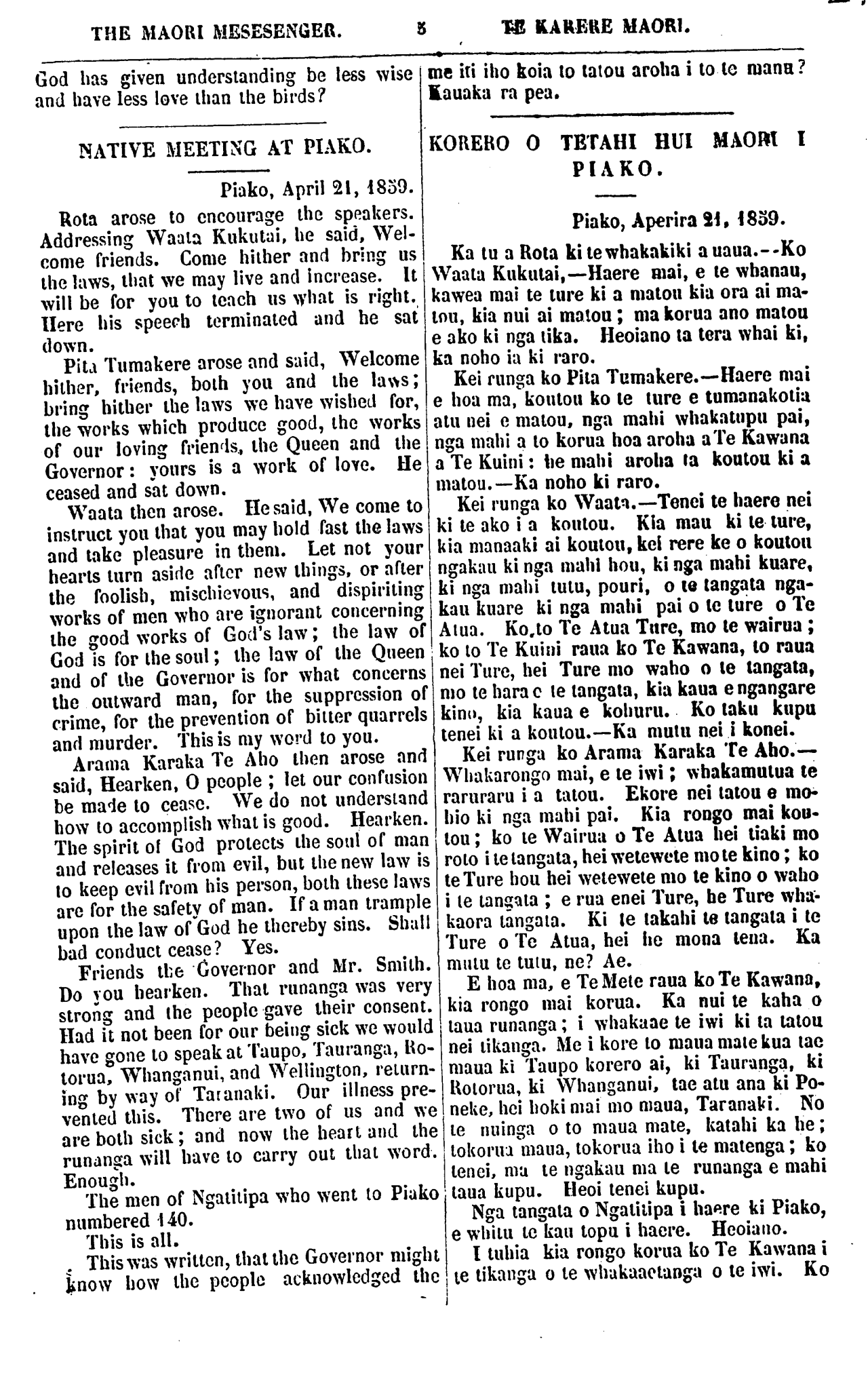 THE MAORI MESESENGER. TE KARERE MAORI. God has given understanding be less wise and have less love than the birds? NATIVE MEETING AT PIAKO. Piako, April 21, 1859. Rota arose to encourage the speakers. Addressing Waata Kukutai, he said, Wel- come friends. Come hither and bring us the laws, that we may live and increase. It will be for you to leach us what is right. Here his speech terminated and he sat down. Pita Tumakere arose and said, Welcome hither, friends, both you and the laws; bring hither the laws we have wished tor, the works which produce good, the works of our loving friends, the Queen and the Governor: yours is a work of love. He ceased and sat down. Waata then arose. He said, We come to instruct you that you may hold fast the laws and take pleasure in them. Let not your hearts turn aside after new things, or after the foolish, mischievous, and dispiriting works of men who are ignorant concerning the good works of God's law; the law of God is for the soul; the law of the Queen and of the Governor is for what concerns the outward man, for the suppression of crime, for the prevention of bitter quarrels and murder. This is my word to you. Arama Karaka Te Aho then arose and said, Hearken. 0 people; let our confusion be made to cease. We do not understand how to accomplish what is good. Hearken. The spirit of God protects the soul of man and releases it from evil, but the new law is to keep evil from his person, both these laws are for the safety of man. If a man trample upon the law of God he thereby sins. Shall bad conduct cease? Yes. Friends the Governor and Mr. Smith. Do you hearken. That runanga was very strong and the people gave their consent. Had it not been for our being sick we would have gone to speak at Taupo, Tauranga, Ro- torua, Whanganui, and Wellington, return- ing by way of Taranaki. Our illness pre- vented this. There are tvvo of us and we are both sick; and now the heart and the runanga will have to carry out that word. Enough. The men of Ngatitipa who went to Piako numbered 140. This is all. This was written, that the Governor might know how the people acknowledged the me iti iho koia to tatou aroha i to te manu? Kauaka ra pea KORERO O TETAHI HUI MAORI I PIAKO. Piako, Aperira 21. 1859. Ka tu a Rota ki te whakakiki a uaua.-Ko Waata Kukutai,—Haere mai, e te whanau, kawea mai te ture ki a matou kia ora ai ma- tou, kia nui ai matou; ma korua ano matou e ako ki nga tika. Heoiano ta tera whai ki, ka noho ia ki raro. Kei runga ko Pita Tumakere.—Haere mai e hoa ma, koutou ko te ture e tumanakotia atu nei e matou, nga mahi whakatupu pai, nga mahi a to korua hoa aroha a Te Kawana a Te Kuini: he mahi aroha ta koutou ki a matou. Ka noho ki raro. Kei runga ko Waata. Tenei te haere nei ki te ako i a koutou. Kia mau ki te ture, kia manaaki ai koutou, kei rere ke o koutou ngakau ki nga mahi hou, ki nga mahi kuare, ki nga mahi lulu, pouri. o te tangata nga- kau kuare ki nga mahi pai o te ture o Te Atua. Ko, to Te Atua Ture, mo te wairua; ko to Te Kuini raua ko Te Kawana, to raua nei Ture, hei Ture mo waho o te tangata, mo te hara e te tangata, kia kaua e ngangare kino, kia kaua e kohuru. Ko taku kupu tenei ki a koutou.—Ka mutu nei i konei. Kei runga ko Arama Karaka Te Aho.— Whakarongo mai, e te iwi; whakamutua te raruraru i a tatou. Ekore nei tatou e mo- hio ki nga mahi pai. Kia rongo mai kou- tou; ko te Wairua o Te Atua hei tiaki mo roto i te tangata, hei wetewete mo te kino; ko te Ture hou hei wetewete mo te kino o waho i te tangata; e rua enei Ture, be Ture wha- kaora tangata. Ki te takahi te tangata i te Ture o Te Atua, hei he mona tena. Ka mutu te tutu, ne? Ae. E hoa ma, e Te Mete raua ko Te Kawana, kia rongo mai korua. Ka nui te kaha o taua runanga; i whakaae te iwi ki ta tatou nei tikanga. Me i kore to maua mate kua tae maua ki Taupo korero ai, ki Tauranga, ki Rotorua, ki Whanganui, tae atu ana ki Po- neke, hei hoki mai mo maua, Taranaki . No te nuinga o to maua male, katahi ka he; tokorua maua, tokorua iho i te matenga; ko tenei, mu te ngakau ma te runanga e mahi taua kupu. Heoi tenei kupu. Nga tangata o Ngatitipa i haere ki Piako, e whitu te kau topu i haere. Heoiano. I tuhia kia rongo korua ko Te Kawana i te tikanga o te whakaaetanga o te iwi. Ko