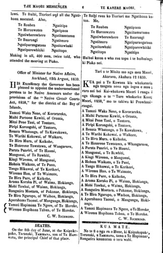 THE MAORI MESSENGER TE KARERE MAORI. laws. Te Raihi, Tioriori and all the Ngati- haua assented. Also, Te Rauhea Ngatitipa Te Horoawatea Ngatipaoa Ngatiwherewhere Ngatitumumu Te Ruarangi Ngatiteoro Ngatipurangataua Ngatitawhaki Ngatiparewhitiki Ngatitapa Making in all, 400 men, twice told, who attended the meeting at Piako. Office of Minister for Native Affairs, Auckland, 12th August, 1859. HIS Excellency the Governor has been pleased to appoint the undermentioned persons to be Native Assessors under the provisions of the " Native Circuit Courts Act, 1858," for the district of the Bay of Islands, Tamati Waka Nene, of Kororareka, Maihi Paraone Kawiti, of Orauta, Mitai Pene Taui, of Tautoro, Piripi Korongohi, of Tautoro, Renata Whatonga, of Te Kawakawa, Te Warihi Kokowai, of Waikare, Te Hira Mura, of Kaikohe, Te Hoterene Tawatawa, of Wangaruru, Parata Puariri, of Te Haumi, Mangonui, of Te Rawhiti, Kingi Wiremu, of Mangonui, Hohaia Waikato, of Te Puna, Tango Hikuwai, of Te Kerikeri, Wiremu Hau. of Te Waimate, Te Hira Pure, of Kaikohe, Arama Karaka Pi. of Waima. Hokianga, Mohi Tawhai, of Waima, Hokianga, Rangatira Moetara, of Pakanae, Hokianga, Te Hira Ngaropo, of Waihou, Hokianga, Aperahama Taonui, of Mangungu, Hokianga, Tamati Hapimana Te Ngere, of Te Horeke, Wiremu Hopihana Tahua,, of Te Horeke. C. W. RICHMOND. DEATHS. On the 8th day of June, at the Kaipako- pako, Taranaki. TAMIHANA, son of TE HAPI- MANA, the principal Chief of that place. Te Raihi raua ko Tioriori me Ngatihaua ka- toa. Me, Te Rauhea Ngatipaoa Te Horoawatea Ngatitumutumu Ngatiwherewhere Te Ruarangi Ngatiteoro Ngatipurangataua Ngatitawhaki Ngatiparewhitiki Ngatitapa Ngatitipa Huihui katoa e wha rau topu i te huihuinga ki Piako nei. Tari o te Minita mo nga mea Maori, Akarana, Akuhata 12 1859. KUA pai a Te Kawana kia whakaturia nga tangata nona nga ingoa e mau i raro nei hei Kai-whakawa Maori i runga i nga tikanga o te "Ture whakarite Kooti Maori, 1858," mo te takiwa ki Peowhaai- rangai. A Tamati Waka Nene, o Kororareka, A Maihi Paraone Kawiti, o Orauta, A Mitai Pene Taui, o Tautoro, A Piripi Korongohi, o Tautoro, A Renata Whatonga, o Te Kawakawa, A Te Warihi Kokowai, o Waikare, A Te Hira Mura, o Kaihoke, A Te Hoterene Tawatawa, o Whangaruru, A Parata Puariri, o Te Haumi, A Mangonui, o Te Rawhiti, A Kingi Wiremu, o Mangonui, A Hohata Waikato, o Te Puni, A Tango Hikuwai, o Te Kerikeri, A Wiremu Hau, o Te Waimate, A Te Hira Pure, o Kaihoke, A Arama Karaka Pi, o Waima, Hokianga, A Mohi Tawhai, o Waima, Hokianga, A Rangatira Moetara, o Pakanae, Hokianga, A Te Hira Ngaropo, o Waihou, Hokianga, A Aperahama Taonui, o Mangungu, Hoki- anga, A Tamati Hapimana Te Ngere, o Te Horeke A Wiremu Hopihana Tahua, o Te Horeke. C. W. RICHMOND. KUA MATE. No te 8 o nga ra o Hune, ki Kaipakopako, Taranaki, a TAMIHANA, tama a Te Hapimana, Rangatira kaumatua o tera wahi.