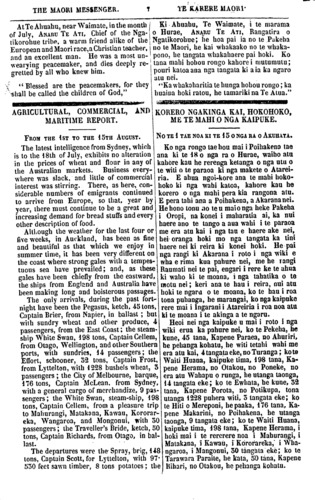 THE MAORI MESSENGER. TE KAREKE MAORI. At Te Ahuahu, near Waimate, in the month or July, ANARU TE ATI, Chief of the Nga- tikorohue tribe, a warm friend alike of the European and Maori race, a Christian teacher, and an excellent man. He was a most un- wearying peacemaker, and dies deeply re- gretted by all who knew him. "Blessed are the peacemakers, for they shall be called the children of God," AGRICULTURAL, COMMERCIAL, AND MARITIME REPORT. FROM THE 1ST TO THE 15TH AUGUST. The latest intelligence from Sydney, which is to the 18th of July, exhibits no alteration in the prices of wheat and flour in any of the Australian markets. Business every- where was slack, and little of commercial interest was stirring. There, as here, con- siderable numbers of emigrants continued to arrive from Europe, so that, year by year, there must continue to be a great and increasing demand for bread stuffs and every other description of food. Although the weather for the last four or five weeks, in Auckland, has been as fine and beautiful as that which we enjoy in summer time, it has been very different on the coast where strong gales with a tempes- tuous sea have prevailed; and, as these gales have been chiefly from the eastward, the ships from England and Australia have been making long and boisterous passages. The only arrivals, during the past fort- night have been the Pegasus, ketch, 45 tons, Captain Brier, from Napier, in ballast; but with sundry vvheat and other produce, 4 passengers, from the East Coast; the steam- ship While Swan, 198 tons, Captain Cellem, from Otago, Wellington, and other Southern ports, with sundries, 14 passengers; the Effort, schooner, 52 tons, Captain Frost, from Lyttelton, with 1228 bushels wheat, 5 passengers; the City of Melbourne, barque, 176 tons, Captain McLean. from Sydney, with a general cargo of merchandize, 9 pas- senges; the White Swan, steam-ship, 198 tons, Captain Cellem, from a pleasure trip to Mahurangi, Matakana, Kawau, Kororar- eka, Wangaroa, and Mongonui, with 50 passengers; the Traveller's Bride, ketch, 50 tons, Captain Richards, from Otago, in bal- last. The departures were the Spray, brig, 148 tons, Captain Scott, for Lyttelton, with 97 530 feet sawn timber, 8 tons potatoes; the Ki Ahuahu, Te Waimate, i te marama o Hurae, ANARU TE ATI, Rangatira o Ngatikorohue; he hoa pai ia no te Pakeha no te Maori, he kai whakaako no te whaka- pono, he tangata whakahaere pai hoki. Ko tana mahi hohou rongo kahore i mutumutu; pouri katoa ana nga tangata ki aia ka ngaro atu nei. "Ka whakaharitia te hunga hohou rongo; ka huaina hoki ratou, he tamariki na Te Atua." KORERO NGAKINGA KAI, HOKOHOKO, ME TE MAHI O NGA KAIPUKE. NO TE 1 TAE NOA KI TE 15 O NGA RA O AKUHATA. Ko nga rongo tae hou mai i Poihakena tae ana ki te 18 o nga ra o Hurae, waiho atu kahore kau he rerenga ketanga o nga utu o te witi o te paraoa ki nga makete o Atarei- ria. E ahua ngoi-kore ana te mahi hoko- hoko ki nga wahi katoa, kahore kau he korero o nga mahi pera kia rangona atu. E pera tahi ana a Poihakena, a Akarana nei. He hono tonu ao te u mai o nga heke Pakeha i Oropi, na konei i maharatia ai, ka nui haere ano te tango a aua wahi i te paraoa me era atu kai i nga tau e haere ake nei, hei oranga hoki mo nga tangata ka tini haere nei ki reira ki konei hoki. He pai nga rangi ki Akarana i roto i nga wiki e wha e rima kua pahure nei, me he rangi Raumati nei te pai, engari i rere ke te ahua ki waho ki te moana, i nga tahatika o te motu nei; keri ana te hau i reira, nui atu hoki te ngaru o te moana, ko te hau i roa tona puhanga, he marangai, ko nga kaipuke rere mai i Ingarani i Atareiria i roa noa atu ki te moana i te akinga a te ngaru. Heoi nei nga kaipuke u mai i roto i nga wiki erua ka pahure nei, ko te Pekeha, he kune, 45 tana, Kapene Paraea, no Ahuriri, he pehanga kohatu, he witi tetahi wahi me era atu kai, 4 tangata eke, no Turanga; kote Waiti Huana, kaipuke lima, 198 tana, Ka- pene Herama, no Otakou, no Poneke, no era atu Wahapu o runga, he utanga taonga, 14 tangata eke; ko te Ewhata, he kune, 52 tana, Kapene Porota, no Potikupa, tona utanga 1228 puhera witi, 5 tangata eke; ko te Hiti o Mereponi, he paaka, 176 tana, Ka- pene Makarini, no Poihakena, he utanga taonga, 9 tangata eke; ko te Waiti Huana, kaipuke tima, 198 tana, Kapene Herama, i hoki mai i te rererere noa i Mahurangi, i Matakana, i Kawau, i Kororareka, i Wha- ngaroa, i Mangonui, 30 tangata eke; ko te Tarawara Paraite, he kata, 50 tana, Kapene Rihari, no Otakou, he pehanga kohatu.