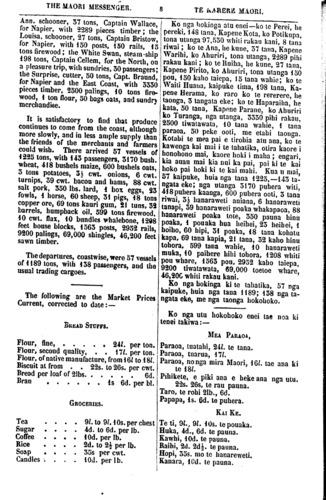 THE MAORI MESSENGER. TE KARERE MAORI. Ann. schooner, 37 tons, Captain Wallace, for Napier, with 2289 pieces timber; the Louisa, schooner, 27 tons, Captain Bristow, for Napier, with 150 posts. I50 rails, 15 tons firewood; the White Swan, steam-ship 198 tons, Captain Cellem, for the North, on a pleasure trip, with sundries, 30 passengers; the Surprise, cutter, 50 tons, Capt. Braund, for Napier and the East Coast, with 3350 pieces timber, 2500 palings, 10 tons fire- wood, 1 ton flour, 50 bags oats, and sundry merchandise. It is satisfactory to find that produce continues to come from the coast, although more slowly, and in less ample supply than the friends of the merchants and farmers could wish. There arrived 57 vessels of 1225 tons, with 143 passengers, 3 i 70 bush. wheat, 418 bushels maize, 600 bushels oats, 3 tons potatoes, 3½ cwt. onions, 6 cwt. turnips, 39 cwt. bacon and hams, 88 cwt. salt pork, 350 Ibs. lard, 1 box eggs, 33 fowls, 1 horse, 60 sheep, 31 pigs, 18 tons copper ore, 69 tons kauri gum, 21 tuns, 33 barrels, humpback oil, 599 tons firewood, 10 cwt. flax, 10 bundles whalebone, 1298 feel house blocks, 1563 posts, 2952 rails, 9200 palings, 69, 000 shingles, 46, 200 feet sawn timber. The departures, coastwise, were 57 vessels of 1189 tons, with 138 passengers, and the usual trading cargoes. The following are the Market Prices Current, corrected to dale: BREAD STUFFS. FIour, fine, ..... 241 per ton. Flour, second quality, . . 171. per ton. Flour, of native manufacture, from 161 to 181. Biscuit at from . . 22s. to 26s. per cwt. Bread per loaf of 21bs. ..... 6d. Bran ...... 1s 6d. per bl. GROCERIES. Tea .... 91. to 91.10s. per chest Sugar .... 4d. to 6d. per Ib. Coffee . . . . lOd. per Ib. Rice . . . . 2d. to 2½ per Ib. Soap .... 35s per cwt. Candles . . . . lOd. perlb. Ko nga hokinga atu enei—ko te Perei, he pereki, 148 tana, Kapene Kota, ko Potikupa, tona utanga 97.530 whiti rakau kani, 8 tana riwai; ko te Ana, he kune, 57 tana, Kapene Warihi, ko Ahuriri, tona utanga, 2289 pihi rakau kani; ko te Ruiha, he kune, 27 tana, Kapene Pinto, ko Ahuriri, tona utanga 150 pou, 150 kaho taiepa, 15 tana wahie; ko te Waiti Huana, kaipuke tima, 198 tana, Ka- pene Herama, ko raro ko te rererere, he taonga, 5 tangata eke; ko te Haparaiha, he kata, 50 tana, Kapene Parane, ko Ahuriri ko Turanga, nga utanga, 3550 pihi rakau, 2500 tiwatawata, 10 tana wahie, 1 tana paraoa, 50 peke ooti, me etahi taonga. Kotahi te mea pai e tirohia atu ana, ko te kawenga kai mai i te tahatika, otira kaore i honohono mai, kaore hoki i maha; engari, kia auau mai kia nui ka pai, pai ki te kai hoko pai hoki ki te kai mahi. Kua u mai, 57 kaipuke, huia nga tana 1225,—143 ta- ngata eke; nga utanga 5170 puhera witi, 418 puhera kaanga, 600 puhera ooti, 3 tana riwai, 3½ hanaraweti aniana, 6 hanaraweti tanapi, 39 hanaraweti poaka whakapaoa, 88 hanaraweti poaka tote, 350 pauna hinu poaka, 1 pouaka hua heihei, 23 heihei, 1 hoiho, 60 hipi, 31 poaka, 18 tana kohatu kapa, 69 tana kapia, 21 tana, 32 kaho hinu tohora, 599 tana wahie, 10 hanaraweti muka, 10 paihere hihi tohora, 1208 whiti pou whare, 1563 pou, 2952 kaho taiepa, 9200 tiwatawata, 69, 000 toetoe whare, 46, 200 whiti rakau kani. Ko nga hokinga ki te tahatika, 57 nga kaipuke, huia nga tana 1189; 138 nga ta- ngata eke, me nga taonga hokohoko. Ko nga utu hokohoko enei tae noa ki tenei takiwa:— MEA PARAOA, Paraoa, tuatahi, 241 te tana. Paraoa, tuarua, 171. Paraoa, no nga mira Maori, 161. tae ana ki te 181. Pihikete, e piki ana e heke ana nga utu. 22s. 26s, te rau pauna. Taro, te rohi 2Ib., 6d. Papapa, Is. 6d. te puhera. KAI KE. Te ti, 91. 91. 10s. te pouaka. Huka, 4d., 6d. te pauna. Kawhi, lOd. te pauna. Raihi, 2d. 2d½. te pauna. Hopi, 35s. mo te hanaraweti. Kanara, lOd. te pauna.