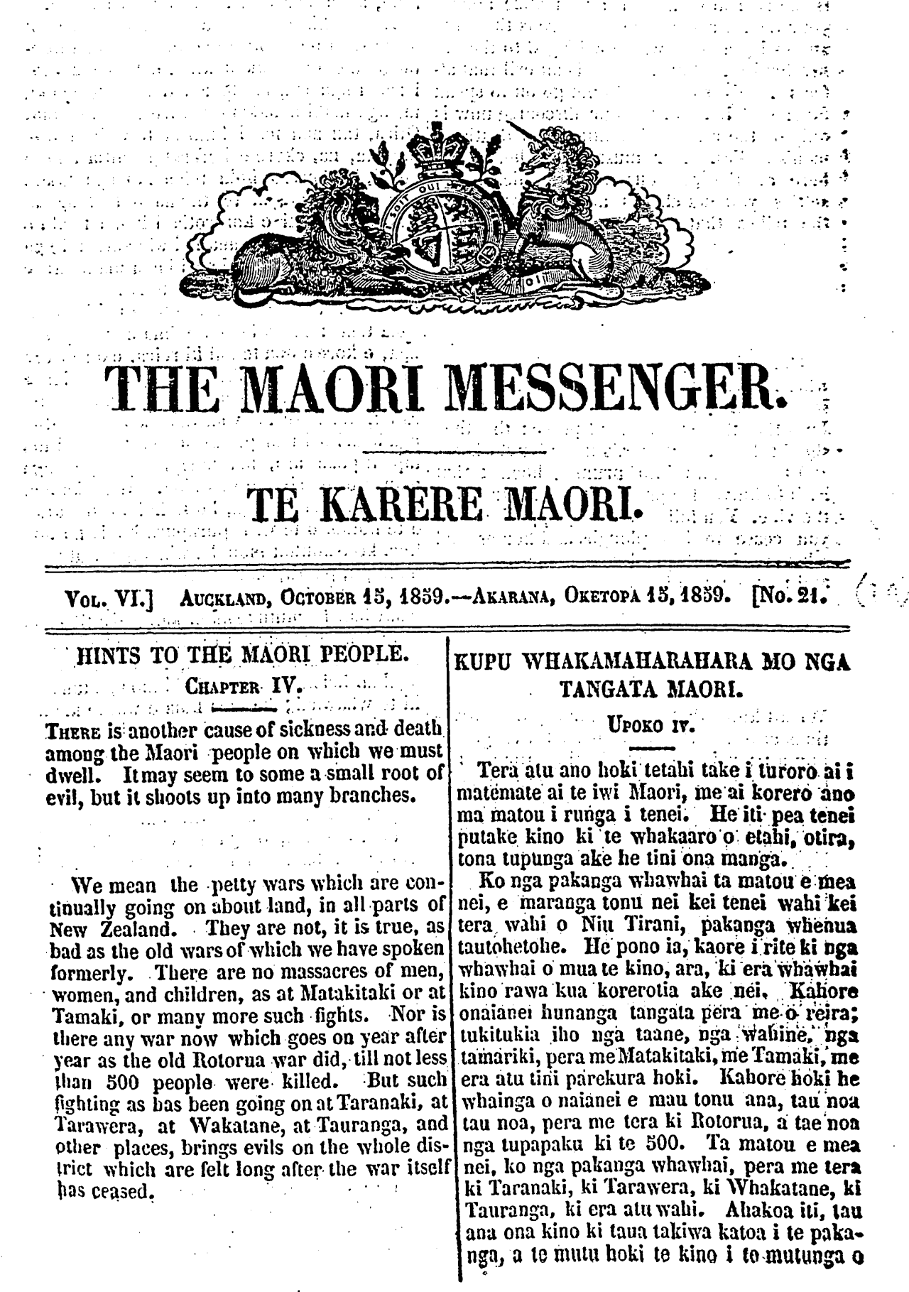 The Maori Messenger - Ko te Karere Maori 1855-1860: Volume 6, Number 21. 15 October 1859 |