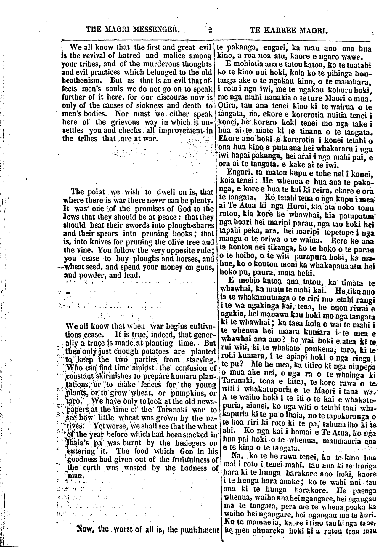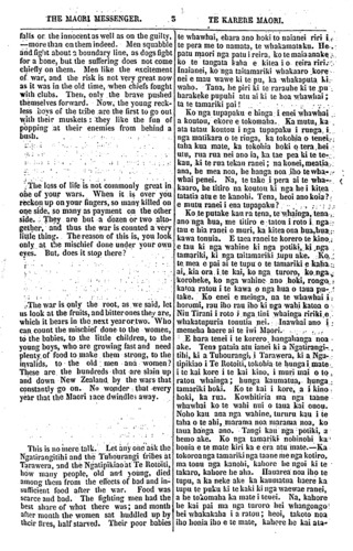 THE MAORI MESSENGER TE KARERE MOM. VOL. VI] AUCKLAND, OCTOBER 15, 1859. AKARANA, OKETOPA IS. 1859. [No. 21, HINTS TO THE MAORI PEOPLE. CHAPTER IV. THERE is another cause of sickness and death among the Maori people on which we must dwell. It may seem to some u small root of evil, but it shoots up into many branches. We mean the petty wars which are con- tinually going on about land, in all parts of New Zealand. They are not, it is true, as bad as the old wars of which we have spoken formerly. There are no massacres of men, women, and children, as at Matakitaki or at Tamaki, or many more such fights. Nor is there any war now which goes on year after year as the old Rotorua war did, till not less than 500 people were killed. But such fighting as has been going on at Taranaki, at Tarawera, at Wakatane, at Tauranga, and other places, brings evils on the whole dis- trict which are felt long after the war itself has ceased. KUPU WHAKAMAHARAHARA MO NGA TANGATA MAORI. UPOKO IV. Tera atu ano hoki tetahi take i turoro ai i matemate ai te iwi Maori, me ai korero ano ma matou i runga i tenei. He iti pea tenei putake kino ki te whakaaro o etahi, otira, tona tupunga ake he tini ona manga. Ko nga pakanga whawhai ta matou e mea nei, e maranga tonu nei kei tenei wahi kei tera wahi o Niu Tirani, pakanga whenua tautohetohe. He pono ia, kaore i rite ki nga whawhai o mua te kino, ara, ki era whawhai kino rawa kua korerotia ake nei, Kahore onaianei hunanga tangata pera me o reira; tukitukia iho nga taane, nga wahine. nga tamariki, pera me Matakitaki, me Tamaki, me era atu tini parekura hoki. Kahore hoki he whainga o naianei e mau tonu ana, tau noa tau noa, pera mo tera ki Rotorua. a tae noa nga tupapaku ki te 500. Ta matou e mea nei, ko nga pakanga whawhai, pera me tera ki Taranaki, ki Tarawera, ki Whakatane, ki Tauranga, ki era atu wahi. Ahakoa iti, tau ana ona kino ki taua takiwa katoa i te paka- nga, a te mutu hoki te kino i to mutunga o