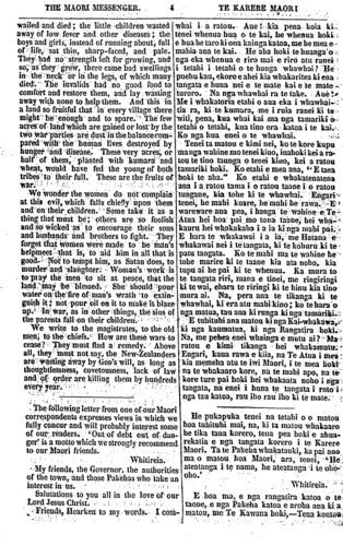 THE MAORI MESSENGER. TE KARERE MAORI waited and died; the little children wasted away of low fever and other diseases; the boys and girls, instead of running about, full of life, sat thin, sharp-faced, and pale They had no strength left; for growing, and so, as they grew, there came bad swellings in the neck or in the legs, of which many died. The invalids had no good food to comfort and restore them, arid lay wasting away with none to help them. And this in a land so fruitful that in every village there might be enough and to spare. The few acres of land which are gained or lost by the two war parties are dust in the balance com- pared with the human lives destroyed by hunger and disease. These very acres, or half of them, planted With kumara and wheat, would have fed the young of both tribes to their full. These are the fruits of war. We wonder the women do not complain at this evil, which falls chiefly upon them and on their children. Some take it as a thing that must be; others are so foolish and so wicked as to encourage their sons and husbands' and brothers to fight. They forget that women were made to be man's help meet that is, to aid him in all that is good. Not to tempt him, as Satan does, to murder and slaughter. Woman's work is to play the men to sit at peace, that the land may be blessed. She should pour water on the fire of: man's wrath to extin- guish it; not pour oil on it to make it blaze up. In war, as in other things, the sins of the parents fall on their children. We write to the magistrates, to the old men, to the chiefs. How are these wars to cease? They must find a remedy. Above all, they must not say, the New-ZeaIanders are wasting away by GOD'S will, as long as thoughtlessness, covetousness, lack of law and. of order are killing them by hundreds everyyear. The following letter from one of our Maori correspondents expresses views in which we fully concur and will probably interest some of our: readers. ' Out of debt out of dan- ger' is a motto which we strongly recommend to our Maori friends. Whitireia. - My friends, the Governor, the authorities of the town,; and those Pakehas who lake an interest in us. Salutations to you all in the love of our Lord Jesus Christ. Friends, Hearken to my words. I com- whai i a ratou. Aue! kia pena koia ki tenei whenua hua o te kai, he whenua hoki e hua he taro ki ona kainga katoa, me he mea e mahia ana te kai. He aha hoki te huanga o nga eka whenua e riro mar e riro atu ranei - i tetahi i tetahi o te hunga whawhai? He puehu kau, ekore e ahei kia whakaritea ki ena tangata e huna nei e te mate kai e te mate turoro. Na nga whawhai ra te take. Aue Me i whakatoria etahi o aua eka i whawhai tia ra, ki te kumara, me i ruia ranei ki ta witi, pena, kua whai kai ma nga tamariki o tetahi o tetahi, kua tino ora katoa i te kai. Ko nga hua enei o te whawhai. Tenei ta matou e kimi nei, ko te kore kupu manga wahine mo tenei kino, inahoki kei a ra- tou te tino taunga o tenei kino, kei a ratou tamariki hoki. Ko etahi e mea ana, " E taea hoki te aha." Ko etahi e whakatenatena ana i a ratou tama i o ratou taane i o ratou tungane, kia tohe ki te whawhai. Engari tenei, he mahi kuare, he mahi he rawa. wareware ana pea, i hanga te wahine e Te Atua hei hoa pai. mo tona taane, hei wha- kauru hei whakakaha i a ia ki nga mahi pai. E hara te whakawai ia ia, me Hatana e whakawai nei i te tangata, ki te kohuru ki te patu tangata. Ko te mahi ma te wahine he tohe marire ki te taane kia ata noho, kia tupu ai he pai ki te whenua. Ka mura to te tangata riri, mana e tinei, me ringiringi ki te wai, ehara te riringi ki te hinu kia tino mura ai. Na, pera ana te tikanga ki te whawhai, ki era atu mahi kino; ko te hara o nga matua, tau ana ki runga ki nga tamariki. - E tuhituhi ana matou ki nga Kaiwhakawa ki nga kaumatua, ki nga Rangatira hoki Na, me pehea enei whainga e mutu ai? Ma ratou e kimi tikanga hei whakamutu. Engari, kaua rawa e kiia, na Te Atua i mea kia memeha atu te iwi Maori, i te mea hoki na te whakaaro kore, na te mahi apo, na te kore ture pai hoki hei whakaata noho i nga: tangata, na enei i huna te tangata i roto i nga tau katoa, rau iho rau iho ki te mate. He pukapuka tenei na tetahi o o matou hoa tuhituhi mai, na, ki ta matou whakaaro he tika tana korero, tena pea hoki e ahua- rekatia e nga tangata korero i te Karere Maori. Tale Pakeha whakatauki, ka pai ano ma o matou hoa Maori, ara, tenei, He. ateatanga i te nama, he meatanga i te oho Whitireia. E hoa ma, e nga rangatira katoa o te taone, e nga Pakeha katoa e aroha ana ki a. matou, me Te Kawana hoki,—Tena koutou