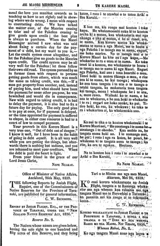 THE MAORI MESSENGER TE KARERE MAORI. mead the love you manifest towards us in teaching us how to act rightly and in shew- ing where we do wrong. I mean with respect to contracting debts. We have talked the matter over, of the Maories ceasing to take and of the Pakehas ceasing to give goods upon credit; the best plan is always to purchase. When the Maori Messenger arrived I saw; what was said about fixing a certain day for the pay- ment of a debt, but my word to you is,— Let the credit system cease altogether, and let the Pakehas give no goods to the Maories upon credit. The credit system may be all very well for the Pakehas; let them follow their own old road. The system pursued by us in former times with respect to persons getting goods from others, which was much the same as taking credit, was this. If a man got property from another, and, instead of paying him, used what should have been the payment for some other purpose, he was bewitched and would die in consequence. Now with regard to taking credit, it is bad to delay the payment, it is also bad to fix a future day for paying. The only good plan is to pay at once, for if payment is delayed, or the time appointed for payment is suffered to elapse, in either case resource is had to a court of law to compel payment. Your proverb in this Karere Maori is a very true one, " Out of debt out of danger." I know it well, for I have been in the habit of going in debt myself. It is all very well while you are gelling the things, but after- wards there is nothing but sadness, and you are ashamed to meet your creditors. When the debt is paid the heart is light. From your friend in the grace of our Lord Jesus Christ, • NEPE NGAKAU. Office of Minister of Native Affairs, Auckland, 26th May, 1859. THE following Reports by Josiah Flight, Esquire, one of the Commissioners of Native Reserves for the Province of Tara- naki, are published for general information. C. W. RICHMOND. REPORT BY JOSIAH FLIGHT, ESQ., OF THE PRO- VINCE OF TARANAKI, UNDER THE "NEW ZEALAND NATIVE RESERVES' ACT, 1856." Reserve No. 2. The Natives whose names are given below, having the sole right to one hundred and fifty acres of this Reserve, and they being katoa, i roto i te atawhai o to tatou Ariki; o Ihu Karaiti. E hoa ma, kia rongo mai koutou i taku kupu. He whakamoemiti naku ki to koutou areha ki a matou, kua whakaaturia mai nga tikanga e tika ai matou, e; he ai ranei, ara. te: nama. Kua korero matou kia whaka- mutua te nama a nga Maori, me te hoatu a nga Pakeha i te taonga mo te nama, engari me hoko marire. No te taenga mai o te Karere Maori ka kite au i nga kupu,— Me whakarite te ra e utua: ai te nama. Ko taku tenei ki a koutou, me whakamutu te hoatu i te taonga mo te nama ki nga Maori. Engari nga Pakeha, kati ano i tona huarahi o mua. Tenei hoki ta matou tikanga, o mua, e rite ana ki te nama, he kai taonga; whakaputa ke ana taua tangata i te utu o te taonga o tetahi tangata, ka makuturia: taua tangata kai taonga, mona i whakaputa ke i te utu, a. mate rawa. Waihoki ko te. nama, e he ana te whakaroa, e he ana hoki te whakarite i te ra; engari me hoko anake, ka pai. Ti- tiro hoki, ka roa, kaiwhakawa; ka taka te ra i whakaritea ai, ka: whakawakia ano. Ka nui te tika o ta koutou whakatauki i te Karere Maori nei, " He meatanga i te nama he ateatanga i te ohooho." Kua mohio au, he tangata nama hoki au. lie namanga mai, he pai; i roto i nga ra katoa, he pouri, he whakama ki te tangata nona te taonga; ka rite,ka ora. te ngakau. Heoiano. Na to koutou hoa i roto i te atawhai o te Ariki o Ihu Karaiti, Na NEPE NGAKAU. Tari o te Minita mo nga mea Maori, Akarana, Mei 26, 1859 KO enei korero whakaatuatu na Josiah flight, tangata o te Runanga whaka- rite mo nga whenua kua rahuitia mo nga tangata Maori mo te Porowhini o Taranaki ka panuitia nei kia rongo ai te tokomaha katoa. KORERO WHAKAATUATU NA JOSIAH FLIGHT O TE POROWHINI O TARANAKI, I RUNGA I NGA TIKANGA O TE, "TURE MO NGA WHENUA RAHUI MO. NGA MAORI, NIU TIRANI, 1856 Whenua Rahui, No. 2. Ko nga tangata Maori nona nga ingoa