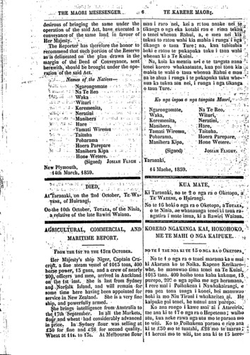 THE MAORI MESESENGER. 6. TE KARERE MAORI. desirous of bringing the same under the operation of the said Act, have executed a conveyance of the same land in favour of Her Majesty. : The Reporter has therefore the honor to recommend that such portion of the Reserve as is delineated on the plan drawn in the margin of the Deed of Conveyance, sent herewith, should be brought under the ope- ration of the, said Act. — Names of, the Natives— Ngarongomate Na Te Reo Waka Wituri Keremenita Neratini Manihera Hare Tamati Wiremu Taituha Poharama Hoera Parepare: Manihera Kipa Hone Wetere. (Signed) JOSIAH FLIGHT New Plymouth, 14th March. 1859. DIED. At Taranaki, on the 2nd October, TE WA- TENE, of Huirangi. On the 10th October, TOTAEA, of the Ninia, a relative of the late Rawiri Waiaua. AGRICULTURAL, COMMERCIAL, AND MARITIME REPORT. FROM: THE 1ST: TO. THE 15TH OCTOBER. •Her Majesty's ship Niger, Captain Cra- croft, a fine; steam vessel of 1013 tons. 400 horse power, 13 guns, and a crew of nearly 200 officers and men, arrived in Auckland on the 1st inst. She is last from Sydney and Norfolk Island, and will remain for some time here having been appointed for service in. New Zealand. She is a very fine ship, and powerfully armed. She brings intelligence from Australia to the 17th September. In all the Markets, flour and wheat had considerably advanced in price. In Sydney flour was selling at 150 for, fine and £28, for second quality. Wheat at 11s. to 13s. At Melbourne flour mau i raro nei, kei a ratou anake nei te tikanga o nga eka kotahi rau e rima tekau o tenei whenua Rahui, a, e mea nei kia tukua to ratou wahi kia mahia i runga i nga tikanga o taua Ture; na, kua tuhituhia hoki e ratou te pukapuka tuku i taua wahi whenua ki a -Te Kuini. Na, koia ka meatia nei e te tangata nana tenei korero whakaatuatu, kua pai tonu kia mahia te wahi o taua whenua Rahui e mau na te ahua i runga i te pukapuka tuku whe- nua ka tukua atu nei, i runga i nga tikanga o taua Ture. Ko nga ingoa o nga tangata Maori, Ngarongomate, Na Te Reo, Waka, Wituri, Keremenita, Neratini, Manihera, Hare, Tamati Wiremu. Taituha, Poharama, Hoera Parepare Manihera Kipa, Hone Wetere. (Signed) JOSIAH FLIGHT. Taranaki, 14 Maehe, 1839. KUA MATE, Ki Taranaki, no te 2 o nga ra o Oketopa, a TE WATENE, o Hui rangi. No te 16 hokio nga ra o Oketopa, a TOTAEA, o te Ninia, ae whanaunga tenei ki taua ra- ngatira i mate imua, ki a Rawiri Waiaua. KORERO NGAKINGA KAI, HOKOHOKO ME TE MAHI O NGA KAIPUKE. NO TE 1 TAE NOA KI TE 15 O NGA RA O OKETOPA, No te 1 o nga ra o tenei marama ka u mai ki Akarana ko te Naika, Kapene Kerikaro- whe, he manuwao tima tenei na Te Kuini, 1013 tana. 400 hoiho tona kaha kukume, 13, purepo, 200 o nga apiha me nga heramana, I rere mai i Poihakena i Nawhakairangi, e roa pea tona tunga i konei, hei manawao hoki ia mo Niu Tirani i whakaritea ai. He kaipuke pai tenei, he nunui ana purepo. Ko ana rongo i kawe mai ai i Atareiria; lac ana ki te 4 7 o nga ra o. Hepetema; waiho atu, kua neke rawa nga utu mo te paraoa mo to witi. Ko to Poihakena paraoa e riro ana ki te £30 mo te tuatahi, £28 mo te tuarua; 11 hereni mo te witi, tae ana ki te 13 here-