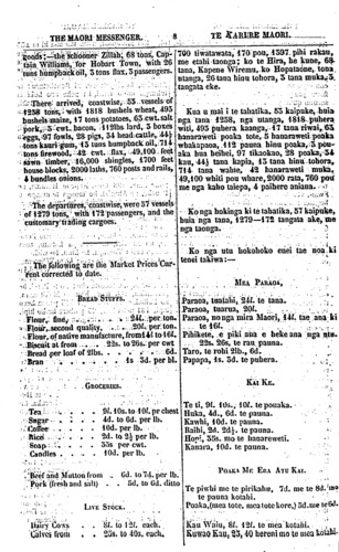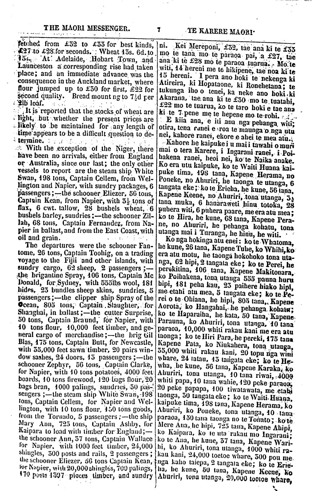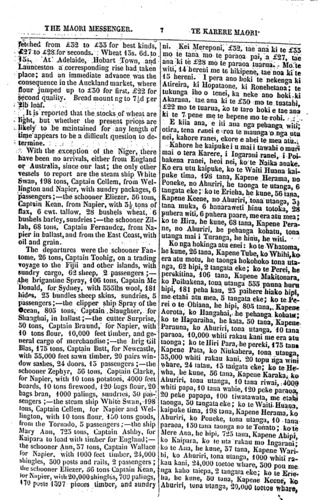 THE MAORI MESSENGER. TE KARERE MAORI fetched from £52 to £55 for best kinds, £27 to £28 for seconds. Wheat 15s. 6d. to 15s At Adelaide, Hobart Town, and Launceston a corresponding rise had taken place; and an immediate advance was the consequence in the Auckland market, where flour jumped up to £30 for first, £22 for second quality. Bread mount ng to 7½d per 2lb loaf. It is reported that the stocks of wheat are tight, but whether the present prices are likely to be maintained for any length of time appears to be a difficult question to de- termine. With the exception of the Niger, there have been no arrivals, either from England or Australia, since our last; the only other vessels to report are the steam ship While Swan, 198 tons, Captain Cellem, from Wel- lington and Napier, with sundry packages, 6 passengers; the schooner Eliezer. 56 tons, Captain Kean. from Napier, with 3½ tons of flax, 6 cwt. tallow, 28 bushels wheat, 6 bushels barley, sundries:—the schooner Zil- lah, 68 tons, Captain Fernandez, from Na- pier in ballast, and from the East Coast, with oil and grain. The departures were the schooner Fan- tome, 26 tons, Captain Toohig, on a trading voyage to the Fijii and other islands, with sundry cargo, 62 sheep, 2 passengers;— the brigantine Spray, 406 tons, Captain Mc Donald, for Sydney, with 55lbs wool, 181 hides, 23 bundles sheep skins, sundries, 5 passengers;—the clipper ship Spray of the Ocean, 803 tons, Captain Slaughter, for Shanghai, in ballast; the cutter Surprise, 50 tons, Captain Braund, for Napier, with 10 tons flour, 10, 000 feet timber, and ge- neral cargo of merchandise; the brig Gil Blas, 175 tons, Captain Butt, for Newcastle, with 53, 000 feet sawn timber, 20 pairs win- dow sashes, 24 doors, 13 passengers; the schooner Zephyr, 56 tons, Captain Clarke, for Napier, with 10 tons potatoes, 4000 feet boards, 10 tons firewood, 1 20 bugs flour, 20 bags bran, 1000 palings, sundries, 50 pas- sengers; the steam ship White Swan, 198 tons, Captain Cellem, for Napier and Wel- lington, with 10 tons flour, 150 tons goods, from the Tornado, 5 passengers; the ship Mary Ann, 725 tons, Captain Ashby, for Kaipara to load with timber for England;— the schooner Ann, 57 tons, Captain Wallace for Napier, with 1000 feet timber, 24, 000 shingles, 500 posts and rails, 2 passengers; the schooner Eliezer, 56 tons Captain Kean, for Napier, with 20, 000 shingles, 700 palings, 170 posts 1597 pieces timber, and sundry ni. Kei Mereponi, £32, tae ana ki te £33 mo te tana mo te paraoa pai, a £27, tae ana ki te £28 mo te paraoa tuarua. Mo te witi, 14 hereni me te hikipene, tae noa ki te 15 hereni. I pera ano hoki te nekenga ki Atireira, ki Hopataone, ki Ronehetana; te tukunga iho o tenei, ka neke ano hoki ki Akarana, tae. ana ki te £50 mo te. tuatahi, £22 mo te tuarua, ko te taro hoki e tae ana ki te 7 pene me te hepene mo te rohi. E kiia ana, e hi ana nga pehanga, witi; otira, tena ranei e roa te maunga o nga utu nei, kahore ranei, ekore e ahei te mea atu. Kahore he kaipuke i u mai i tawahi o muri mai o tera Karere, i Ingarani ranei, i Poi- hakena ranei, heoi nei, ko te Naika anake. Ko era utu kaipuke, ko te Waiti Huana kai- puke tima, 198 tana, Kapene Herama, no Poneke, no Ahuriri, he taonga te utanga, 6 tangata eke; ko te Erieha, be kune, 56 tana, Kapene Keene, no Ahuriri, tona utanga, 3½ tana muku, 6 hanaraweti hinu totoka, 28 puhera witi, 6 puhera paare, me era atu mea; ko te Hira, he kune, 68 tana, Kapene Pera- ne, no Ahuriri, he pehanga kohatu, tona utanga mai i Turanga, he hinu, he witi. Ko nga hokinga atu enei: ko te Whatoma, he kune, 26 tana, Kapene Tube, ko Whihi, ko era atu motu. he taonga hokohoko tona uta- nga, 62 hipi, 2 tangata eke; ko te Perei, he perekitina, 106 tana, Kapene Makitonara, ko Poihakena, tona utanga 555 pauna huru hipi, 181 peha kau, 23 paihere hiako hipi, me etahi atu mea, 5 tangata eke; ko te Pe- rei o te Ohiana, he hipi, 805 tana, Kapene Aorota, ko Hangahai,- he pehanga kohatu; ko te Haparaiha, he kata, 50 tana, Kapene Parauna, ko Ahuriri, tona utanga, 40 tana paraoa, 10, 000 whiti rakau kani me era atu taonga; ko te Hiri Para, he pereki, 175 tana Kapene Pata, ko Niukahera, tona utanga, 55, 000 whiti rakau kani, 20 topu nga wini whare, 24 tatau. 13 tangata eke; ko te He- wha, he kune, 56 tana, Kapene Karaka; ko Ahuriri, tona utanga, 10 tana riwai,: 4000 whiti papa, 10 tana wahie, I 20 peke paraoa, 20 peke papapa, 1OO tiwatawata, me etahi taonga, 50 tangata eke; ko te Waiti Huana, kaipuke tima, 498 tana, Kapene Herama, ko Ahuriri, ko Poneke, tona utanga, 10 tana paraoa, 130 tana taonga no te Tonato; ko te Mere Ana, he hipi, 723 tana, Kapene Ahipi, ko Kaipara, ko te uta rakau mo Ingarani; ko te Ana, he kune, 57 tana, Kapene Wari- hi, ko Ahuriri, tona utanga, 1000 whiti ra- kau kani, 24, 000 toetoe whare, 500 pou me nga kaho taiepa, 2 tangata eke; ko te Erie- ha, he kune, 50 tana, Kapene Keene, ko Ahuriri, tona utanga, 20, 000 toetoe whare,