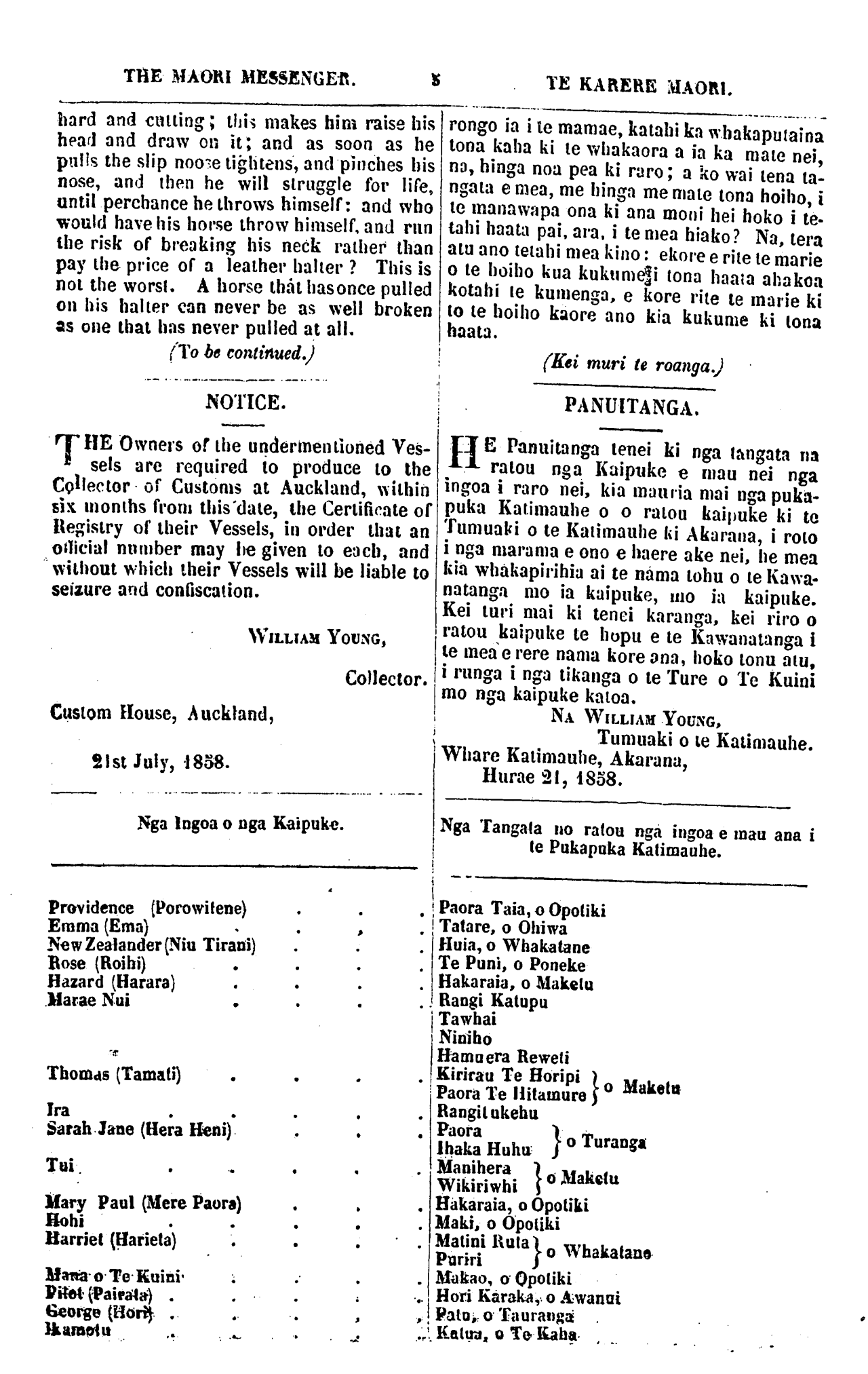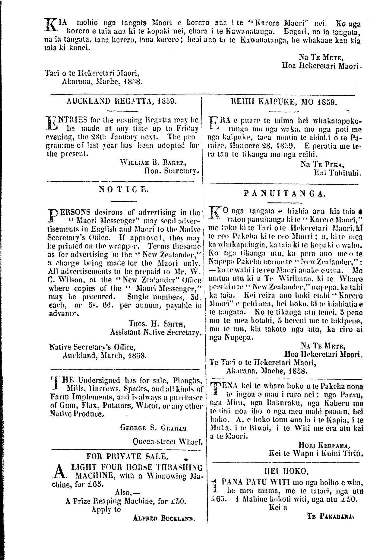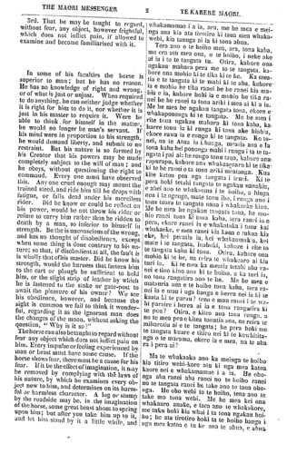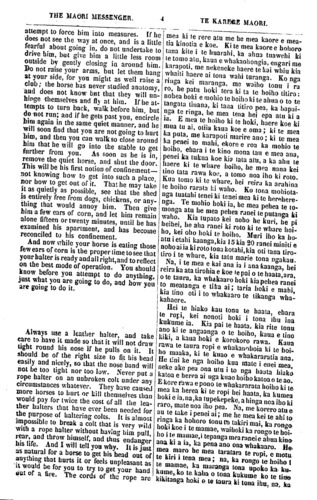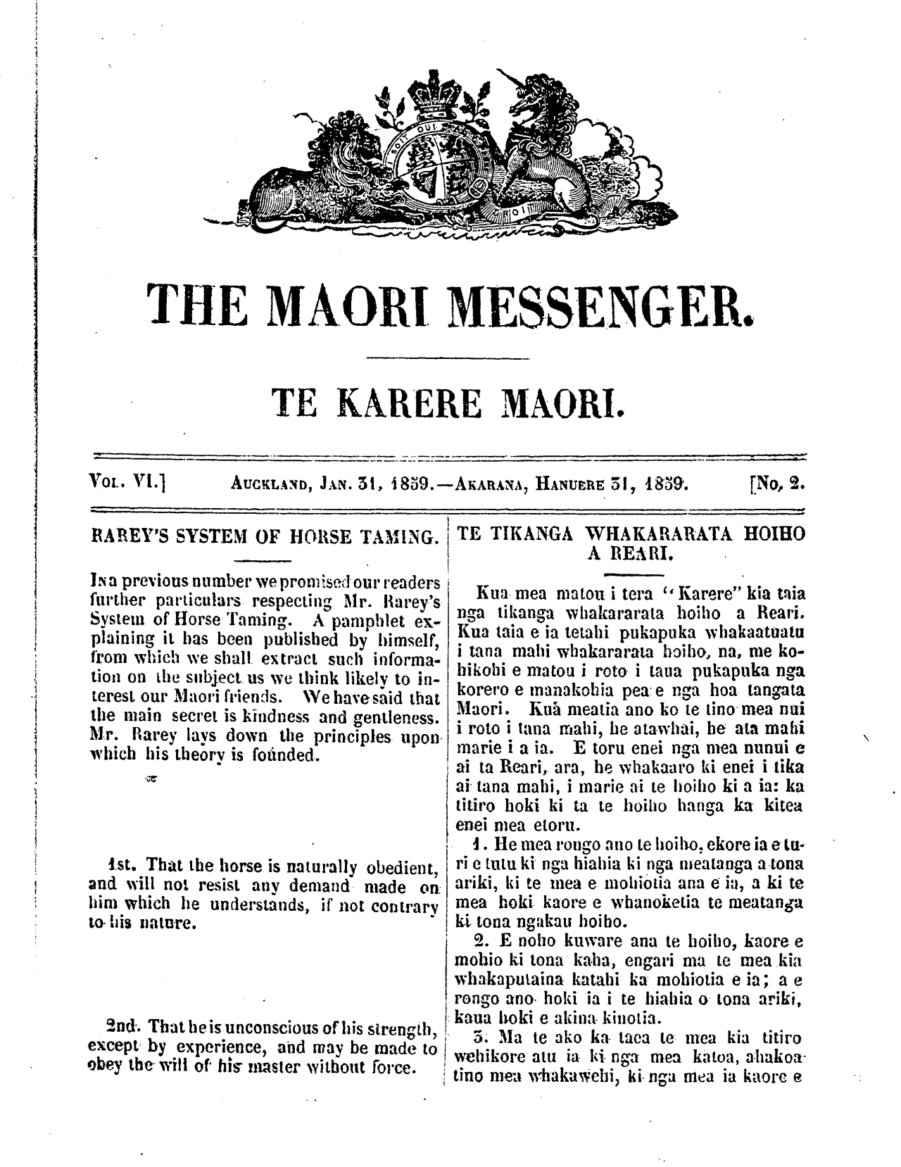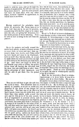 THE MAORI MESSENGER. TE KARERE MAORI. VOL. Vl.] AUCKLAND, JAN. 31, 1859. AKARANA, HANUERE 31, 1859. [No, 2. RAREY'S SYSTEM OF HORSE TAMING. IN a previous number we promised our readers further particulars respecting Mr. Rarey's System of Horse Taming. A pamphlet ex- plaining it has been published by himself, from which we shall extract such informa- tion on the subject us we think likely to in- terest our Maori friends. We have said that the main secret is kindness and gentleness. Mr. Rarey lays down the principles upon which his theory is founded. 1st. That the horse is naturally obedient, and will not resist any demand" made on him which he understands, if not contrary to his nature. 2nd. That he is unconscious of his strength, except by experience, and may be made to obey the will of his master without force. TE TIKANGA WHAKARARATA HOIHO A KEA RI. Kua mea matou i tera ''Karere" kia taia nga tikanga whakararata hoiho a Reari. Kua taia e ia tetahi pukapuka whakaatuatu i tana mahi whakararata hoiho, na, me ko- hikohi e matou i roto i taua pukapuka nga korero e manakohia pea e nga hoa tangata Maori. Kua meatia ano ko te tino mea nai i roto i tana mahi, he atawhai, he ata mahi marie i a ia. E toru enei nga mea nunui e ai ta Reari, ara, he whakaaro ki enei i tika ai tana mahi, i marie ai te hoiho ki a ia: ka titiro hoki ki ta te hoiho hanga ka kitea enei mea etoru. 1. He mea rongo .ano te hoiho, ekore ia e tu- ri e tutu ki nga hiahia ki nga meatanga a tona ariki, ki te mea e mohiotia ana e ia, a ki te mea hoki kaore e whanoketia te meatanga ki tona ngakau hoiho. 2. E noho kuware ana te hoiho, kaore e mohio ki tona kaha, engari ma te mea kia whakaputaina katahi ka mohiotia e ia; ae rongo ano hoki ia i te hiahia o tona ariki, kaua hoki e akina kinotia. 5. Ma te ako ka taea te mea kia titiro wehikore atu ia ki nga mea katoa, ahakoa tino mea whakawehi, ki nga mea ia kaore e