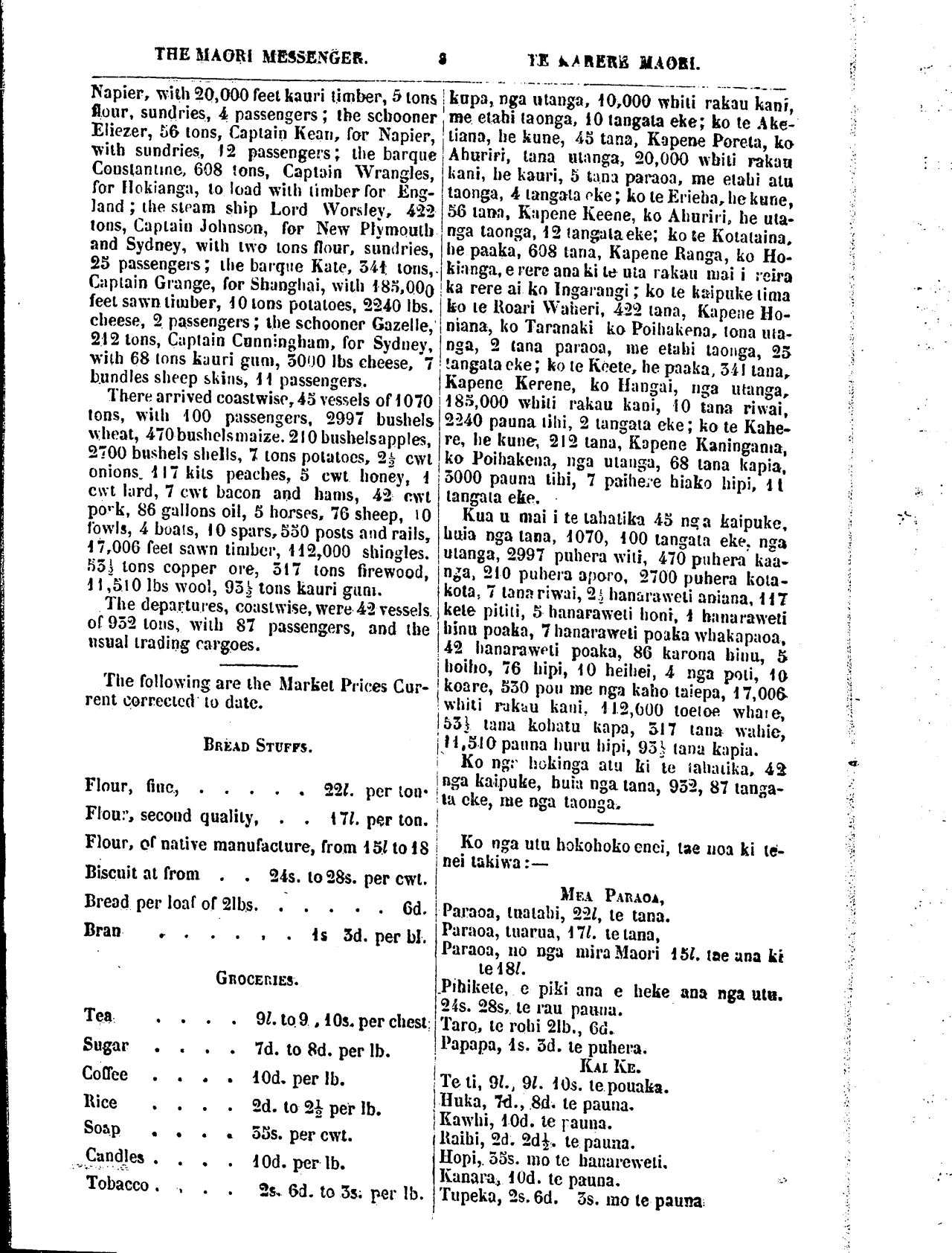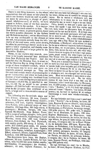 THE MAORI MESSENGER. 8 TE KARERE MAORI. Napier, with 20, 000 feel kauri timber, 5 tons flour, sundries, 4 passengers; the schooner Eliezer, 56 tons, Captain Kean, for Napier, with sundries, 12 passengers; the barque Constantine, 608 tons, Captain Wrangles, for Hokianga, to load with timber for Eng- land; the steam ship Lord Worsley, 422 tons, Captain Johnson, for New Plymouth and Sydney, with two tons flour, sundries, 25 passengers; the barque Kate, 341 tons, Captain Grange, for Shanghai, with 185,000 feel sawn timber, 10 tons potatoes. 2240 Ibs. cheese, 2 passengers; the schooner Gazelle, 212 tons, Captain Cunningham, for Sydney, with 68 tons kauri gum, 3000 lbs cheese, 7 bundles sheep skins, 11 passengers. There arrived coastwise, 45 vessels of 1070 tons, with 100 passengers. 2997 bushels wheat, 470 bushels maize. 210 bushels apples, 2700 bushels shells, 7 tons potatoes, 2½ cwt onions.117 kits peaches, 5 cwt honey, 1 cwt lard, 7 cwt bacon and hams, 42 cwt pork, 86 gallons oil, 5 horses, 76 sheep, 10 fowls, 4 boats, 10 spars, 550 posts and rails, 17, 006 feel sawn timber, 112, 000 shingles. 53½ tons copper ore, 517 tons firewood, 11, 510 Ibs wool, 95½ tons kauri gum. The departures, coastwise, were 42 vessels of 952 tons, with 87 passengers, and the usual trading cargoes. kupa, nga utanga, 10, 000 whiti rakau kani, me etahi taonga, 10 tangata eke; ko te Ake- tiana, be kune, 45 tana, Kapene Poreta, ko Ahuriri, Iana utanga, 20, 000 whiti rakau kani, he kauri, 5 tana paraoa, me etahi atu taonga, 4 tangata eke; ko te Erieha, he kane, 56 tana, Kapene Keene, ko Ahuriri, he uta- nga taonga, 12 tangata eke; kote Kotataina. he paaka, 608 tana, Kapene Ranga, ko Ho- kianga, e rere ana ki te uta rakau mai i reira ka rere ai ko Ingarangi; ko te kaipuke tima ko te Roari Waheri, 4-22 tana, Kapene Ho- niana, ko Taranaki ko Poihakena, tona ma- nga, 2 tana paraoa, me etahi taonga, 23 tangata eke; ko te Keete, he paaka, 341 tana, Kapene Kerene, ko Hangai, nga utanga, 185, 000 whiti rakau kani, IO tana riwai, 2240 pauna tihi, 2 tangata eke; ko te Kahe- re, he kune, 212 tana, Kapene Kaningama, ko Poihakena, nga manga, 68 tana kapia, 15000 pauna tihi, 7 paihere hiako hipi, 11 tangata eke. Kua u mai i te tahatika 45 nga kaipuke, huia nga tana, 1070, 100 tangata eke. nga utanga, 2997 puhera witi, 470 puhera kau- nga, 210 puhera aporo, 2700 puhera kota- kota, 7 tana riwai, 2 hanaraweti aniana, 117 kete pititi, 5 hanaraweti honi, 1 hanaraweti hinu poaka, 7 hanaraweti poaka whakapaoa, 42 hanaraweti poaka, 86 karona hinu, 5 hoiho, 76 hipi, 10 heihei, 4 nga poti, 10 koare, 530 pou me nga kaho taiepa, 17, 006 whiti rakau kaui. 112, 600 toetoe whare, 1531 tana kohatu kapa, 517 tana wahie, 11, 510 pauna huru hipi, 93½ tana kapia.