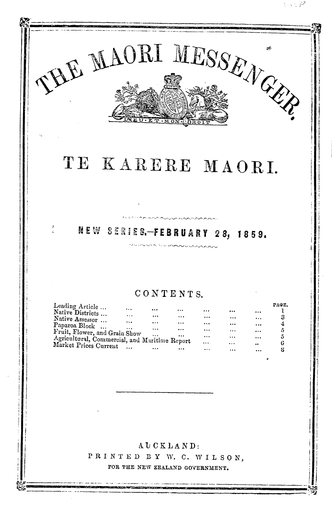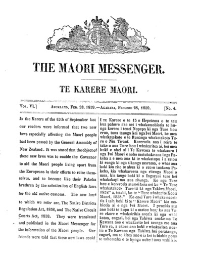 The Maori Messenger - Ko te Karere Maori 1855-1860: Volume 6, Number 4. 28 February 1859 |