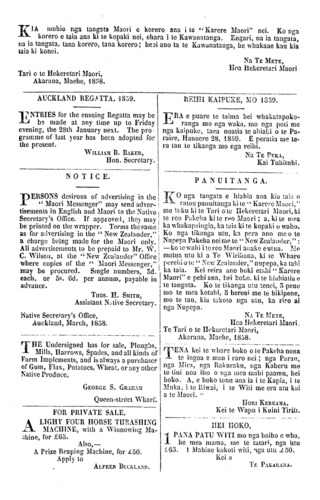 KIA mohio nga tangata Maori e korero ana ite "Karere Maori" nei. Konga korero e taia ana ki le kopaki nei, ehara i te Kawanatanga. Engari, na ia tangata, na ia tangata, iana korero, tana korero; heki ano ta te Kawanatanga, he wvhakaae kau kia taia ki konei. Na TE METE, Hoa tiekerelari Maori Tari o te Hekeretari Maori, Akarana, Maehe. l8r>8. AUCKLAND REGATTA, -1859. ENTRIES tor Hie ensuing Regatta may be be made at any time. up to Friday evening, the 28th January next. The pro gramine of last year has been adopted for the present. WILLIAM B. BAKER, Hon. Secrctary. NOTICE. 'OEKSONS dcsirous of ndverlising in ihe -I- tt Maori Mcssenger" may send adver- lisemenls in English and ?Jaori to llic Native Seerelary's Office. If approvcd, ihov mae- he prinlcd on Ihe wrapper. Terrns thc?aine as for ach'erUsing in ihe " New Zealander," ft charge being made for ihe Maoii only. All adverliscnients lo be pi'cpaid to Mr. W. C. Wi!son, ai Hie " New Zca!andcr" Office where copies of Hie " Maori Messcnger," may be procured. Single numbers, 5d. each, or os. 6d. per annum, payable in advance. TIIOS. H. SMITH, Assistant Na live Secrciary. Native Secre'ary's Office, Auckland, March, -18o8. KEini KAIPUKE, MO 1859. ERA e puare le la?ma hei whakaupoko- 1 ranga mo nga wak;i, ino nga poti me nga kaipuku, laea noatia te a'niabi o te Pa- raire, Hanucre 28, 18^9. E peraiia me to- ra tau le Ukanga mo nga reilii. Ka TE PRKA, Kai Tuhituhi. P A N U I T A N G A. 17'O nga tangaia e hiahia ana kia ;aia o -E-^- !';uou panuitanga ki le " Karorc ?.?huri," me tuku ki te Tari o te nekcreiari Maon,ki te reo Pakeha ki le reo Maori; a, ki te nipa ka wliakap;uDg-'a, ka iaia ki (e kopaki o waho. Ko nga tikanga utu, ka pora ano me o te Nupepa Pakeha nei me te '•'• NewZea!ander," : —kote wa h i i' o reo M a ori a n a k o e u i u a. M e maina niu ki a To Wiri;iana, ki le Whare perehi o lc " Nf;v.' Zc;iiancler," nupepa, ka tahi ka iaia. Kei reira ano hoki e!,;i!» " Karere Muori" e pehi anu, hei hoko, ki te hiahiatia e le tangata. Ko le tikanga '"lu lenc'i, 5 pene mo te moa kota!i!, S liereni me le hikipene, mo te tau, kia lukoio nga r.lu, ka riro ai nga Kupcpa. NA TE ?JETR, Koa Hekerelari MaorL Te Tari o te nekert!ari Maori, Akorana, Maehe, '18o8.