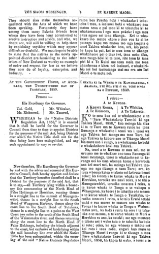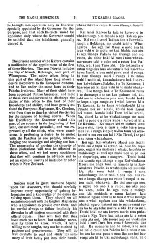 THE MAORI MESSENGER TE KARERE MAORI. VOL Vl AUCKLAND, FEB. 28, 1859, AKARANA, PEPUERE 28, 1859. [No. 4. IN the Karere of the 15th of September last our readers were informed that two new laws especially affecting the Maori people had been passed by the General Assembly of New Zealand. It was stated that the object of these new laws was to enable the Governor to aid the Maori people living apart from the Europeans in their efforts to raise them- selves, and to become like their Pakeha brethren by the substitution of English laws for the old native customs. The new Iaws to which we refer are, The Native Districts Regulation Act, 1858, and The Native Circuit Courts Act, 1858. They were translated and published in the Maori Messenger for the information of the Maori people. Our friends were told that these new laws could I TE Karere o te 13 o Hepetema o te tau kua pahure ake nei i whakamohiotia te hu- nga korero i tenei Nupepa ki nga Ture hou erua, tona taunga kei nga Iwi Maori, he mea whakatakoto e te Runanga whakatakoto Tu- re o Niu Tirani. Korerotia ana i reira te take o aua Ture hou i whakaritea ai, hei mea hoki e ahei ai i Te Kawana te whakauru i nga Iwi Maori e noho motuhake ana i nga Pa- keha a e mea ana ki te whakatupu i a ratou ki runga ki nga tikanga marama, e whai ana hoki kia rite te ahua ki o ratou tuakana Pa- keha, kia whakarerea nga ritenga Maori o mua, kia tango hoki ki o Ingarani ture hei whakakapi mo ana ritenga. Ko nga Ture hou e korerotia atu nei koia nei ko " Te Ture whakatakoto Ture-iti ki nga Takiwa Maori, 1858" a, tetahi, ko te "Ture whakarite Kooti Maori, 1838." Ko enei Ture i whakamaori- tia i taia hoki ki te " Karere Maori" kia mo- hiotia ai e nga Iwi Maori. I peneitia atu ano hoki te kupu ki o matou hoa; ko aua Tu re ekore e whakairihia noatia ki nga wahi katoa, engari, hei nga Takiwa anake ma Te Kawana ano e whakarite hei taunga mo aua Ture ra, a ekore ano hoki e whakaritea noa- tia e Te Kawana nga Takiwa hei peratanga, engari, ma te kitea ano e ia kei te hiahia pono te tokomaha o te hunga noho i taua wahi kia