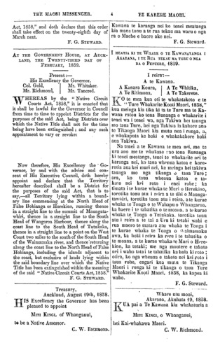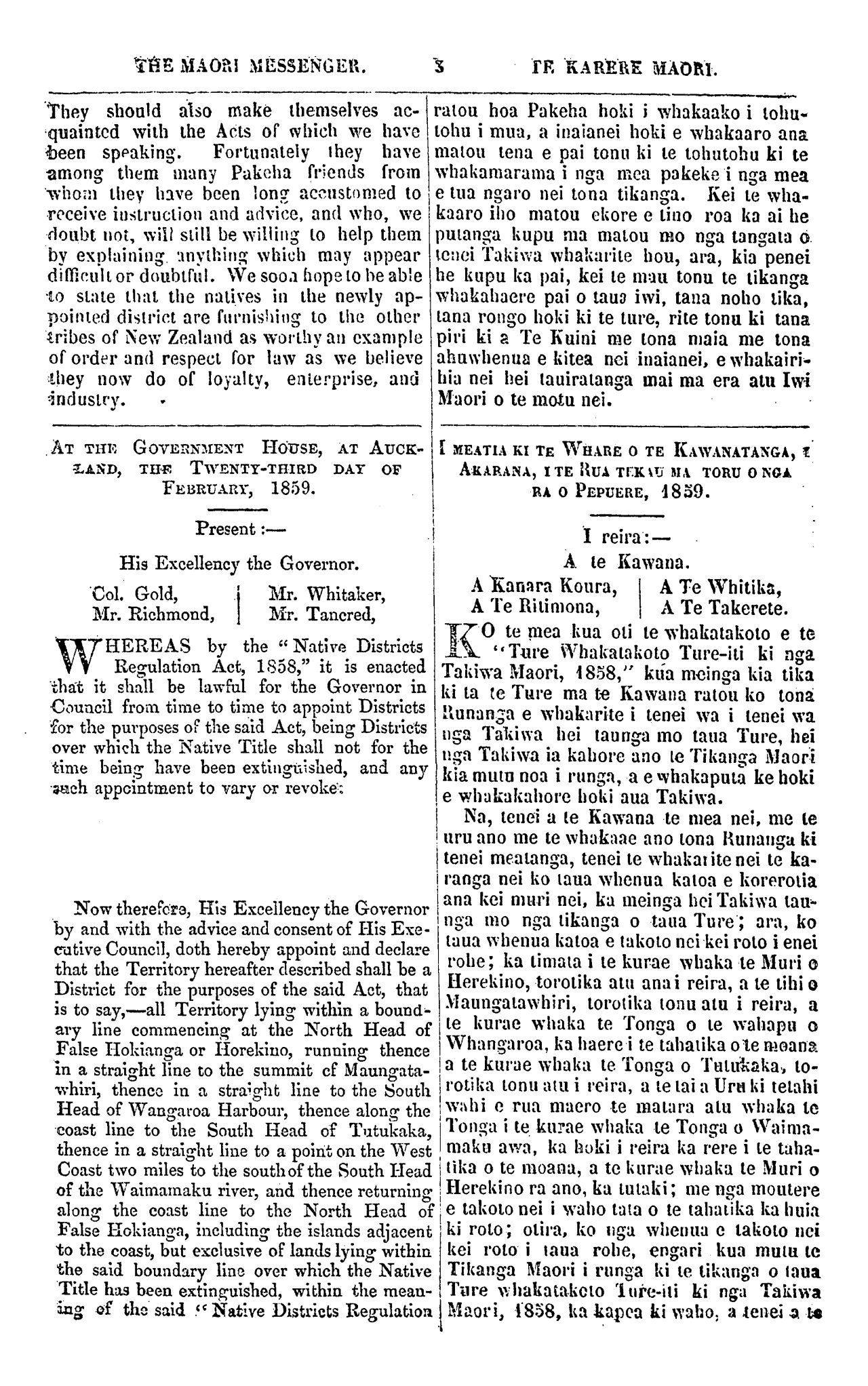 THE MAORI MESSENGER. TE KARERE MAORI. They should also make themselves ac- quainted will the Acts of which we have been speaking. Fortunately they have among them many Pakeha friends from whom they have been Iong accustomed to receive instruction, and advice, and who, we doubt not, will still be willing to help them by explaining anything which may appear difficult or doubtful. We soon hope to he able to state that the natives in the newly ap- pointed district are furnishing to the other tribes of New Zealand as worthy an example of order and respect for law as we believe they now do of loyalty, enterprise, and industry. AT THE GOVERNMENT HOUSE, AT AUCK- LAND, THE TWENTY-THIRD DAT OF FEBRUARY, 1859. Present:— His Excellency the Governor. Col. Gold, 1 Mr. Whitaker, Mr. Richmond, Mr. Tanered, WHEREAS by the "Native Districts Regulation Act, 1858," it is enacted that it shall be lawful for the Governor in Council from time to time to appoint Districts for the purposes of the said Act, being Districts over which the Native Title shall not for the time being have been extinguished, and any such appointment to vary or revoke: Now therefore, His Excellency the Governor by and with the advice and consent of His Exe- cutive Council, doth hereby appoint and declare I that the Territory hereafter described shall be a District for the purposes of the said Act, that is to say,—all Territory lying within a bound- ary line commencing at the North Head of False Hokianga or Horekino, running thence in a straight line to the summit of Maungata- whiri, thence in a straight line to the youth Head of Wangaroa Harbour, thence along the coast line to the South Head of Tutukaka, thence in a straight line to a point on the West Coast two miles to the south of the South Head of the Waimamaku river, and thence returning along the coast line to the North Head of False Hokianga, including the islands adjacent to the coast, but exclusive of lands lying within the said boundary line over which the Native Title has been extinguished, within the mean- ing' of the said "Native Districts Regulation ratou hoa Pakeha hoki i whakaako i tohu- tohu i mua, a inaianei hoki e whakaaro ana matou tena e pai tonu ki te tohutohu ki te whakamarama i nga mea pakeke i nga mea e tua ngaro nei tona tikanga. Kei te wha- kaaro iho matou ekore e tino roa ka ai he putanga kupu ma matou mo nga tangata o tenei Takiwa whakarite hou, ara, kia penei he kupu ka pai, kei te mau tonu te Ukanga whakahaere pai o taua iwi, tana noho Uka, tana rongo hoki ki te ture, rite tonu ki tana piri ki a Te Kuini me tona maia me tona ahuwhenua e kitea nei inaianei, e whakairi- hia nei hei tauiratanga mai ma era atu Iwi Maori o te motu nei. I MEATIA KI TE WHARE O TE KAWANATANGA, 1 AKARANA, ITE KUA TEKAU MA TORU O NGA RA O PEPUERE, 1859. I reira:— A. te Kawana. A Kanara Koura, A Te Whitika, A Te Ritimona, A Te Takerete. KO te mea kua oti te whakatakoto e te " Ture Whakatakoto Ture-iti ki nga Takiwa Maori, 1858," kua meinga kia tika ki ta te Ture ma te Kawana ratou ko tona Runanga e whakarite i tenei wa i tenei wa nga Takiwa hei taunga mo taua Ture, hei nga Takiwa ia kahore ano te Tikanga Maori kia mutu noa i runga, a e whakaputa ke hoki e whakakahore hoki aua Takiwa. Na, tenei a te Kawana te mea nei, me te uru ano me te whakaae ano tona Runanga ki tenei meatanga, tenei te whakarite nei te ka- ranga nei ko taua whenua katoa e korerotia ana kei muri nei, ka meinga hei Takiwa tau- nga mo nga tikanga o taua Ture; ara, ko taua whenua katoa e takoto nei kei roto i enei rohe; ka timata i te kurae whaka te Muri o Herekino, torotika atu ana i reira, a te tihi o Maungatawhiri, torotika tonu atu i reira, a te kurae whaka te Tonga o te wahapu o Whangaroa, ka haere i te tahatika o te moana a te kurae whaka te Tonga o Tutukaka, to- rotika tonu atu i reira, a te tai a Uru ki tetahi wahi e rua maero te matara atu whaka te Tonga i te kurae whaka te Tonga o Waima- maku awa, ka huki i reira ka rere i te taha- tika o te moana, a te kurae whaka te Muri o Herekino ra ano, ka tutaki; me nga moutere e takoto nei i waho tata o te tahatika ka huia ki roto; otira, ko nga whenua e takoto nei kei roto i taua rohe, engari kua mutu te Tikanga Maori i runga ki te tikanga o taua Ture whakatakoto Ture-iti ki nga Takiwa Maori, 1858, ka kapea ki waho, a tenei a te
