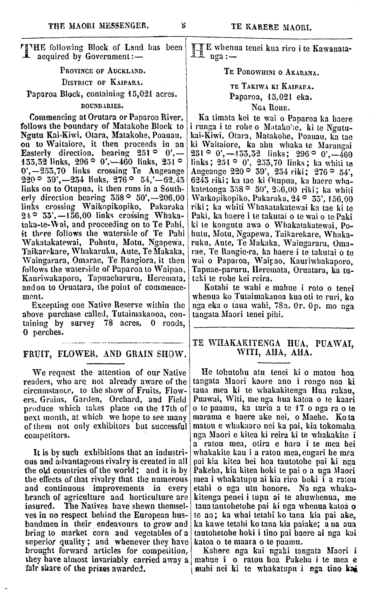 THE MAORI MESSENGER. TE KARERE MAORI. THE following Block of Land has been acquired by Government:— PROVINCE OF AUCKLAND. DISTRICT OF KAIPARA. Paparoa Block, containing 15, 021 acres. BOUNDARIES. Commencing at Orutara or Paparoa River, follows the boundary of Matakohe Block to Ngutu Kai-Kiwi, Otara, Matakohe, Poauau, on to Waitaiore, it then proceeds in an Easterly direction, bearing 251 0',— 133. 32 links, 296° 0', 460 links, 251° 0', 253, 70 links crossing Te Angeange 220° 39', 234 links, 276° 54,'-62, 43 links on to Otupua, it then runs in a South- erly direction bearing 358° 50', 206, 00 links crossing Waikopikopiko, Pakaraka 24 33', 156, 00 links crossing Whaka- taka-te-Wai, and proceeding on to Te Pahi, it there follows the waterside of Te Pahi Whakatakatewai, Pohutu, Motu, Ngapewa, Taikarekare, Whakaruku, Aute, Te Makaka, Waingarara, Omarae, Te Rangiora, it then follows the waterside of Paparoa to Waipao, Kauriwakaporo, Tapuaeharuru, Heremata, and on to Oruatara, the point of commence- ment. Excepting one Native Reserve within the above purchase called, Tutaimakanoa, con- taining by survey 78 acres, 0 roods, 0 perches. FRUIT, FLOWER, AND GRAIN SHOW. We request the attention of our Naive readers, who are not already aware of the circumstance, to the show of Fruits, FIow- ers, Grains, Garden, Orchard, and Field produce which lakes place on the 17th of next month, at which we hope to see many of them not only exhibitors but successful competitors. It is by such exhibitions that an industri- ous and advantageous rivalry is created in all the old countries of the world; and it is by the effects of that rivalry that the numerous and continuous improvements in every branch of agriculture and horticulture are insured. The Natives have shewn themsel- ves in no respect behind the European hus- bandmen in their endeavours to grow and bring to market corn and vegetables of a superior quality; and whenever they have brought forward articles for competition, they have almost invariably carried away a fair share of the prizes awarded. HE whenua tenei kua riro i te Kawanata- nga:— TE POROWHINI O AKARANA. TE TAKIWA KI KAIPARA. Paparoa, 15, 021 eka. NGA ROHE. Ka timata kei te wai o Paparoa ka haere i runga i te rohe o Matakohe, ki te Ngutu- kai-Kiwi, Otara, Matakohe, Poauau, ka tae ki Waitaiore, ka ahu whaka te Marangai 251 0 0', 133,32 links; 296° O', 460 links; 251 0', 233, 70 links; ka whiti te Angeange 220° 39', 254 riki; 276° 54', 6245 riki; ka tae ki Otupua, ka haere wha- katetonga 358° 50', 266, 00 riki; ka whiti Waikopikopi, Pakaraka, 24° 33', 156,OO riki; ka whiti Whakatakatewai ka tae ki te Paki, ka haere i te takutai o te wai o te Paki ki te kongutu awa o Whakatakatewai, Po- hutu, Motu, Ngapewa, Taikarekare. Whaka- ruku, Aute, Te Makaka, Waingarara, Oma- rae, Te Rangio-ra, ka haere i te takutai o to wai o Paparoa, Waipao, Kauriwhakaporo, Tapuae-paruru, Heremata, Oruatara, ka tu- taki te rohe kei reira. Kotahi te wahi e mahue i roto o tenei whenua ko Tutaimakanoa kua oti te ruri, ko nga eka o taua wahi, 78 a. Or. O p. mo nga tangata Maori tenei pihi. TE WHAKAKITENGA HUA, PUAWAI, WITI, AHA, AHA. He tohutohu atu tenei ki o matou hoa tangata Maori kaore ano i rongo noa ki taua mea ki te whakakitenga Hua rakau, Puawai, Witi, me nga hua katoa o te kaari o te paamu, ka turia a te 17 o nga ra o te marama e haere ake nei, o Maehe. Ko ta matou e whakaaro nei ka pai, kia tokomaha nga Maori e kitea ki reira ki te whakakite i a ratou mea, otira e hara i te mea hei whakakite kau i a ratou mea, engari he mea pai kia kitea hei hoa tautotohe pai ki nga Pakeha, kia kitea hoki te pai o a nga .Maori mea i whakatupu ai kia riro hoki i a ratou etahi o nga utu honore. Na nga whaka- kitenga penei i tupu ai te ahuwhenua, me taua tautohetohe pai ki nga whenua katoa o te ao; ka whai tetahi ko tana kia pai ake, ka kawe tetahi ko tana kia paiake; a na aua tautohetohe hoki i tino pai haere ai nga kai katoa o te maara o te paamu. Kahore nga kai ngaki tangata Maori i mahue i o ratou hoa Pakeha i te mea e mahi nei ki te whakatupu i nga tino kai