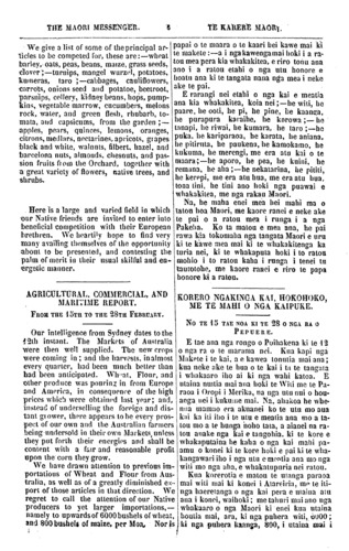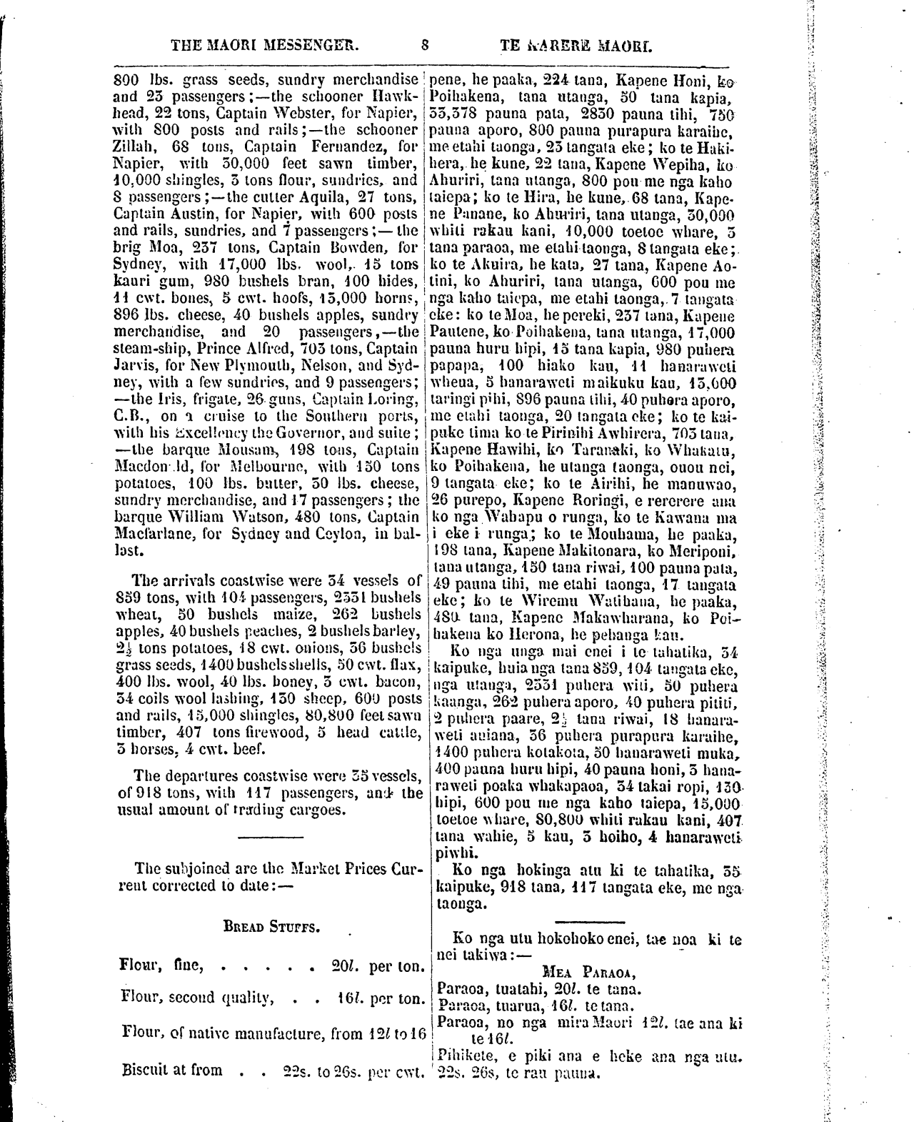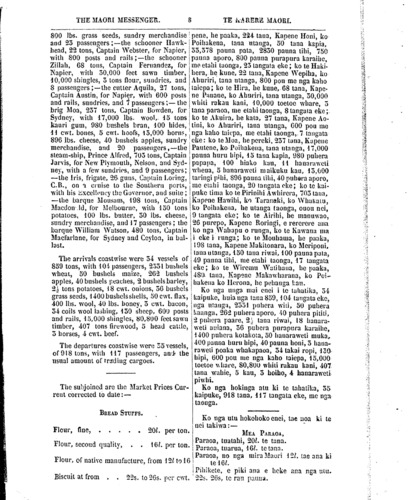 THE MAORI MESSENGER. We give a list of some of the principal ar- ticles to be competed for, these are: wheat barley, oats, peas, beans, maize, grass seeds, clover;— turnips, mangel wurzel, potatoes, kumeras, taro; cabbages, cauliflowers, carrots, onions seed and potatoe, beetroot, parsnips, cellery, kidney beans, hops, pump- kins, vegetable marrow, cucumbers, melons rock, water, and green flesh, rhubarb, to- mata, and capsicums, from the garden;— apples, pears, quinces, lemons, oranges, citrons, medlars, nectarines, apricots, grapes black and while, walnuts, filbert. hazel, and barcelona nuts, almonds, chestnuts, and pas- sion fruits from the Orchard, together with a great variety of flowers, native trees, and shrubs. Here is a large and varied field in which our Native friends are invited to enter into beneficial competition with their European brethren. We heartily hope to find very many availing themselves or the opportunity about to be presented, and contesting the palm of merit in their usual skilful and en- ergetic manner. AGRICULTURAL, COMMERCIAL, AND MARITIME REPORT. FROM THE 15TH TO THE 28TH FEBRUARY. Our intelligence from Sydney dates to the 12th instant. The Markets of Australia were then well supplied. The new crops were coming in; and the harvests, in almost every quarter, had been much better than had been anticipated. Wheat, Flour, and other produce was pouring in from Europe and America, in consequence of the high prices which were obtained last year; and, instead or underselling the foreign and dis- tant grower, there appears to be every pros- pect of our own and the Australian farmers being undersold in their own Markets unless they put forth their energies and shall be content with a fair and reasonable profit upon the corn they grow. We have drawn attention Io previous im- portatious of Wheat and Flour from Aus- tralia, as well as of a greatly diminished ex- port of those articles in that direction. We regret to call the attention of our Native producers to yet larger importations, namely to upwards of 6000 bushels of wheat, and 800 bushels of maize, per Moa Nor is papai o te maara o te kaari hei kawe mai ki te makete:—a i nga kawenga ma i hoki i a ra- tou mea pera kia whakakitea, e riro tonu ana ano i a ratou etahi o nga utu honore e hoatu ana ki te tangata nana nga mea i neke ake te pai. E rarangi nei etahi o nga kai e meatia ana kia whakakitea, koia nei;—he witi, he paare, he ooti, he pi, he pine, he kaanga, he purapura ka raihe, he korowa;— he tanapi, he riwai, he kumara, he taro; be puka, he kariparaoa, he karata, he aniana, he pitiruta, he paukena, he kamokamo, he kukuma, he merengi, me era atu kai o te maara; he aporo, he pea, he kuini, he remana, he aha; he nekatarina, he pititi, he kerepi, me era atu hua, me era atu hua, tona tini, he tini ano hoki nga puawai e whakakitea, me nga rakau Maori. Na, he maha enei mea hei mahi ma o tatou hoa Maori, me kaore ranei e neke ake te pai o a ratou mea i runga i a nga Pakeha. Ko ta matou e mea ana, he pai rawa kia tokomaha nga tangata Maori e uru ki te kawe mea mai ki te whakakitenga ka turia nei, ki te whakaputa hoki i to ratou mohio i to ratou kaha i runga i tenei tu tautotohe, me kaore ranei e riro te papa honore ki a ratou. KORERO NGAKINGA KAI, HOKOHOKO, ME TE MAHI O NGA KAIPUKE. NO TE 15 TAE NOA KI TE 28 O NGA KA O PEPUERE. E tae ana nga rongo o Poihakena ki te 12 o nga ra o te marama nei. Kua kapi nga Makete i te kai, a e kawea tonutia mai ana; kua neke ake te hua o te kai i ta te tangata i whakaaro iho ai ki nga wahi katoa. E utaina nuitia mai ana hoki te Whi me te Pa- raoa i Oropi i Merika, na nga utu nui o hou- anga nei i kukume mai. Na,ahakoa he whe- nua mamao era akuanei ko te utu mo aua kai ka iti iho i te mu e meatia ana mo a ta- tou mo a te hunga hoho tata, a aianei na ra- tou anake nga kai e tangohia, ki te kore e whakaputaina he kaha o nga kai mahi pa- amu o konei ki te kore koki e pai ki te wha- kangawari iho i nga utu e meatia ana mo nga will mo nga aha, e whakatupuria nei ratou. Kua korerotia e matou te manga paraoa mai whi mai ki konei i Atareiria, me te iti- nga haeretanga o nga kai pera e maina atu ana i konei, waihoki; me tahuri mai ano nga whakaaro o nga Maori ki enei kua maina houtia mai, ara, ki nga puhera witi, 8000; ki nga puhera kaanga, 800, i utaina mai i