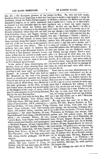 THE MAORI MESSENGER TE KARERE MAORI. this all; —the European growers of the Southern Districts are beginning to find that Auckland, (which the Native Farmers appear disposed to neglect, or to vainly endeavour to control) is a very desirable mart for their industry—a fact which the Natives may readily discover by reference to the Shipping Returns subjoined, where they will see that from Lyttelton, Otago, and Napier, during the last fortnight no less than 2557 bushels of wheat, and 503 bushels of barley have been received, being 266 bushels of the first, and 501 of the last in excess of the quantity received from our own shores. This is a striking fact—one which it behoves the Native, as well as the European farmers, of the North of New Zealand, seriously to con- sider, unless they be content to make sacri- fice of their best interests, and to take a se- condary and very inferior rank in the scale of New Zealand Agriculturists. In the midst of these discouraging ten- dencies, there are these cheering facts, that Sheep Fanning and Wool growing, are pro- gressing in the most rapid and satisfactory manner. At a second Wool sale, held by Mr. Buckland on the 16th of the present month, a considerable quantity was brought forward and sold at very satisfactory prices; whilst a sale of 2700 sheep was effected by the same gentlelman on the 24th, at large and liberal rates—in every way encouraging to the shippers of the cargo of sheep which may be soon expected to arrive from Moreton Bay by the ship Evening Star. The arrivals have been the brig Moa, 237 tons, Captain Bowden, from Sydney, with 1540 bags wheat, 200 bags maize, a general cargo of merchandise, and 8 passengers;— the brig' Gil Blas, 175 tons, Captain Wedg- wood, from Lyttleton, with 1367 bushels wheat, 503 bushels barley, sundries, and 2 passengers; — the cutter Surprise, 50 tons, Captain Braund, from Otago. with 530 bushels wheat; -the schooner, Eliezer, 56 tons, Captain Kean, from Napier, with 749 bushels wheat, sundry merchandise, and 5 passengers; —the ketch Pegasus, 45 tons, Captain Brier, from Napier, with 91 bushels wheat;—the Prince Alfred, steam ship, 703 tons, Captain Jarvis, from Sydney by way of Nelson and New Plymouth, with 170 bags grass seed, 564 sheep, sundry packages, and 20 pas- sengers. The departures were, —the barque Bread- albane, 224 Ions, Captain P. Jones, for Sydney, with 50 tons kauri gum, 55, 578 Ibs. butter, 2850 Ibs. cheese, 730 Ibs. apples, runga i te Moa, Na, tera ano hoki tetahi, kua tupu te mohio o nga tangata o runga ki te Makete o Akarana, he Makete pai mo nga mea e mahia ana e ratou, no te mea hoki e I ngoikore ana o konei kai ngaki tangata Maori: ka kite ano nga Maori i te tika o tenei kupu me he mea e korerotia ana e ra- tou nga utanga o nga kaipuke e rarangi iho i raro nei: ka kitea i reira nga kai kua ka- wea mai i Potikupa, i Otakou, i Ahuriri, i roto i nga wiki erua kua pahure nei, 2557 puhera witi, 503 puhera paare, kaore i pe- nei te maha o nga kai pera i utaina mai i o tatou nei wahapu; ko te nekenga ake o a ratou 266 puhera witi, 501 puhera paare. E- mea ana matou me ata whakaaro marire- nga Pakeha me nga tangata Maori o tenei pito o te Motu nei ki tenei mea, ara, ki te kore, heoi kua pai noa iho ratou ki te wha- karere, ki te ruke atu, i nga mea e puta ai he pai ki a ratou; kua pai noa iho kia waiho ma era kai ngaki o Niu Tirani te putanga ki mua, ko ratou hei muri rawa whai noa ai, he noa iho ai. Tenei ano ia enei mea whakamarama i te ngakau i roto i aua whakapouri nei, ko te mahi hipi e nui haere ana me te mahi wha- katupu huru hipi. I te Makete mama o Te Pakarana mo te hoko huru hipi i whakaturia i te 16 o nga ra o tenei marama he maha nga huru hipi i whakaaria kia hokona, a riro katoa ana, he utu pai ano te utu; 2700 hoki nga hipi i hokona atu e taua Pakeha ra i te 24 o nga ra, mau tonu hoki nga utu ki te nui, he oranga ngakau tenei mo nga Pakeha uta i nga hipi meake nei u mai i Moatana Pe, i runga i te Iwini Ta. Ko nga unga mai enei; ko te. Moa, he pereki, 257 tana, Kapene Pautene, no Poi- hakena, tana utanga, 1540 peke witi, 200 peke kaanga. me nga taonga, 8 tangata eke; ko te Hiri Para, he pereki, 175 tana, Kapene Wetiwuru, no Potikupa, tana manga, 1567 puhera witi, 505 puhera paare, me etahi taonga, 2 tangata eke; ko te Haparaiha, he kata, 50 tana, Kapene Parane, no Otakou, tana utanga, 550 puhera will; ko te Erieha, he kune, 56 tana, Kapene Keene, no Ahuriri, tana utanga, 749 puhera witi, me nga taonga, 5 tangata eke; ko te Pekeha, he kune, 45 tana, Kapene Paraea, no Ahuriri, tana uta- nga, 91 puhera witi; ko te Pirinihi Awhire- ra, he kaipuke lima, 703 tana, Kapene Ha- wihi, no Poihakena, i na Whakatu, i na Taranaki mai, tana utanga, 170 peke pura- pura karaihe, 564 hipi, me etahi paihere, 20 tangata eke. Ko nga hokinga ata enei; ko te Perera-
