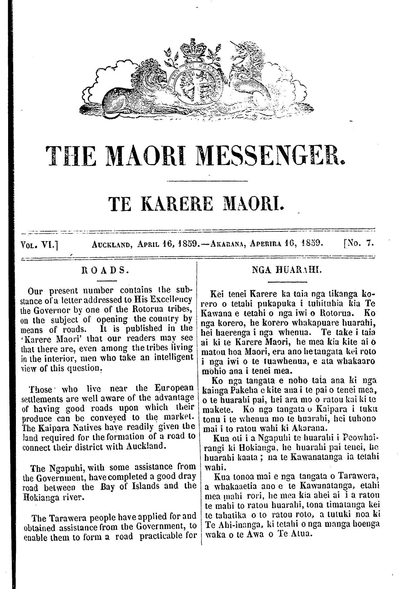 The Maori Messenger - Ko te Karere Maori 1855-1860: Volume 6, Number 7. 16 April 1859 |