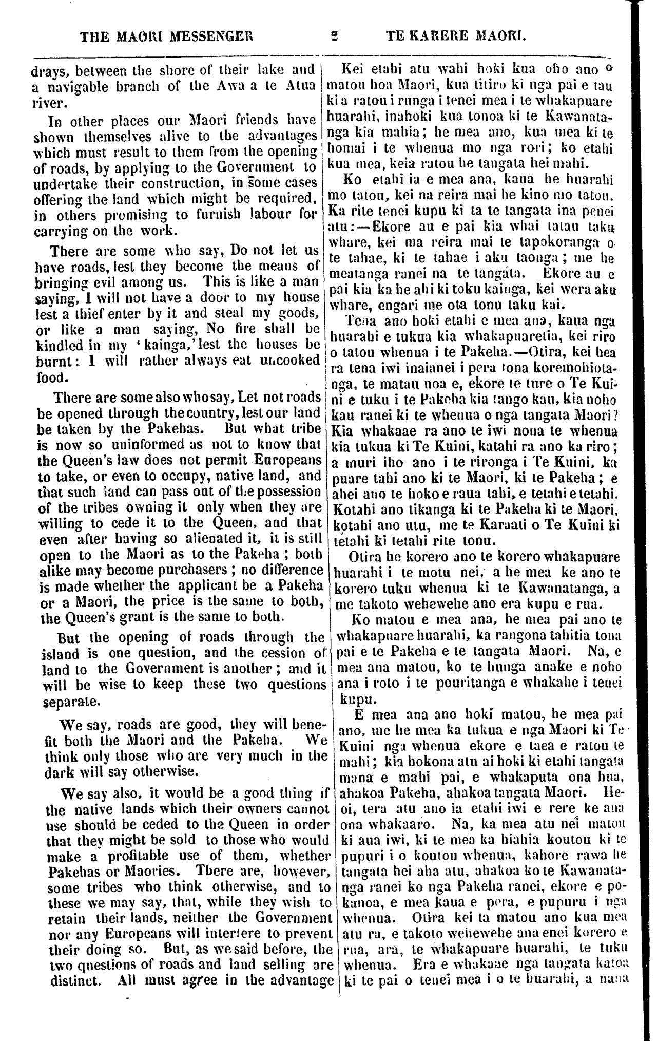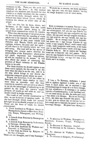 THE MAORI MESSENGER TE KARERE MAORI. VOL. VI.] AUCKLAND, APRIL 16, 1859.—AKARANA, APERIRA 16, 1859. [No. 7. ROADS. Our present number contains the sub- stance of a letter addressed to His Excellency the Governor by one of the Rotorua tribes, on the subject of opening the country by means of roads. It is published in the 'Karere Maori' that our readers may see that there are, even among the tribes living in the interior, men who take an intelligent view of this question. Those who live near the European settlements are well aware of the advantage of having good roads upon which their produce can be conveyed to the market. The Kaipara Natives have readily given the land required for the formation of a road to connect their district with Auckland. The Ngapuhi, with some assistance from the Government, have completed a good dray road between the Bay of Islands and the Hokianga liver. The Tarawera people have applied for and obtained assistance from the Government, to enable them to form a road practicable for NGA HUARAHI. Kei tenei Karere ka taia nga tikanga ko- rero o tetahi pukapuka 5 tuhituhia kia Te Kawana e tetahi o nga iwi o Rotorua. Ko nga korero, he korero whakapuare huarahi, hei haerenga i nga whenua. Te take i taia ai ki te Karere Maori, he mea kia kite ai 6 matou hoa Maori, era ano he tangata kei roto i nga iwi o te tuawhenua, e ata whakaaro mohio ana i tenei mea. Ko nga tangata e noho taia ana ki nga kainga Pakeha e kite ana i te pai o tenei mea, o te huarahi pai, hei ara mo o ratou kai ki te makete. Ko nga tangata o Kaipara i tuku tonu i te whenua mo te huarahi, hei tuhono mai i to ratou wahi ki Akarana. Kua oti i a Ngapuhi te huarahi i Peowhai- rangi ki Hokianga, he huarahi pai tenei, be huarahi kaata; na te Kawanatanga ia tetahi wahi. Kua tonoa mai e nga tangata o Tarawera, a whakaaetia ano e te Kawanatanga, etahi mea mahi rori, he mea kia ahei ai i a ratou te mahi to ratou huarahi, tona timatanga kei te tahatika o to ratou roto, a tutuki noa ki Te Ahi-inanga, ki tetahi o nga manga hoenga waka o te Awa o Te Atua.