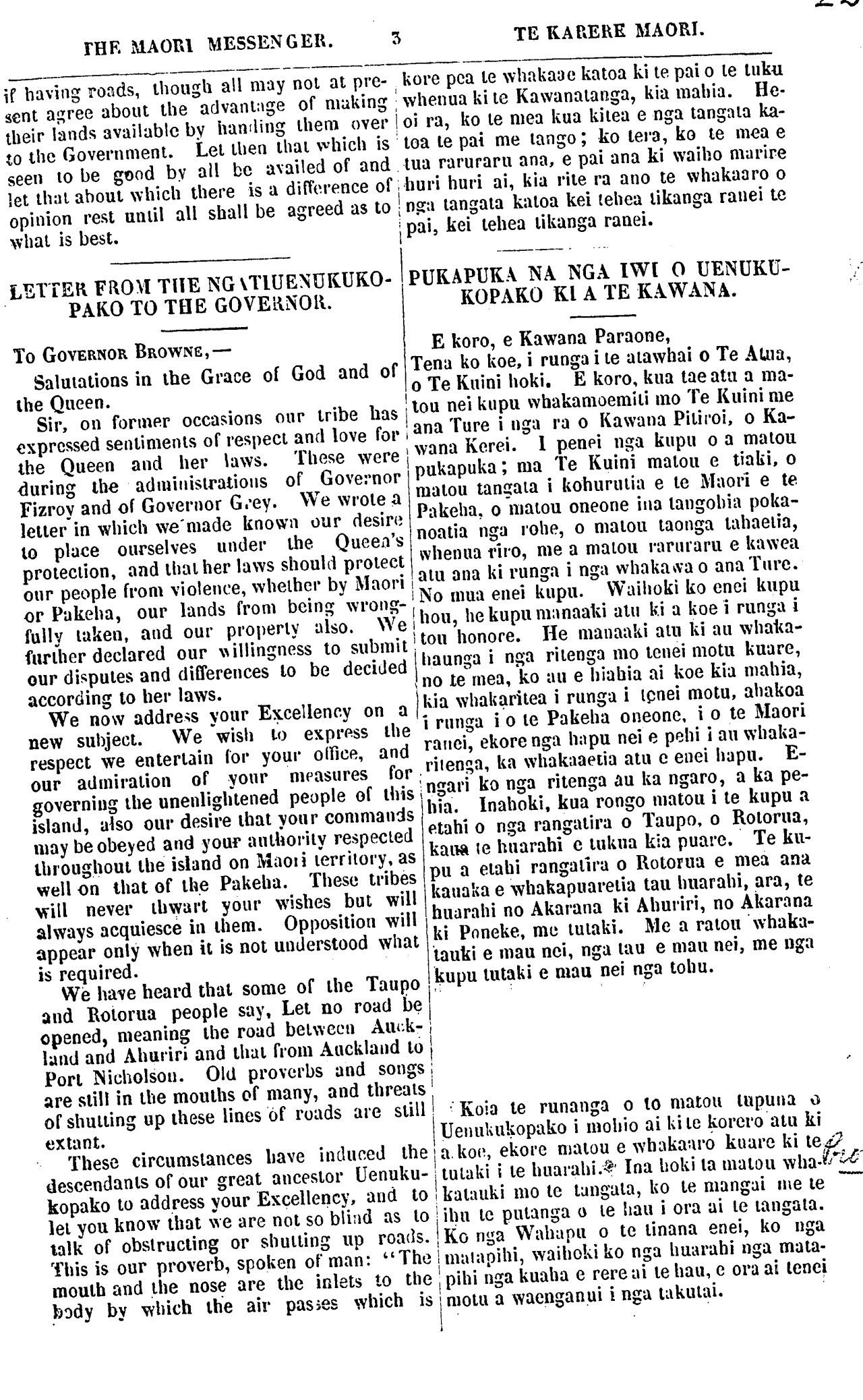 THE MAORI MESSENGER. TE KARERE MAORI. if having roads, though all may not at pre- sent agree about the advantage of making their lands available by handing them over to the Government. Let then that vvhich is seen to be good by all be availed of and let that about which there is a difference of opinion rest until all shall be agreed as to what is best. LETTER FROM THE NGATIUENUKUKO- PAKO TO THE GOVERNOR. To GOVERNOR BROWNE,— Salutations in the Grace of God and of the Queen. Sir, on former occasions our tribe has expressed sentiments of respect and love for the Queen and her laws. These were during the administrations of Governor Fizroy and of Governor Grey. We wrote a letter in which we made known our desire to place ourselves under the Queen's protection, and that her laws should protect our people from violence, whether by Maori or Pakeha, our lands from being wrong- fully taken, and our property also. We further declared our willingness to submit our disputes and differences to be decided according to her laws. We now address your Excellency on a new subject. We wish to express the respect we entertain for your office, and our admiration or your measures for governing the unenlightened people of this island, also our desire that your commands may be obeyed and your authority respected throughout the island on Maori territory, as well on that of Ihe Pakeha. These tribes will never thwart your wishes but will always acquiesce in them. Opposition will appear only when it is not understood what is required. We have heard that some of the Taupo and Rotorua people say, Let no road be opened, meaning the road between Auck- land and Ahuriri and that from Auckland to Port Nicholson. Old proverbs and songs are still in the mouths of many, and threats of shutting up these lines of roads are still extant. These circumstances have induced the descendants or our great ancestor Uenuku- kopako to address your Excellency, and to let you know that we are not so blind as to talk of obstructing or shutting up roads. This is our proverb, spoken of man: "The mouth and the nose are the inlets to the body by which the air passes which is kore pea te whakaae katoa ki te pai o te tuku whenua ki te Kawanatanga, kia mahia. He- I oi ra, ko te mea kua kitea e nga tangata ka- toa te pai me tango; ko tera, ko te mea e tua raruraru ana, e pai ana ki waiho marire huri huri ai, kia rite ra ano te whakaaro o nga tangata katoa kei tehea tikanga ranei te pai, kei tehea tikanga ranei. PUKAPUKA NA NGA IWI O UENUKU- KOPAKO KI A TE KAWANA. E koro, e Kawana Paraone, Tena ko koe, i runga i te atawhai o Te Atua, o Te Kuini hoki. E koro, kua tae atu a ma- tou nei kupu whakamoemiti mo Te Kuini me ana Ture i nga ra o Kawana Pitiroi, o Ka- wana Kerei. I penei nga kupu o a matou pukapuka; ma Te Kuini matou e tiaki, o matou tangata i kohurutia e te Maori e te Pakeha o matou oneone ina tangohia poka- noatia nga rohe, o matou taonga tahaetia, whenua riro, me a matou raruraru e kawea atu ana ki runga i nga whakawa o ana Ture. No mua enei kupu. Waihoki ko enei kupu hou, he kupu manaaki atu ki a koe i runga i tou honore. He manaaki atu ki au whaka- haunga i nga ritenga mo tenei motu kuare, no te mea, ko au e hiahia ai koe kia mahia, kia whakaritea i runga i tenei motu, ahakoa runga i o te Pakeha oneone, i o te "Maori ranei, ekore nga hapu nei e pehi i au whaka- mene, ka whakaaetia atu e enei hapu. E- ngari ko nga ritenga au ka ngaro, a ka pe- hia. Inahoki, kua rongo matou i te kupu a etahi o nga rangatira o Taupo, o Rotorua, kaua te huarahi e tukua kia puare. Te ku- pu a etahi rangatira o Rotorua e mea ana kanaka e whakapuaretia tau huarahi, ara, te huarahi no Akarana ki Ahuriri, no Akarana ki Poneke, me tutaki. Me a ratou whaka- tauki e mau nei, nga tau e mau nei, me nga kupu tutaki e mau nei nga tohu. Koia te runanga o to matou tupuna o Uenukukopako i mohio ai ki te korero atu ki a koe, ekore matou e whakaaro kuare ki te tutaki i te huarahi. Ina hoki Ia matou wha- katauki mo te tangata, ko te mangai me te ihu te putanga o te hau i ora ai te tangata. Ko nga Wahapu o te tinana enei, ko nga matapihi, waihoki ko nga huarahi nga mata- pihi nga kuaha e rere ai te hau e ora ai tenei motu a waenganui i nga takutai.