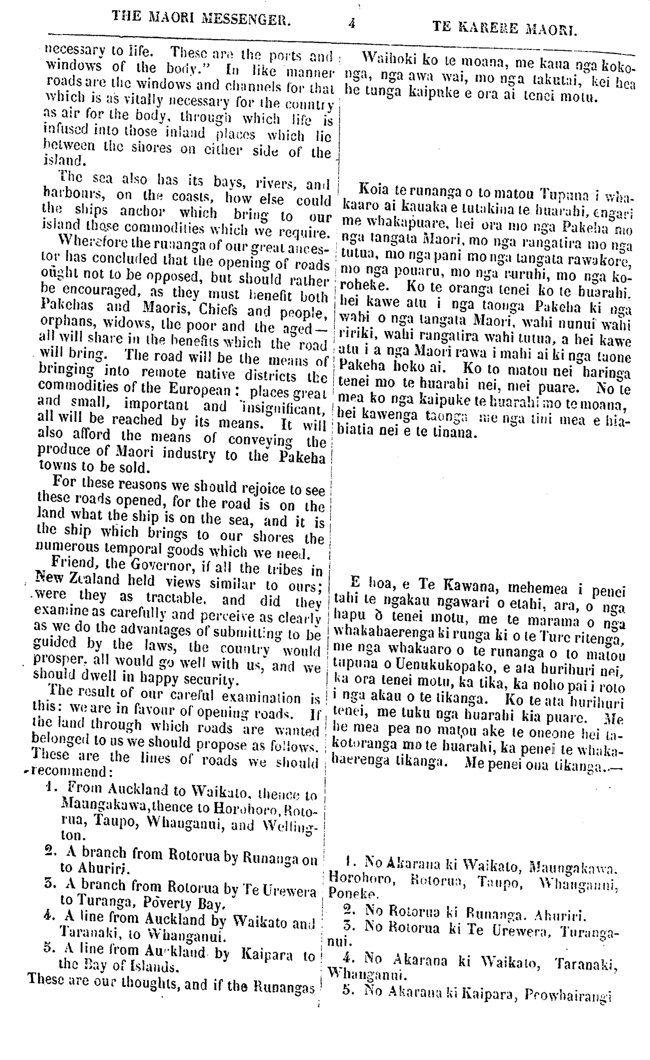 THE MAORI MESSENGER. TE KARERE MAORI. necessary to life. These are the ports and windows of the body." In like manner roads are the windows and c! i;iniiols (br i-hai which is !;is vitally iiecessary for the connlry as a;i' for (.he body, Ihroiigii whio!i life is infused inlo those inland p!a;;os which lie hclwecn l!ie shores on cither side of l!ie. island. The sea n!so lias its bays, rivers, ami harbonrs, on ihe coasts, how else could iho s!lips anchor which bring Io our island those commodities which we rcq'.iire. Whe;'zforc Ihe muanga of oni' greal auces- ior has concluded thai, ihe opening of roads oiiglil not lo be opposed, but should raiher ; be encouraged, as they must l;enent boih Pakclias and Maoris, Chiefs and people, orphans, widows, ihe poor and ihe aged— all will share in ihe benefits which ihe rone! will bring. T!ie road wiil be Ihe mc;iiis of bringing inlo reinute native dis'ricts Ike commodities of the European : places greai and ?mail, iniportanl and 'insignificant, all will be rcached by its means. It vvill also afTord the means of conveying ihe produce of Maori industry to Ihe Pakeha towns to be sold. For these reasons we should rejoice to see these roads opened, for the road is on the land what the s!lip is on Ihe sea, and it is ihe ship which brings to our shores the mimerous lemporal goods which we nee'I. Friend, Hie Govcrnor, if all the tribes in New Zraland held views simiiar to oilrs; .were they as traciable. and did they examine as carefnlly and perceive as clearly as we do ihe advantages ofsubruillmg to be guided by the laws, ihe comilry would prosper, all would go well with us, and we should dwell in happy securily. The rcsult of onr carefnl examination i.s this: we are in favonr of opening roads. If ihe land through whio!i rouds are \\v;iiueu belonged lo us we should propose as fo;iows. These are ihe lines of roads vvu should rrecommend: '1. From Auckland to Waikato, ilieiiw to Ma;.ingakawa,(.hence lo Hoi'iihoco,Roio- rna, Taupo, Whanganui, and Wdliug-- lon. 2, A branch from Rolorua by Runanga on to Aliurir;'. 5. A branch trorn Rolorua by Te Ij'rewera to Turanga, Pdveriy Bay, 4. A line from Auckland by Waikato an;l Taranaki, io Whanganui. 5. A line from Au''kland by Kaipara to the «"ay of Islands. These are our ihoughls, and if the Runangas W;niioki ko ie moana, me kana nga koko- nga, nga aw;l wai, mo nga lakul;ii, kei he;i he tunga kaipuke e ora ai lcnci molu. Koia ternnangao to matou Tup;inn i wls;i- kaaro ai kauaka e lul;ikiiia ie iniar;ihi, enga!'; me whakapukre, hei ora mo nga Pare!i;) mo nga tangata Maori, rno nga ranga tira ino nga tutua, mo nga pani mo nga tangata rawakorc, mo nga pon;iru, mo nga r-uriihi, mo nga ko- roheke. Ko te oranga tenei ko te buarahi. hei kawe am i nga taonga Pakeha ki nga v/;ihi o nga tangata Maori, wahi nunui wahi nriki, wahi ryngaura wahi tutua, a hei kawe ! a tu i a nga Maori rawa i mahi ai ki nga taone ! Pakeha hoko ai. Ko to matou nei haringa tenei mo te huarahi nei, mei puare. No le 1 mpa feo nga kaipuke te liuarahi ;no to moana, 'hei kawenga taone;': ;i;e nga tini mea e h«a- 'bialia nei e le tinana. E hoa, e Te Kawana, mehemea i penei tahi te ngakau ngawari o eiahi, ara, o nga hapu & tenei motu, me te marama o nga whakahaerenga ki runga ki o le Tui'c ritenga, me nga whakaaro o te runanca o to matou tupuna o Uenukukopako, e aia hurihuri nai, l<a ora tenei motu, ka tika, ka nohopnii roio i nga akau o te tikanga. Ko te ata hurihuri tenei, me tuku nga huaralii kia puai'o. Me. lie roea pea no matou ake te oneone !ici l;i- kotoranga mo te huarahi, ka penei le winik;i- haerenga likang;i. Ale penei ona tikanga.— 1. NoAL'ar;uia ki Waikato, M;>uiignl<nvrn. Horohdro, Hcton.i;i, T;uipo, Wliang;uii'i; Poneke. 3. No Rotori!y I<i Run,inp;a. Ahnrin. 5. No Koiorua ki Te Urewer;i, Tur;inga- nui. 4. No Akarana ki Waikato, Tarana!j, Wil;l ng','inni. 5. No Akaran^ !ii Kaipara, Prow!ha i ra iiy,'S