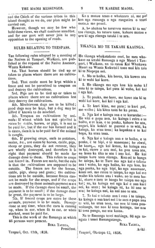 THE MAORI MESSENGER. TE KARERE MAORI. and the Chiefs of the various tribes in this island thought, as we do, our plan might be carried out. However, though we may be few who hold these views, we shall continue steadfast, and for our part will never join in any opposition to Ihe opening of roads. RULES RELATING TO TRESPASS. THE following rules adopted by a meeting of the Natives at Taupuri, Waikato, are pub- lished at the request of the Native Assessor, Waata Kukutai. 1st. That horses should be tied up or taken to places where there are no cultiva- tions. 2nd. That cattle must be kept within a fence and not be permitted to trespass on and destroy the cultivations. 3rd. Pigs are to bo lied up or taken to places where there are no cultivations lest they destroy the cultivations. 4th. Mischievous dogs are to be killed; good dogs may be kept, but a dog may be killed if known to do mischief. 5th Trespass on cultivations by ani- mals: If wheat which has not •pi; i.'iled is eaten by c;;llle, horses, or pigs, it, is noi to be paiil Cor, but if ihe ear lias formcd and il is eal.en, llicn il is lo be paid for if the animal is caught,. 6ih. If growing crops, such as potatoes, maixe, &c., are eaten by horses, cai,lle, pigs, sheep or goals, they do not recover, llicy ure wholly destroyed, and t,horefore it is righl that payment, sliou!d be made tor damage done lo ihcm. This refers to crops not fenced in. Fences are made, butllic rule is that ihe cultivations are supposed to be outside. The fences are tor the horse?, cattle, pigs, sheep and goats; (,lie; cultiva- tions are to be outside, because fences can- not be made tor ihe crops, and if the crops a;'e desiroye'l by lliese animals paymcn HUIKI be made. If ihe c'ainage clone be small, l!ie payment is to be small; if the clamagn done be great, the paymoni. is lo be !argo. 7th. If fenced crops are eale;i by these an!rnals, payment is lo be made. Pnuiagp <ione at any lime, when the corn is coming up, vvhen in ear, when fit to cut, or wheo stacked, inusl be pairl tor. This is the work of the Runanga at which 86 pcrsons were prescnt. RUKA TAURUA, President. Taupaii, Oct. I5'h, 1838. Ko a matou tenei e whakaaro ni, me pa' koa nga runanga o nga rangatira o tenei moUi,a me penei. A, ha ahakoa he torutoru matou ki ta ma" t,ou ritenga, ka tuluni tonu, kahore matou e uru ki nga ri tenga tutaki i Ie ara. TIKANGA MO TE TAKAHI KAAINGA. HE tikanga whakatakoto enei, he mea wha- kaae na tetahi Runanga a nga Maori i Tau- pari, i Waikato, na to raiou Kai Whakawa Maori na Waata Kukutai! tono mai kia Iaia ki te Niupepa nei. }. Mo ie hoiho, kia herea, kia kawe.i atu ki te wahi kai kore. 2. He tikanga mo nga kau kia noho ki rOU) ki te taiepa, kei puta ki waho, kei kai i nga kai. 3. Te poaka, me here, me kawe alii ki te wahi kai kore, kei kai i nga kai. 4. Te kuri kino, me pani; te kuri pai, me waiho ; kia kitea iana he ka pama. 3. Nga kai e kainga ana e Ie kararehe:— He witi e papa ana, ka kainga i reira e te hoiho, e IQ kau, e te poaka, kahore he niu, cngari, kia koki ri te puawai o te witi, ka kainga, ka mua tena; ka liopnkua e le kai hopu, ka «ina tena. 6. Nga kai e kainga ana e te hoiho, e le poaka, e le hipi, e te nanenane; he riwa», he kaan^u, nga kai katoa, ka kainga ena in kai, ckore e ora mai, ha pau tonu atu, na kona ka tika te niu i aua kai. He kai taiepa kore tena ritenga. Kua oti te hanga he taiepa, ko te Tiirc rno nga kai e takoto ana i waho, ko nga hoiho, ko ng"a kau, ko nga poaka, ko nga hipi, ko nga nanenane, koau nei, mo ralou te taiepa, ko nga kai we waiho kia takoto ana i waho, no le mea ho- ki, ei<ore e taea te hanga he taiepa mo nga kai; na, ka kainga nei nga kai e aua kuri nei, ka utua; he kainga ki, ka ili ano te mu; he kainga nui, ka nui ano le ulu. 7. Ti; kai e takoto ana i rolo i te taiepa, ka kainga e aua kuri nei i le men e papa ana to witi, ka utua tena, (ae noa ki tona pua- waitanga, tae noa ki lo;;a kotinga, tae noa ki tona punga, me ulii kaloa. Na te Runanga tenei mahinga, 86 nga tai ngata i tenei Knnangatanga. RL'KA TAL-RL-A, Aciki - Taupari, Oketopa iu, 1838.