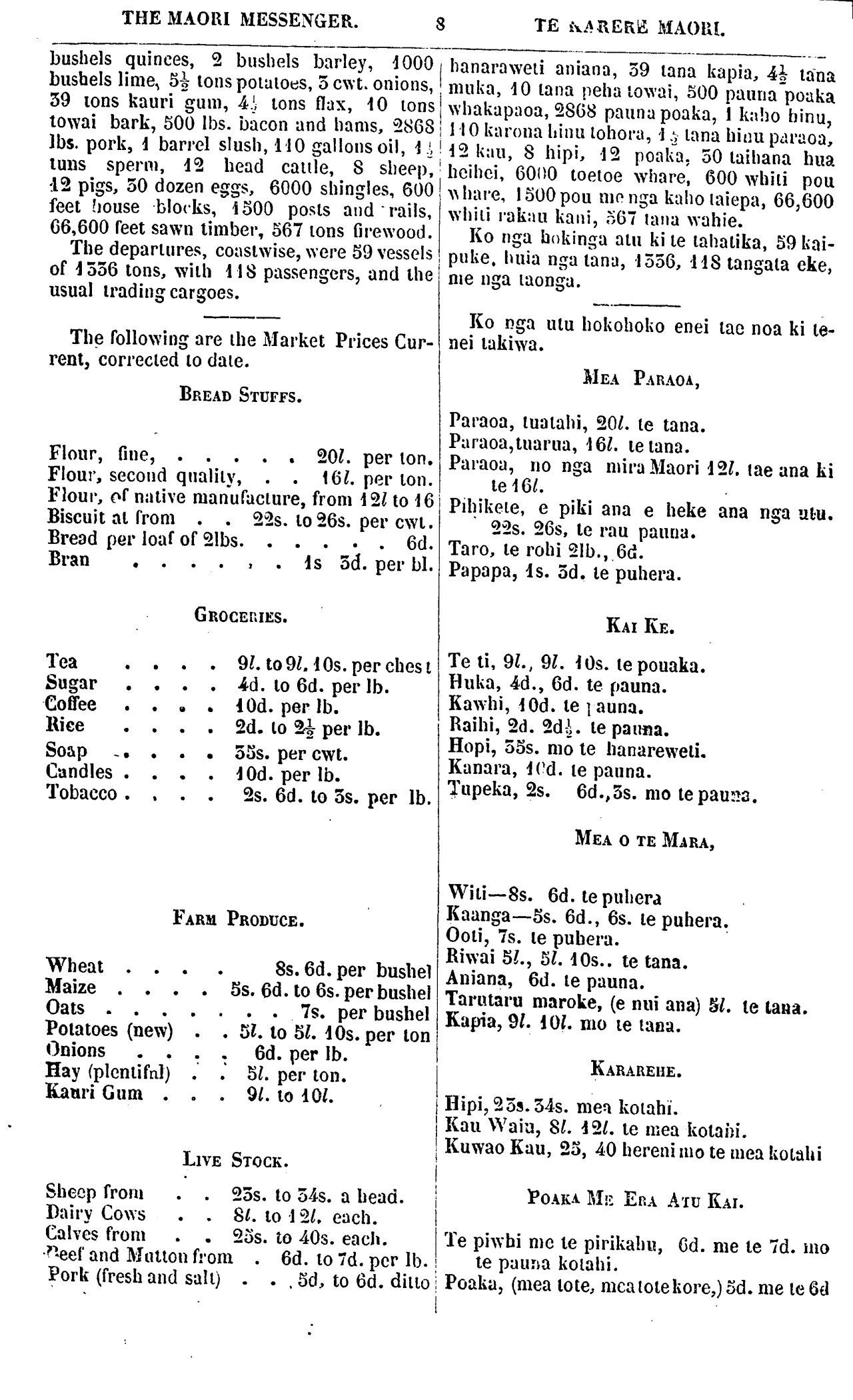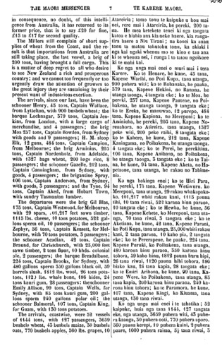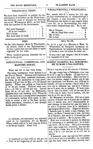 THE MAORI MESSENGER. 6 TE KARERE MAORI WHAINGAROA FERRY. WE have been requested to publish for the information or travellers on the West Coast, the following scale of charges for ferrying across the Whaingaroa River, as now fixed with the sanction of the Government. s. For each Passenger . 2 (If in bad weather) ..... 4 For a horse ....... 2 For each head of cattle .... 2 DIED. On the 14th January, Mohi Te Wharewhiti, an elderly Chief of the Ngatiraukawa: he was a good man and bis death is much regretted by bis tribe. Three hundred persons attended his re- mains to the grave. AGRICULTURAL, COMMERCIAL, AND MARITIME REPORT. FROM THE 1ST TO THE 15TH APRIL. The latest intelligence from Sydney is to the 31st of March. Business still continued to be dull; and flour remained stationary, but firm, at the quotations so long given, namely £19 per ton for fine, £l7, for second quality. Wheat was selling at from 6s 6d to 7s 3d per bushel. Potatoes were very low,—£2 10s to £3 10s per ton. Onions from £6 to £9 per ton. At Melbourne, Adelaide flour was fetching £l9; Wheat 8s 2d; but there was a strong belief entertained of a movement having been made in Ade- laide to create a rise in the flour market, which movement, however, it was thought would prove a failure. At Adelaide, the movement was tolerably rapid in its operations, for on Monday Wheat which sold at 7s had risen by Friday to 8s 2d per bushel. Flour £19. In Auckland we had a fall of 40s per ton in flour at the beginning of Ihe mouth but, WHAKAWHITINGA I WHAINGAROA. KUA meatia mai ki a matou kia taia nga uta kua whakaritea mo te whakawhitinga o nga tangata o nga kararehe i te awa o Whaingaroa, kia mohio ai nga tangata haere i tera tai, na te Kawanatanga ano hoki i titiro tenei whakaritenga utu. Ko ia nei. hereni. Mo te Tangata ....... 2 (Me he rangi kino rawa) ... 4 - Mo te hoio ........ 2 Mo te kau ..... 2 KUA MATE. No te U o nga ra o Hanuere a Mohi Te Wharewhiti he Rangatira kaumatua no Ngatiraukawa, he tangata pai hoki, he nui te aroha o tona iwi mona ka mate nei. E toru rau o nga tangata i hui ki te kawe i te tupapaku ki te rua. KORERO NGAKINGA KAI, HOKOHOKO, ME TE MAHI O NGA KAIPUKE. NO TE 1 TAE NOA KI TE 15 O NGA RA O APERIRA. Ko nga rongo hou o Poihakena e tae ana ki te 31 o nga ra o Maehe. E ngoi kore to- nu ana te mahi hokohoko. Mau tonu ana te utu o te paraoa, engari e tuturu ana ki nga utu i korerotia i era Karere, ara, £19 mo te tuatahi, £17 mo te tuarua; mo te witi, 6 he- reni me te hikipene tae noa ki te 7 hereni me te 3 pene, mo te puhera. E kore rawa ana te utu o te riwai,—£2 15 tae noa ki te 3 10—mo te tana; me te aniana, £6, tae noa ki te £9, mo te tana. Ki Mereponi, ki Atireira, £19 mo te tana paraoa, 8 hereni me te 2 pene mo te puhera witi; e meatia ana, era e whakatupuria te- tahi tikanga ki Atireira hei mea ku kake ai te utu o te paraoa, otira ki te whakaaro o nga tangata ekore e rite. Engari ki Atireira, i hohoro tonu te mahi o taua tikanga, ina- hoki, i te Mane 7 hereni. mo te witi, tae rawa ki te Paraire, kua tae ki te 8 hereni me te 2 pene mo te puhera. Mo te paraoa £19. Hoki ana te utu mo te paraoa ki Akarana i te timatanga o te marama nei; ko te hoki- nga tenei, £2 i te tana. Otira no te putanga mai i nga rongo nei i Atareiria, kua tae ano ki tona mu o mua, ara, ki te £20 mo te tua- tahi, a ki te £15 tae noa ki te £17 mo te tuarua. E ketekete tonu ana nga kai huri paraoa me te kore e witi o te tahatika; na, tona tuku- nga iho, koia tenei, ka utaina tonutia mai i