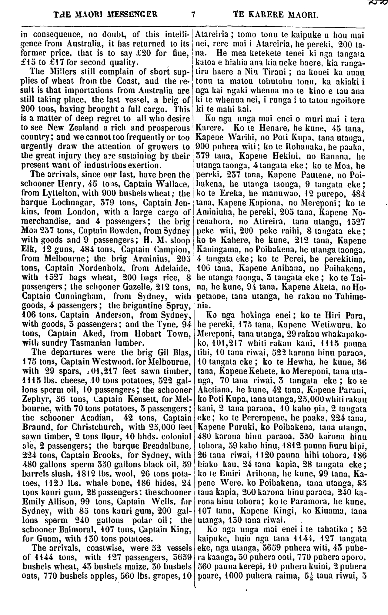 THE MAORI MESSENGER TE KARERE MAORI. in consequence, no doubt, of this intelli- gence from Australia, it has returned to its former price, that is to say £20 for fine, £15 to £17 for second quality. The Millers still complain of short sup- plies of wheat from the Coast, and the re- sult is that importations from Australia are still taking place, the last vessel, .1 brig of 200 tons, having brought a full cargo. This is a matter of deep regret to all who desire to see New Zealand a rich and prosperous country; and we cannot too frequently or too urgently draw the attention of growers to Ihe great injury they are sustaining by their present want of industrious exertion. The arrivals, since our last, have been the schooner Henry, 45 tons, Captain Wallace, from Lyttelton, with 900 bushels wheat; the barque Lochnagar, 579 tons, Captain Jen- kins, from London, with a large cargo of merchandise, and 4 passengers; the brig Moa 257 tons, Captain Bowden, from Sydney with goods and 9 passengers; H. M. sloop Elk, 12 guns, 484 tons, Captain Campion, from Melbourne; the brig Arminius, 203 tons, Captain Nordenholz, from Adelaide, with 1327 bags wheat, 200 bags rice, 8 passengers; the schooner Gazelle, 212 tons, Captain Cunningham, from Sydney with goods, 4 passengers; the brigantine Spray, 106 tons, Captain Anderson, from Sydney, with goods, 5 passengers; and the Tyne, 94 tons, Captain Aked, from Hobart Town, with sundry Tasmanian lumber. The departures were the brig Gil Blas, 175 tons, Captain Westwood. for Melbourne, with 29 spars, 101, 217 feet sawn timber, HI 5 Ibs. cheese, 15 tons potatoes, 522 gal- lons sperm oil, 10 passengers; the schooner Zephyr, 56 tons, Captain Kensett, for Mel- bourne, with 70 tons potatoes, 5 passengers; the schooner Acadian, 42 tons, Captain Braund, for Christchurch, with 23, 000 feet sawn timber, 2 tons flour, 10 hhds. colonial ale, 2 passengers; the barque Breadalbane, 224 tons, Captain Brooks, for Sydney, with 480 gallons sperm 530 gallons black oil, 59 barrels slush, 1812 Ibs. wool, 26 tons pota- toes, 1120 Ibs. whale bone, 186 hides, 24 tons kauri gum, 28 passengers: the schooner Emily Allison, 99 tons, Captain Wells, for Sydney, with 85 tons kauri gum, 200 gal- lons sperm 240 gallons polar oil; the schooner Balmoral, 107 tons, Captain King, for Guam, with 130 tons potatoes. The arrivals, coastwise, were 52 vessels of 1144 tons, with 427 passengers, 3659 bushels wheat, 45 bushels maize, 50 bushels oats, 770 bushels apples, 560 Ibs. grapes, 10 Atareiria; tomo tonu te kaipuke u hou mai nei, rere mai i Atareiria, he pereki, 200 ta- na. He mea ketekete tenei ki nga tangata katoa e hiahia ana kia neke haere, kia ranga- tira haere a Niu Tirani; na konei ka auau tonu ta matou tohutohu tonu, ka akiaki i nga kai ngaki whenua mo te kino e tau ana ki te whenua nei, i runga i to tatou ngoikore ki te mahi kai. Ko nga unga mai enei o muri mai i tera Karere. Ko te Henare, he kune, 45 tana, Kapene Warihi, no Poti Kupa, tana utanga, 900 puhera witi; ko te Rohanaka, he paaka, 579 tana, Kapene Hekini, no Ranana, he utanga taonga, 4 tangata eke; ko te Moa, he pereki, 257 tana, Kapene Pautene, no Poi- hakena, he utanga taonga, 9 tangata eke; ko te Ereka, he manuwao, 12 purepo, 484 tana, Kapene Kapiona, no Mereponi; ko te Aminiuha, he pereki, 203 tana, Kapene No- renahora, no Atireira. tana utanga, 1327 peke witi, 200 peke raihi, 8 tangata eke; ko te Kahere, he kune, 212 tana, Kapene Kaningama, no Poihakena, he utanga taonga, 4 tangata eke; ko Ie Perei, he perekitina, 106 tana, Kapene Anihana, no Poihakena, he utanga taonga, 5 tangata eke; ko te Tai- na, he kune, 9-4 tana, Kapene Aketa, no Ho- petaone, tana utanga, he rakau no Tahime- nia. Ko nga hokinga enei; ko te Hiri Para, he pereki, 175 tana, Kapene Wetiwuru. ko Mereponi, tana utanga, 29 rakau whakapako- ko, 101, 217 whiti rakau kani, 1115 pauna Uhi, 15 tana riwai, 52-2 karana hinu paraoa, 10 tangata eke; ko te Hewha, he kune, 56 tana, Kapene Kehete, ko Mereponi, tana uta- nga, 70 tana riwai, 5 tangata eke; ko te Aketiana, he kune, 42 tana, Kapene Parani, ko Poti Kupa, tana utanga, 25, 000 whiti rakau kani, 2 tana paraoa, 15 kaho pia, 2 tangata eke; ko te Pererapene, he paaka. 224 tana, Kapene Puruki, ko Poihakena, tana manga, 480 karona hinu paraoa, 530 karona hinu tohora, 59 kaho hinu, 1812 pauna huru hipi, 26 tana riwai, 1120 pauna hihi tohora, 186 hiako kau, 24 tana kapia, 28 tangata eke; ko te Emiri Arihona, he kune, 89 tana, Ka- pene Were, ko Poihakena, tana utanga, 80 tana kapia, 200 karona hinu paraoa, 240 ka- rona hinu tohora; ko te Paramora, he kune, 107 tana, Kapene Kingi, ko Kiuama, tana utanga, 150 tana riwai. Ko nga unga mai enei i te tahatika; 52 kaipuke, huia nga tana 1144, 127 tangata eke, nga utanga, 3659 puhera witi, 45 puhe- ra kaanga, 50 puhera ooti, 770 puhera aporo, 560 pauna kerepi, 10 puhera kuini, 2 puhera paare, 1000 puhera raima, 5½ tana riwai, 3
