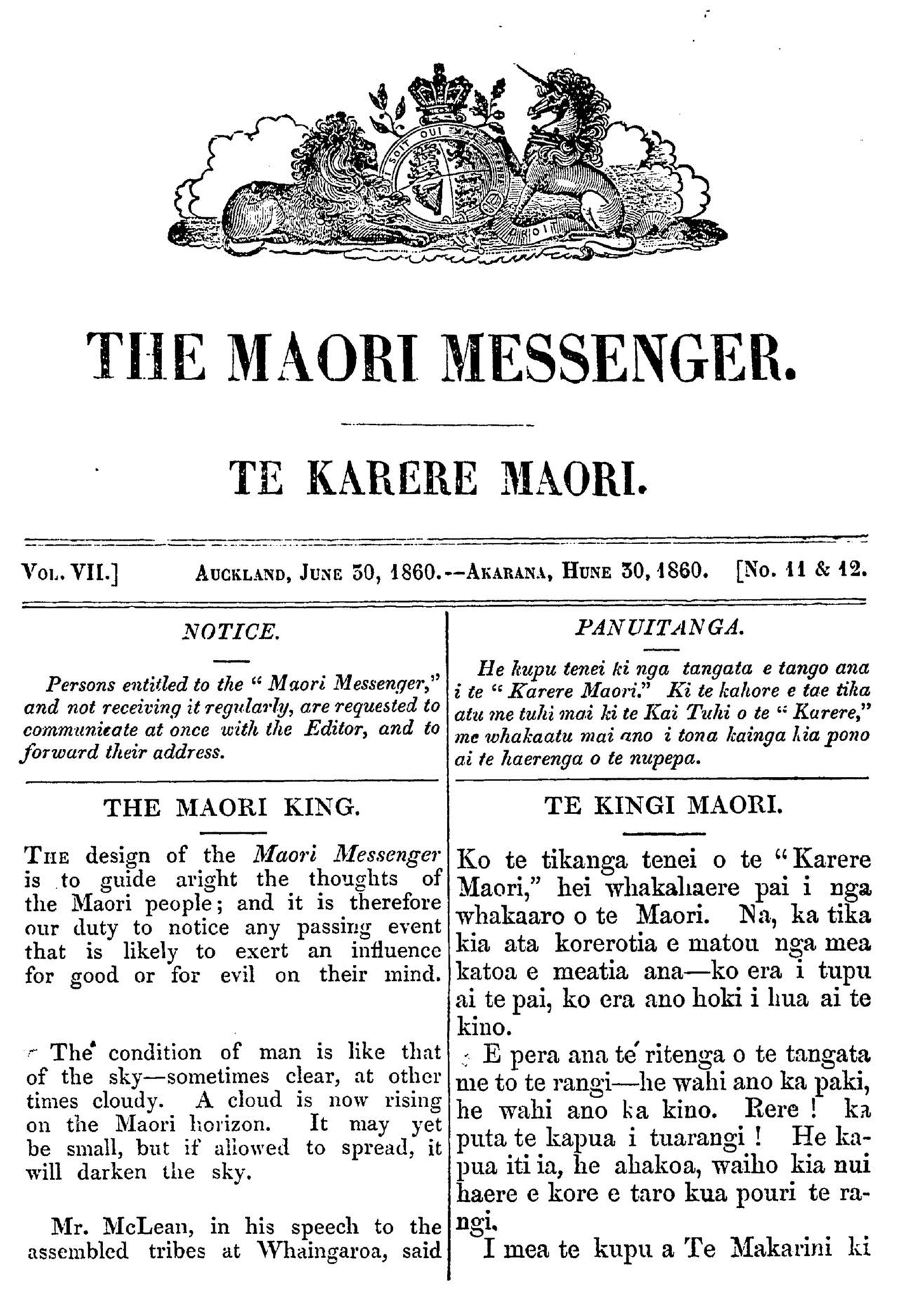 The Maori Messenger - Ko te Karere Maori 1855-1860: Volume 7, Number 11. 30 June 1860 |