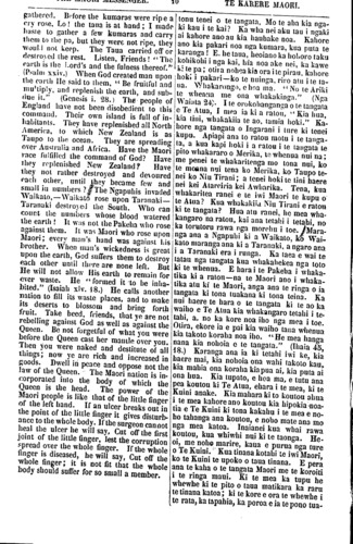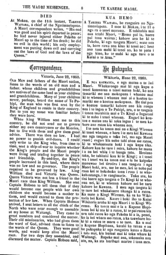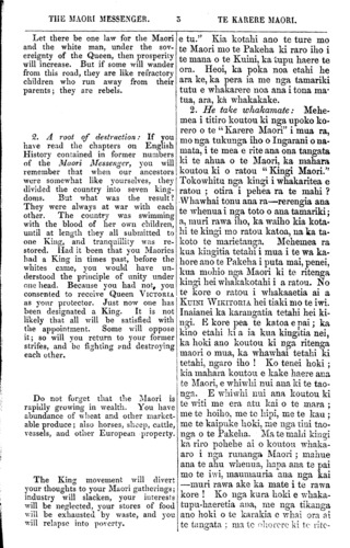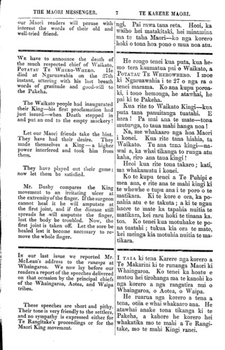 THE MAORI MESSENGER. 7 TE KARERE MAORI. our Maori readers will peruse with interest the words of their old and well-tried friend. WE have to announce the death of the much respected chief of Waikato, POTATAU TE WHERO-WHERO. He died at Ngaruawahia on the 27th instant, uttering with his last breath words of gratitude and good-will to the Pakeha. The Waikato people had inaugurated their King—his first proclamation had just issued—when Death stepped in and put an end to the empty mockery! Let our Maori friends take the hint. They have had their desire. They made themselves a King—a higher power interfered and took him from them. They have played out their game; now let them be satisfied. Mr. Busby compares the King movement to an irritating ulcer at the extremity of the finger. If the surgeon cannot heal it he will amputate at the first joint, and if the disease still spreads he will amputate the finger, lest the body he troubled. Now, the first joint is taken off. Let the sore be healed lest it become necessary to re- move the whole finger. IN our last issue we reported Mr. McLean's address to the runanga at Whaingaroa. We now lay before our readers a report of the speeches delivered on that occasion by the principal chiefs of the Whaingaroa, Aotea, and Waipa tribes. These speeches are short and pithy. Their tone is very friendly to the settlers, and no sympathy is expressed either for Te Rangitake's proceedings or for the Maori King movement. ngi. Pai rawa tana reta. Heoi, ka waiho hei matakitaki, hei minamina ma to taha Maori—ko nga korero hoki o toua hoa pono o mua noa atu. He rongo tenei kua puta, kua he- mo tera kaumatua pai o Waikato, a POTATAU TE WHEKOWHEKO. I moe ki Ngaruawahia i te 27 o nga ra o tenei marama. Ko aua kupu poroa- ki, i tono hemonga, he atavwhai, he pai ki te Pakeha. Kua rite to Waikato Kingi—kua puta tana panuitanga tuatahi. E hara! Pa mai ana te mate—tona mutunga, to taua mahi hanga noa! Na, me whakaaro nga hoa Maori i konei. Kua rite tana hiahia, ta Waikato. Tu ana tana kingi—na- wai a, ka whai tikanga to runga atu kaha, riro aua taua kingi! Heoi kua rite tona takaro; kati, me whakamutu i konei. Ko te kupu tenei a Te Puhipi e mea ana, e rite aua te mahi kingi ki te whewhe e tupu ana i te poro o te matikara. Ki te kore e ora, ka po- nahia atu e te takuta; a ki te ngau i haere te mate ka tapahia nuitia te matikara, kei raru hoki te tinana ka. toa. Ko tenei kua motuhake te po- ua tuatahi; tukua kia ora te mate, kei meinga kia motuhia nuitia te ma- tikara. I TAIA ki tena Karere nga korero a Te Makarini ki te runanga Maori ki Whaingaroa. Ko tenei ka hoatu e matou hei tirohanga ma te kanohi ko nga korero a nga rangatira nui o Whaingaroa, o Aotea, o Waipa. He ruarua nga korero a tena a tena, otiia e whai whakaaro ana. He atawhai anake tona tikanga ki te Pakeha, a kahore he korero hei whakatika mo te mahi a Te Rangi- take, mo te mahi Kingi ranei.