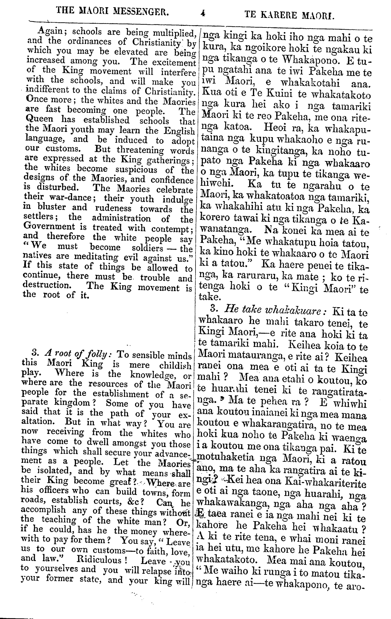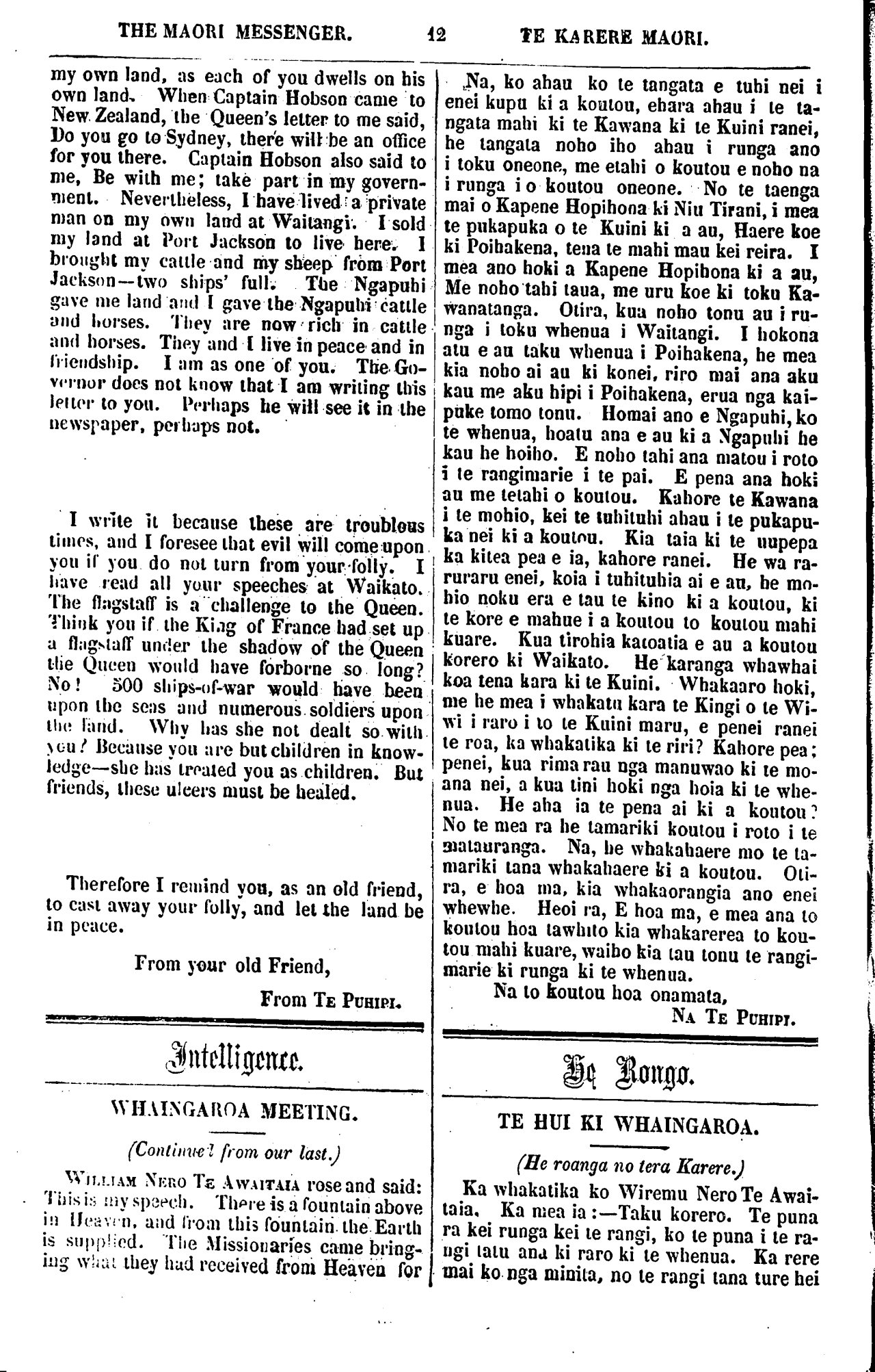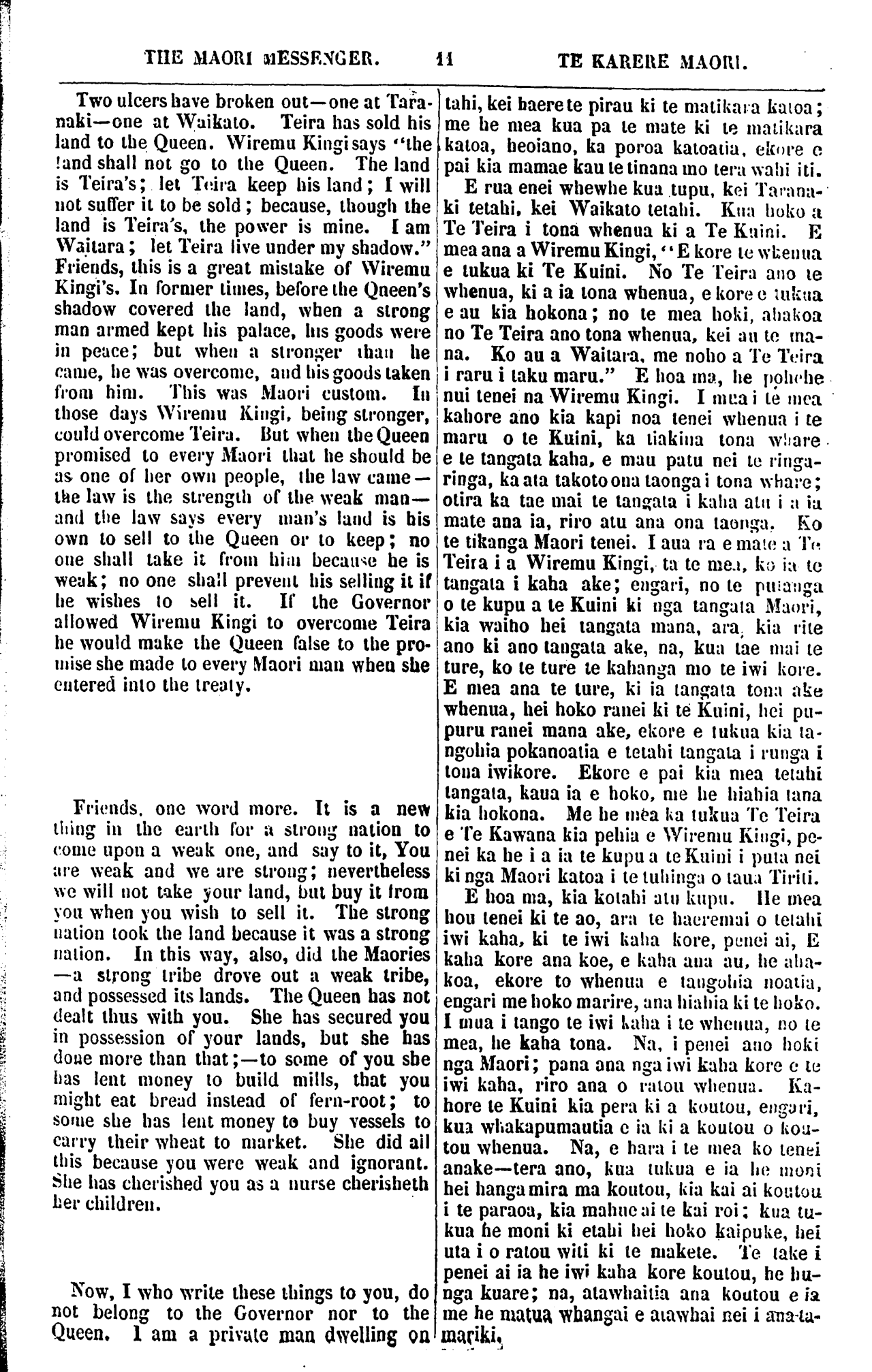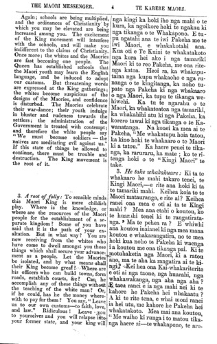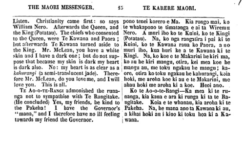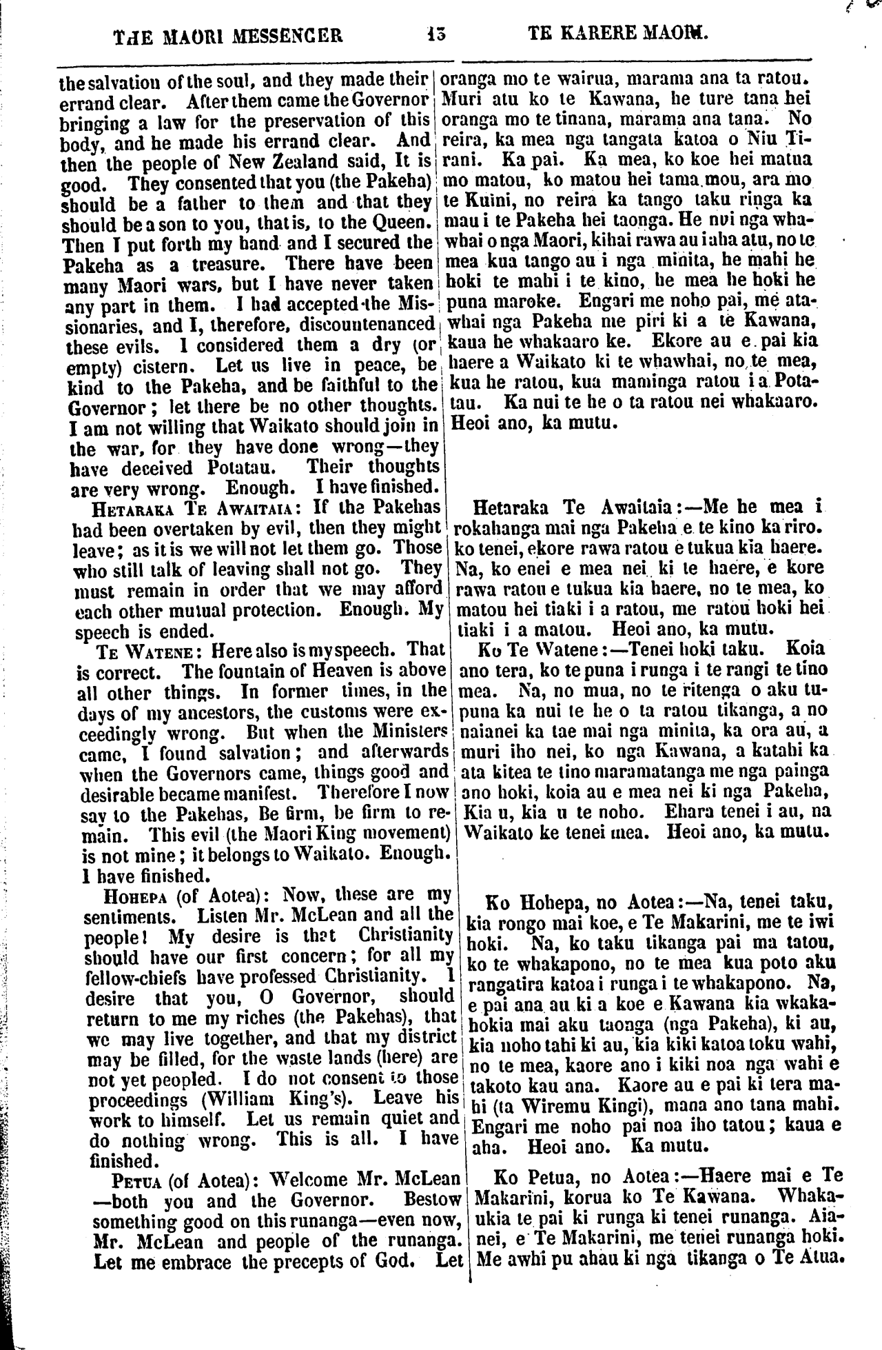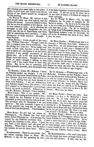 THE MAORI MESSENGER. TE KARERE MAORI. my own land, as each of you dwells on his own land. When Captain Hobson came to New Zealand, the Queen's letter to me said, Do you go to Sydney, there will be an office for you there. Captain Hobson also said to me, Be with me; take part in my govern- ment. Nevertheless, I have lived a private man on my own land at Waitangi. I sold my land at Port Jackson to live here. I brought my cattle and my sheep from Port Jackson—two ships' full. The Ngapuhi gave me land and I gave the Ngapuhi cattle and horses. They are now rich in cattle and horses. They and I live in peace and in friendship. I am as one of you. The Go- vernor does not know that I am writing this letter to you. Perhaps he will see it in the newspaper, perhaps not. I write it because these are troublous times, and I foresee that evil will come upon you if you do not turn from your-folly. I have read all your speeches at Waikato. The flagstaff is a challenge to the Queen. Think you if the King of France had set up a flagstaff under the shadow of the Queen the Queen would have forborne so long? No! 500 ships-of-war would have been upon the seas and numerous soldiers upon the land. Why has she not dealt so with you? Because you are but children in know- ledge—she has treated you as children. But friends, these ulcers must be healed. Therefore I remind you, as an old friend, to cast away your fully, and let the land be in peace. From your old Friend, From TE PUHIPI. WHAINGAROA MEETING. (Continued from our last.) WILLIAM NERO TE AWAITAIA rose and said: This is my speech. There is a fountain above in Heaven and from this fountain the Earth is supplied. The Missionaries came bring- ing what they had received from Heaven for Na, ko ahau ko te tangata e tuhi nei i enei kupu ki a koutou, ehara ahau i te ta- ngata mahi ki te Kawana ki te Kuini ranei, he tangata noho iho ahau i runga ano i toku oneone, me etahi o koutou e noho na i runga i o koutou oneone. No te taenga mai o Kapene Hopihona ki Niu Tirani, i mea te pukapuka o te Kuini ki a au, Haere koe ki Poihakena, tena te mahi mau kei reira. I mea ano hoki a Kapene Hopihona ki a au, Me noho tahi taua, me uru koe ki toku Ka- wanatanga. Otira, kua noho tonu au i ru- nga i toku whenua i Waitangi. I hokona atu e au taku whenua i Poihakena, he mea kia noho ai au ki konei, riro mai ana aku kau me aku hipi i Poihakena, erua nga kai- puke tomo tonu. Homai ano e Ngapuhi, ko te whenua, hoatu ana e au ki a Ngapuhi he kau he hoiho. E noho tahi ana matou i roto i te rangimarie i te pai. E pena ana hoki au me tetahi o koutou. Kahope te Kawana i te mohio, kei te tuhituhi ahau i te pukapu- ka nei ki a koumu. Kia taia ki te nupepa ka kitea pea e ia, kahore ranei. He wa ra- ruraru enei, koia i tuhituhia ai e an, be mo- hio noku era e tau te kino ki a koutou, ki te kore e mahue i a koutou to koutou mahi kuare. Kua tirohia katoatia e au a koutou korero ki Waikato. He karanga whawhai koa tena kara ki te Kuini. Whakaaro hoki, me he mea i whakatu kara te Kingi o te Wi- wi i raro i to te Kuini maru, e penei ranei te roa, ka whakatika ki te riri? Kahore pea; penei, kua rima rau nga manuwao ki te mo- ana nei, a kua tini hoki nga hoia ki te whe- nua. He aha ia te pena ai ki a koutou? No te mea ra he tamariki koutou i roto i te matauranga. Na, he whakahaere mo te ta- mariki tana whakahaere ki a koutou. Oti- ra, e hoa ma, kia whakaorangia ano enei whewhe. Heoi ra, E hoa ma, e mea ana to koutou hoa tawhito kia whakarerea to kou- tou mahi kuare, waiho kia tau tonu te rangi- marie ki runga ki te whenua. Na to koutou hoa onamata, NA TE PUHIPI. TE HUI KI WHAINGAROA. (He roanga no tera Karere.) Ka whakatika ko Wiremu Nero Te Awai- taia, Ka mea ia: Taku korero. Te puna ra kei runga kei te rangi, ko te puna i te ra- ngi tatu ana ki raro ki te whenua. Ka rere mai ko nga minita, no te rangi tana ture hei