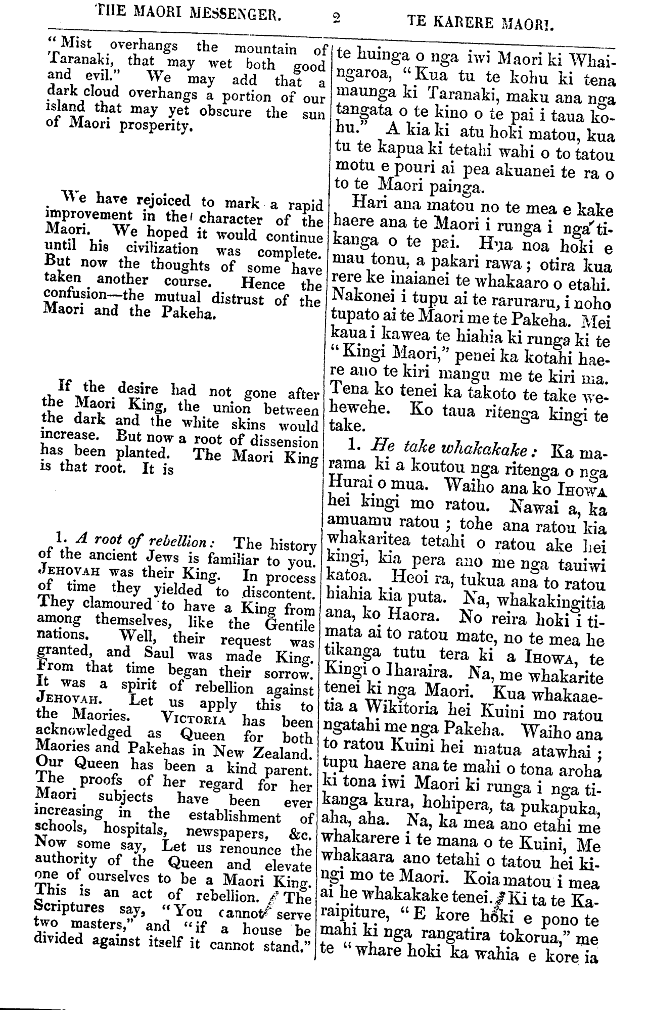 THE MAORI MESSENGER. 2 TE KARERE MAORI. " Mist overhangs the mountain of Taranaki, that may wet both good and evil." We may add that a dark cloud overhangs a portion of our island that may yet obscure the sun of Maori prosperity. We have rejoiced to mark a rapid improvement in the character of the Maori. We hoped it would continue until his civilization was complete. But now the thoughts of some have taken another course. Hence the confusion—the mutual distrust of the Maori and the Pakeha. If the desire had not gone after the Maori King, the union between the dark and the white skins would increase. But now a root of dissension has been planted. The Maori King is that root. It is 1. A root of rebellion: The history of the ancient Jews is familiar to you. JEHOVAH was their King. In process of time they yielded to discontent. They clamoured to have a King from among themselves, like the Gentile nations. Well, their request was granted, and Saul was made King. From that time began their sorrow. It was a spirit of rebellion against JEHOVAH. Let us apply this to the Maories. VICTORIA has been acknowledged as Queen for both Maories and Pakehas in New Zealand. Our Queen has been a kind parent. The proofs of her regard for her Maori subjects have been ever increasing in the establishment oi schools, hospitals, newspapers, &c. Now some say, Let us renounce the authority of the Queen and elevate one of ourselves to be a Maori King. This is an act of rebellion. The Scriptures say, "You cannot serve two masters," and "if a house be divided against itself it cannot stand." te huinga o nga iwi Maori ki Whai- ngaroa, "Kua tu te kohu ki tena maunga ki Taranaki, maku aua nga tangata o te kino o te pai i taua ko- hu." A kia ki atu hoki matou, kua tu te kapua ki tetahi wahi o to tatou motu e pouri ai pea akuanei te ra o to te Maori painga. Hari ana matou no te mea e kake haere aua te Maori i runga i nga ti- kanga o te pai. Hua noa hoki e mau tonu. a pakari rawa; oti ra kua rere ke inaianei te whakaaro o etahi. Nakonei i tupu ai te raruraru, i noho tupato ai te Maori me te Pakeha. Mei kaua i kawea te hiahia ki runga ki te " Kingi Maori," penei ka kotahi hae- re ano te kiri mangu me te km ma. Tena ko tenei ka takoto te take we- hewehe. Ko taua ritenga kingi te take. 1. He take whakakake: Ka ma- rama ki a koutou nga ritenga o nga Hurai o mua. Waiho aua ko IHOWA hei kingi mo ratou. Nawai a, ka amuamu ratou; tohe ana ratou. kia whakaritea tetahi o ratou ake hei kingi, kia pera ano me nga tauiwi katoa. Heoi ra, tukua ana to ratou. hiahia kia puta. Na, whakakingitia ana, ko Haora. No reira hoki i ti- mata ai to ratou mate, no te mea he tikanga tutu tera ki a IHOWA, te Kingi o Iharaira. Na, me whakarite tenei ki nga Maori. Kua whakaae- tia a Wikitoria, hei Kuini mo ratou ngatahi me nga Pakeha. Waiho ana to ratou Kuini hei matua atawhai; tupu haere ana te mahi o tona aroha ki tona iwi Maori ki runga i nga ti- kanga kura, hohipera, ta pukapuka, aha, aha. Na, ka mea ano etahi me whakarere i te mana o te Kuini, Me whakaaro ano tetahi o tatou hei ki- ngi mo te Maori. Koia matou i mea ai he whakakake tenei. Ki ta te Ka- raipiture, " E kore hoki e pono te mahi ki nga rangatira tokorua," me te " whare hoki ka wahia e kore ia