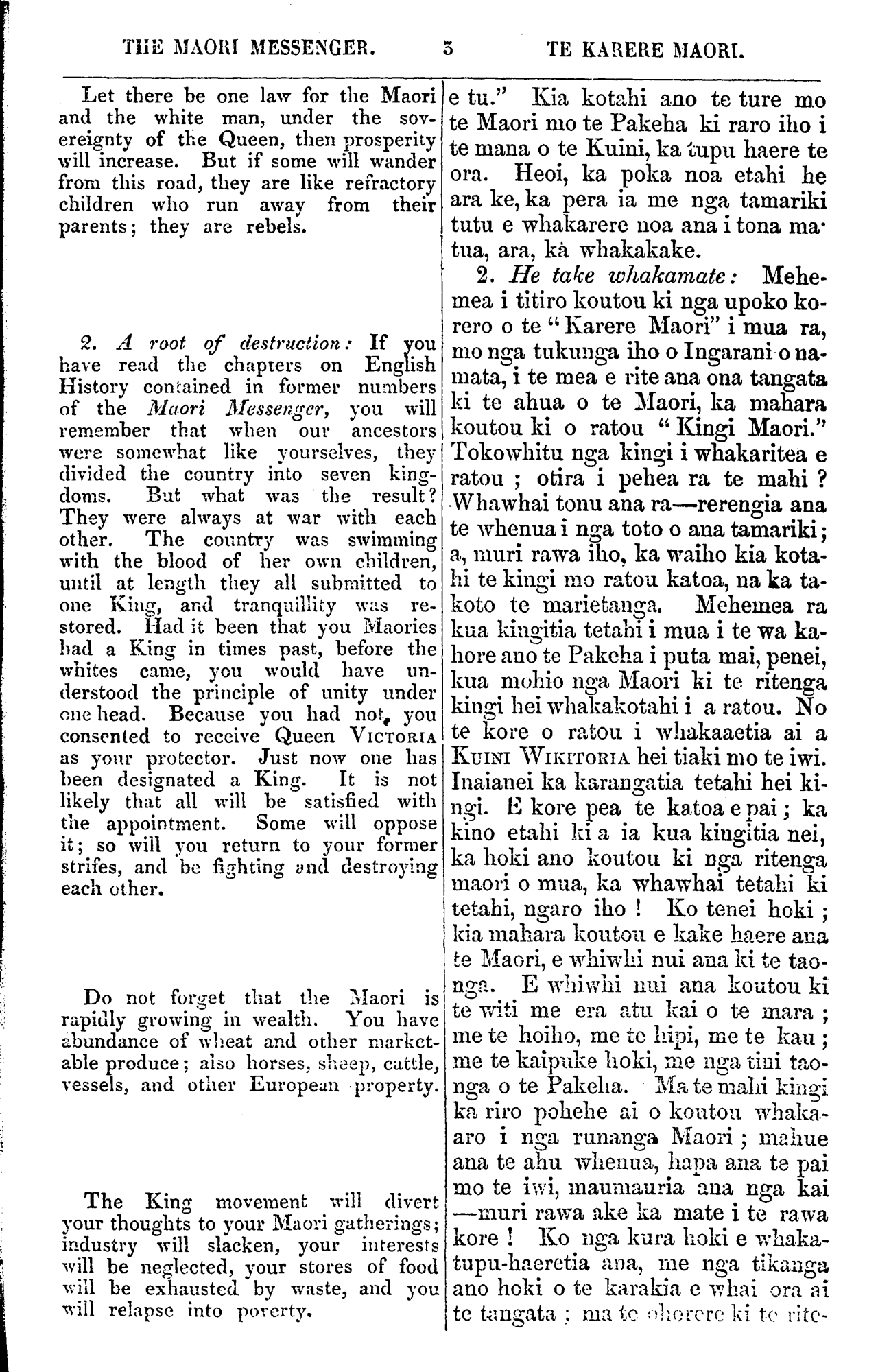 THE MAORI MESSENGER. 3 TE KARERE MAORI. Let there be one law for the Maori and the white man, under the sov- ereignty of the Queen, then prosperity, will increase. But if some will wander from this road, they are like refractory children who run away from their parents; they are rebels. 2. A root of destruction: If you have read the chapters on English History contained in former numbers of the Maori Messenger, you will remember that when our ancestors were somewhat like yourselves, they divided the country into seven king- doms. But what was the result? They were always at war with each other. The country was swimming with the blood of her own children, until at length they all submitted to one King, and tranquillity was re- stored. Had it been that you Maories had a King in times past, before the whites came, you would have un- derstood the principle of unity under one head. Because you had not, you consented to reccive Queen VICTORIA as your protector. Just now one has been designated a King. It is not likely that all will be satisfied with the appointment. Some will oppose it; so will you return to your former strifes, and be fighting and destroying each other. Do not forget that the Maori is rapidly growing in wealth. You have abundance of wheat and other market- able produce; also horses, sheep, cattle, vessels, and other European property. The King movement will divert your thoughts to your Maori gatherings; industry will slacken, your interests will be neglected, your stores of food will be exhausted by waste, and you will relapse into poverty. e tu." Kia kotahi ano te ture mo te Maori mo te Pakeha ki raro iho i te maua o te Kuini, ka tupu haere te ora. Heoi, ka poka noa etahi he ara ke, ka pera ia me nga tamariki tutu e whakarere noa ana i tona ma- tua, ara, ka whakakake. 2. He take whakamate: Mehe- mea i titiro koutou ki nga upoko ko- rero o te " Karere Maori" i mua ra, mo nga tukunga iho o Ingarani o na- mata, i te mea e rite ana ona tangata ki te ahua o te Maori, ka mahara koutou ki o ratou " Kingi Maori." Tokowhitu. nga kingi i whakaritea e ratou; otira i pehea ra te mahi? Whawhai tonu ana ra—rerengia ana te whenua i nga toto o aua tamariki; a, muri rawa iho, ka waiho kia kota- hi te kingi mo ratou katoa, ua ka ta- koto te marietanga. Mehemea ra kua kingitia tetahi i mua i te wa ka- hore ano te Pakeha i puta mai, penei, kua mohio nga Maori ki te ritenga kingi hei whakakotahi i a ratou. No te kore o ratou i whakaaetia ai a KUINI WIKITORIA hei tiaki mo te iwi. Inaianei ka karangatia tetahi hei ki- ngi. E kore pea te katoa e pai; ka kino etahi ki a ia kua kingi tia nei, ka hoki ano koutou ki nga ritenga maori o mua, ka whawhai tetahi ki tetahi, ngaro iho! Ko tenei hoki; kia mahara koutou e kake haere aua te Maori, e whiwhi nui aua ki te tao- nga. E whiwhi nui ana koutou ki te witi me era atu kai o te mara; me te hoiho, me te hipi, me te kau; me te kaipuke hoki, me nga tini tao- nga o te Pakeha. Ma te mahi kingi ka riro pohehe ai o koutou whaka- aro i nga runanga Maori; mahue ana te ahu whenua, hapa ana te pai mo te iwi, maumauria ana nga kai —muri rawa ake ka mate i te rawa kore! Ko nga kura hoki e whaka- tupu-haeretia ana, me nga tikanga ano hold o te karakia e whai ora ai te tangata; ma te ohorere ki te rite-
