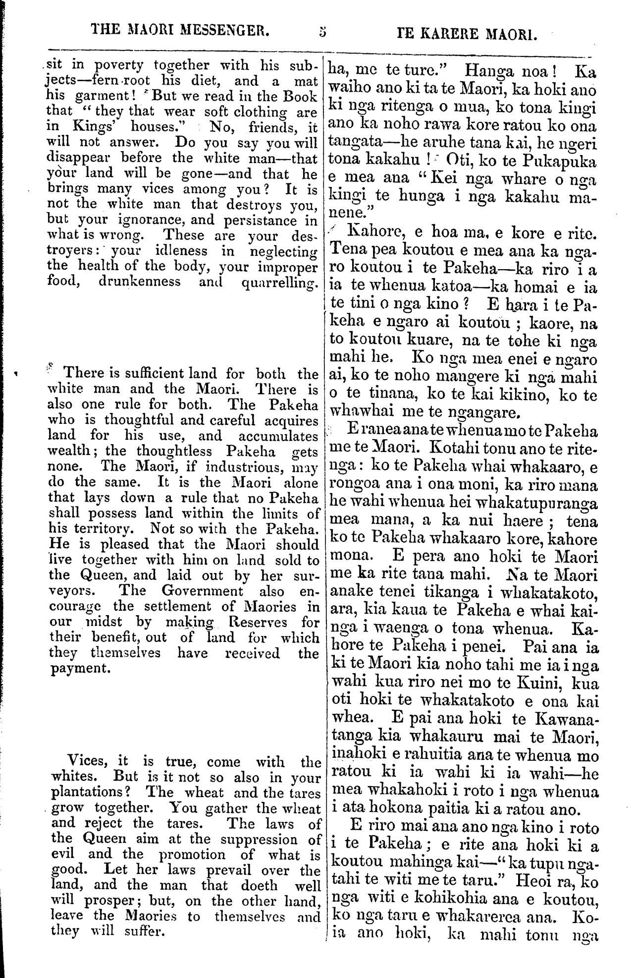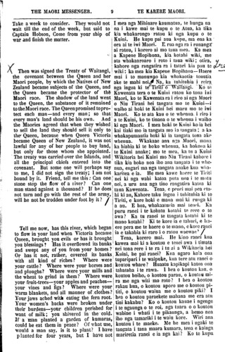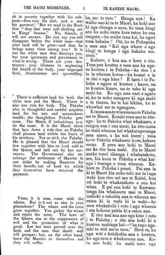 THE MAORI MESSENGER. TE KARERE MAORI. Take a week to consider. They would not wait till the end of the week, but said to Captain Hobson, Come from your ship of war and finish the matter. A Then was signed the Treaty of Waitangi, the covenant between the Queen and her Maori people, by which the Natives of New Zealand became subjects of the Queen, and the Queen became the protector of the Maori race. The shadow of the land went to the Queen, the substance of it remained to the Maori race. The Queen promised to pro- tect each man—and every man; so that every man's land should be his own. And the Maories agreed that when they wished to sell the land they should sell it only to the Queen, because when Queen Victoria became Queen of New Zealand, it was not lawful for any of her people to buy land, but only for those whom she appointed. The treaty was carried over the Islands, and all the principal chiefs entered into the covenant. But some one will perhaps say to me, I did not sign the treaty; I am not bound by it. Friend, tell me this: Can one stone slop the flow of a liver? Can one man stand against a thousand? If he does! not turn and go with the rest of the army, will he not be trodden under fool by it? Tell me now, has this river, which began to flow in your land when Victoria became Queen, brought you evils or has it brought you blessings? Has it overflowed its banks and swept any of you from your homes? Or has it not, rather, covered its banks with all kind of riches? Where were your cattle? Where were your horses and and ploughs? Where were your mills and the wheat to grind in them? Where were your fruit-trees—your apples and peaches— your vines and figs? Where were your warm blankets, and all manner of clothes? Your jaws ached with eating the fern root. Your women's backs were broken under their burdens—your children perished for want of milk; you shivered in the cold. If a man planted a garden of kumaras, could be eat them in peace? Of what use, would a man say, is it to plant? I have planted for four years, but I have not I mea nga Mihinare kaumatua, te hunga na na i kawe mai te kupu o te Atua, ka tika kia whakarongo ratou ki nga kupu o te Kuini. He kupu pai aua kupu, ma ena ha ora ai te iwi Maori. E. rua nga ra i runanga ai ratou, i korero ai mo taua mea. Ka mea a Kapene Hopihona, kia kotahi wiki, me ata whakaaroaro i roto i taua wiki; otira, kahore nga rangatira ra i tatari kia pau te wiki: ka mea kia Kapene Hopihana Haere mai i to manuwao kia whakaotia tonutia ake te mahi nei. Na, ka tuhituhia i reira nga ingoa ki te Tiriti o Waitangi. Ko te Kawenata tera o te Kuini ratou ko tona iwi Maori, ko te Kawenata ra i riro ai nga Maori o Niu Tirani hei tangata mo le Kuini—i waiho ai hoki te Kuini hei maru mo te iwi Maori. Ko te ata kau o te whenua, i riro i a te Kuini, ko te tinana o te whenua i waiho ki nga Maori. I mea hoki te Kuini ko ia hei kai tiaki mo ia tangata mo in tangata; a ka whakapumautia hoki ki ia tangata tona ake whenua. Wkakaae ana nga Maori, mana ka hiahia ki te hoko whenua, ka hokona ki te Kuini anake; mo te moa, ka tu a Kuini Wikitoria hei Kuini mo Niu Tirani kahore i tika kia hoko noa iho ana tangta i te whe- nua, engari manga tangata anake kua wha- karitea e ia. He mea kawe haere te Tiriti nei ki nga wahi katoa puta noa i te motu nei, a uru ana nga tino rangatira katoa ki taua Kawenata. Tena. e penei mai pea eta- hi ki an, Kahore taku ingoa i tuhituhia ki te Tiriti, e kore hoki e mana mai ki runga ki a au. E hoa, whakaaturia mai tenei. Ka puru ranei i te kohatu kotahi te rere o te awa? Ka tu ranei te tangata kotahi ki te mano kotahi? Ki te kore ia e tahuri, e ha- ere pera me te haere o te mano, e kore ranei ia e takahia ki raro i o ratou waewae Tena, korero mai. He kino ranei kua kawea mai ki a koutou e tenei awa i timata nei tona rere i te ra i tu ai a Wikitoria hei Kuini, he pai ranei? Kua ngaro koia ona tuparipari i te waipuke, kua tere atu ranei o koutou whare? Huaatu kapikapi katoa ona tahataha i te rawa. 1 hea o koutou kau, o koutou hoiho, o koutou parau, o koutou mi- ra me nga witi mo roto? 1 hea o koutou rakau hua, o koutou aporo me o koutou pi- titi, o koutou waiua me o koutou piki? I hea o koutou paraekete mahana me era atu tini kakahu? Ko o koutou kauae i ngenge i te ngaunga o te roi, nga tuara o o koutou wahine i whati i te pikaunga, a hemo noa iho nga tamariki i te waiu kore. Wiri ana koutou i te maeke. Me he mea i ngaki te tangata i tana maara kumara, tena e kainga mariretia ranei e ia nga kai? Ko te kupu