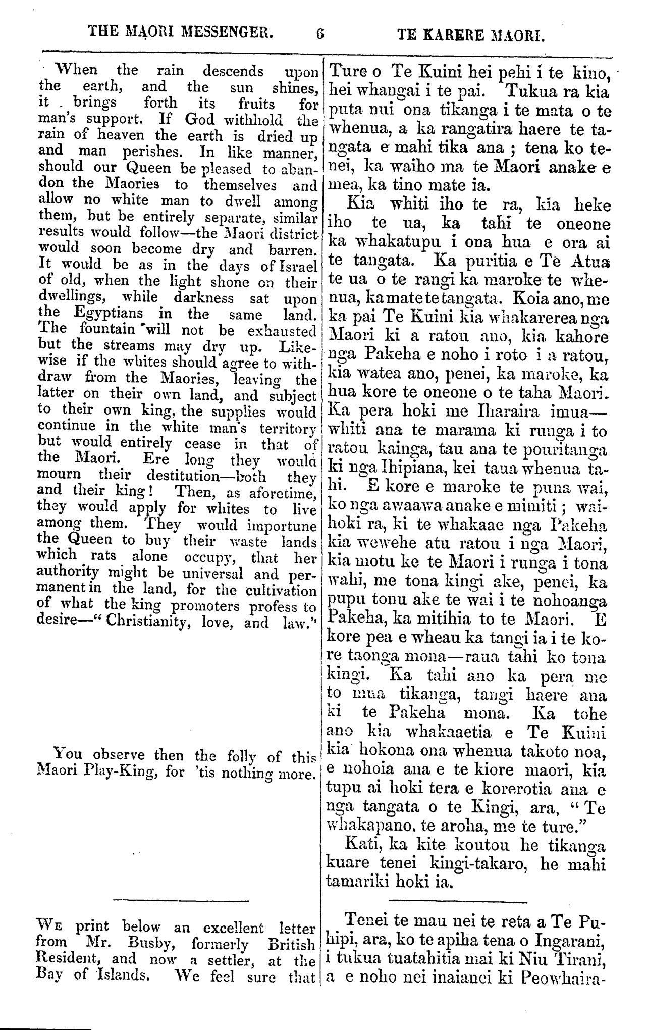 THE MAORI MESSENGER. 6 TE KARERE MAORI. When the rain descends upon the earth, and the sun shines, it brings forth its fruits for man's support. If God withhold the rain of heaven the earth is dried up and man perishes. In like manner, should our Queen be pleased to aban- don the Maories to themselves and allow no white man to dwell among them, but be entirely separate, similar results would follow—the Maori district would soon become dry and barren. It would be as in the days of lsrael of old, when the light shone on their dwellings, while darkness sat upon the Egyptians in the same land. The fountain "will not be exhausted but the streams may dry up. Like- wise if the whites should agree to with- draw from the Maories, leaving the latter on their own land, and subject to their own king, the supplies would continue in the white man's territory but would entirely cease in that of the Maori. Ere long they would mourn their destitution—both they and their king! Then, as aforetime, they would apply for whites to live among them. They would importune the Queen to buy their waste lands which rats alone occupy, that her authority might be universal and per- manent in the land, tor the cultivation of what the king promoters profess to desire—" Christianity, love, and law.'' You observe then the folly of this Maori Play-King, for 'tis nothing more. WE print below an excellent letter from Mr. Busby, formerly British Resident, and now a settler, at the Bay of Islands. We feel sure that Ture o Te Kuini hei pehi i te kino, hei whangai i te pai. Tukua ra kia puta nui ona tikanga i te mata o te whenua, a ka rangatira haere te ta- ngata e mahi tika ana; tena ko te- nei, ka waiho ma te Maori anake e mea, ka tino mate ia. Kia whiti iho te ra, kia heke iho te na, ka tahi te oneone ka whakatupu i ona hua e ora ai te tangata. Ka puritia e Te Atua te ua o te rangi ka maroke te whe- nua, ka mate te tangata. Koia ano, me ka pai Te Kuini kia whakarerea nga Maori ki a ratou ano, kia kahore nga Pakeha e noho i roto i a ratou, kia watea ano, penei, ka ma roke, ka hua kore te oneone o te taha Maori. Ka pera hoki me Iharaira imua— whiti ana te marama ki runga i to ratou. kainga, tau ana te pouritanga ki nga Ihipiana, kei taua whenua ta- hi. E kore e maroke te puna wai, ko nga awaawa anake e mimiti; wai- hoki ra, ki te whakaae nga Pakeha kia wewehe atu ratou i nga Maori, kia motu ke te Maori i runga i tona wahi, me toua kingi ake, penei, ka pupu tonu ake te wai i te nohoanga Pakeha, ka mitihia to te Maori. E kore pea e wheau ka tangi ia i te ko- re taonga mona—raua tahi ko tona kingi. Ka tahi ano ka pera me to mua tikanga, tangi haere ana ki te Pakeha mona. Ka tohe ano kia whakaaetia e Te Kuini kia hokona ona whenua takoto noa, e nohoia aua e te kiore maori, kia tupu ai hoki tera e korerotia ana o nga tangata o te Kingi, ara, " Te whakapono, te aroha, me te ture." Kati, ka kite koutou he tikanga kuare tenei kingi-takaro, he mahi tama riki hoki ia. Tenei te mau nei te reta a Te Pu- hipi, ara, ko te apiha tena o Ingarani, i tukua tuatahitia mai ki Niu Tirani, a e noho nei inaianei ki Peowhaira-
