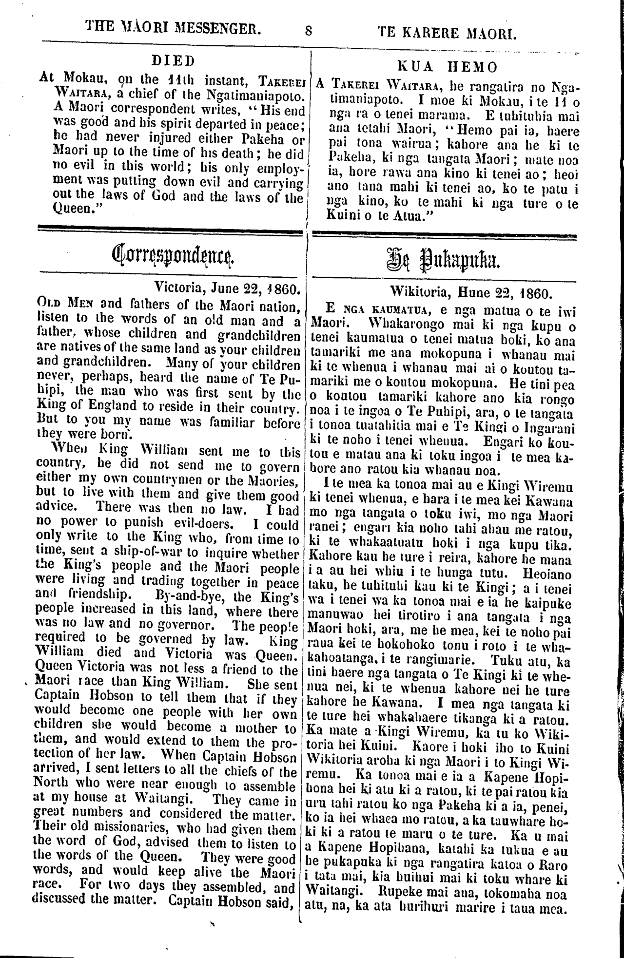 THE MAORI MESSENGER. 8 TE KARERE MAORI. DIED At Mokau, 911 the 11th instant, TAKEREI WAITARA, a chief of the Ngatimaniapoto. A Maori correspondent writes, "His end was good and his spirit departed in peace; he had never injured either Pakeha or Maori up to Ihe lime of his death; he did no evil in this world; his only employ- ment was pulling down evil and carrying out the laws of God and the laws of the Queen." Correspondence Victoria, June 22, 1860. OLD MEN and fathers of the Maori nation, listen to the words of an old man and a father, whose children and grandchildren are natives of the same land as your children and grandchildren. Many of your children never, perhaps, heard the name of Te Pu- hipi, Ihe man who was first sent by the King of England to reside in their country. But to you my name was familiar before they were born. Whenn King William sent me to this country, he did not send me to govern eithereither my own countrymencountrymen or thethe Maories, but to live with them and give them good advice. There was then no law. I had no power to punish evil-doers. I could only write to the King who, from time to lime, sent a ship-of-war to inquire whether the King's people and the Maori people were living and trading together in peace and friendship By-and-bye, the King's people increased in this land, where there was no law and no governor. The people required to be governed by law. King William died and Victoria was Queen. Queen Victoria was not less a friend to the Maori race than King William. She sent Captain Hobson to tell them that if they would become one people with her own children she would become a mother to them, and would extend to them the pro- tection of her law. When Captain Hobson arrived, I sent letters to all the chiefs of the North who were near enough to assemble at my house at Waitangi. They came in great numbers and considered the matter. Their old missionaries, who had given them the word of God, advised them to listen to the words of the Queen. They were good words, and would keep alive the Maori race. For two days they assembled, and discussed the matter. Captain Hobson said, KUA HEMO A TAKEREI WAITARA, he rangatira no Nga- timaniapoto. I moe ki Mokau, i te 11 o nga ra o tenei marama. E tuhituhia mai ana tetahi Maori, "Hemo pai ia, haere pai tona wairua; kahore ana he ki te Pakeha, ki nga tangata Maori; mate noa ia, kore rawa ana kino ki tenei ao; heoi ano tana mahi ki tenei ao, ko te patu i nga kino, ko te mahi ki nga ture o te Kuini o te Atua." Wikitoria, Hune 22, 1860. E NGA KAUMATUA, e nga matua o te iwi Maori. Whakarongo mai ki nga kupu o tenei kaumatua o tenei mama hoki, ko ana tamariki me ana mokopuna i whanau mai ki te whenua i whanau mai ai o koutou ta- mariki me o koutou mokopuna. He tini pea o koutou tamariki kahore ano kia rongo noa i te ingoa o Te Puhipi, ara, o te tangata i tonoa tuatahitia mai e Te Kingi o Ingarani ki te noho i tenei whenua. Engari ko kou- tou e matau ana ki toku ingoa i te mea ka- hore ano ratou kia whanau noa. I te mea ka tonoa mai au e Kingi Wiremu ki tenei whenua, e hara i te mea ke; Kawana mo nga tangata o toku iwi, mo nga Maori ranei; engari kia noho tahi ahau me ratou, ki te whakaatuatu hoki i nga kupu tika. Kahore kau he ture i reira, kahore he mana i a au hei whiu i te hunga tutu. Heoiano taku, he tuhituhi kau ki te Kingi; a i tenei wa i tenei wa ka tonoa mai e ia he kaipuke manuwao hei tirotiro i ana tangata i nga Maori hoki, ara, me he mea, kei te noho pai raua kei te hokohoko tonu i roto i te wha- kahoatanga. i te rangimarie. Tuku atu, ka tini haere nga tangata o Te Kingi ki te whe- nua nei, ki te whenua kahore nei he ture kahore he Kawana. I mea nga tangata ki te ture hei whakahaere tikanga ki a ratou. Ka mate a Kingi Wiremu, ka tu ko Wiki- toria hei Kuini. Kaore i hoki iho to Kuini Wikitoria aroha ki nga Maori i to Kingi Wi- remu. Ka tonoa mai e ia a Kapene Hopi- hona hei ki atu ki a ratou, ki te pai ratou kia uru tahi ratou ko nga Pakeha ki a ia, penei, ko ia hei whaea mo ratou, a ka tauwhare ho- ki ki a ratou te maru o te ture. Ka u mai a Kapene Hopihana, katahi ka tukua e au he pukapuka ki nga rangatira katoa o Karo i tata mui, kia huihui mai ki toku whare ki Waitangi. Rupeke mai ana, tokomaha noa atu, na, ka ata hurihuri marire i taua mea.