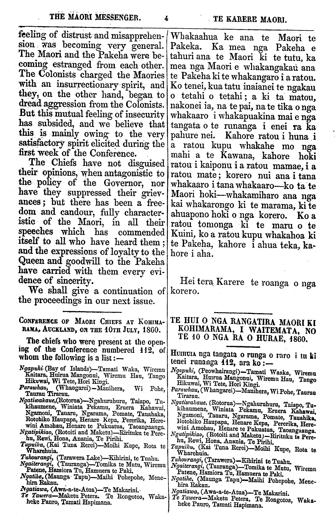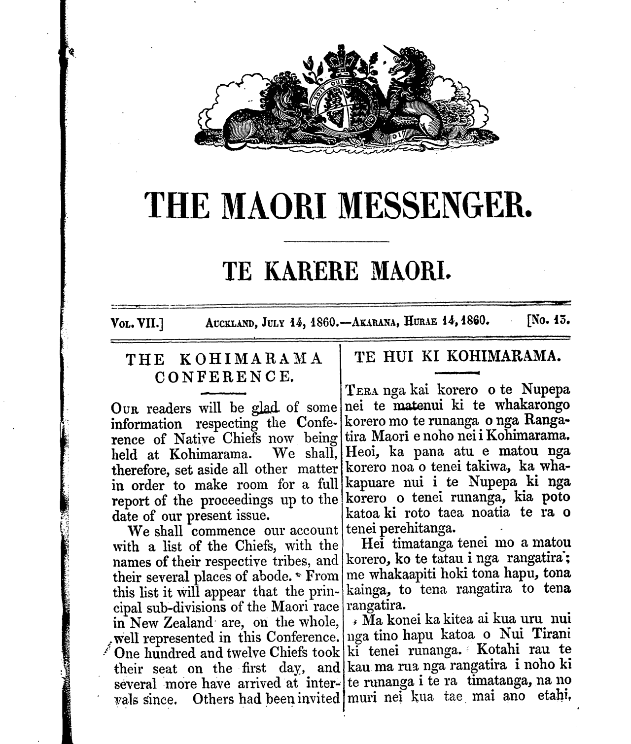 THE MAORI MESSENGER. TE KARERE MAORI. VOL. VII.] AUCKLAND, JULY 14, I860.—AKARANA, HURAE 14, 1860. [No. 1. THE KOHIMARAMA CONFERENCE. OUR readers will be glad. of some information respecting the Confe- rence of Native Chiefs now being held at Kohimarama. We shall, therefore, set aside all other matter in order to make room for a full report of the proceedings up to the date of our present issue. We shall commence our account with a list of the Chiefs, with the names of their respective tribes, and their several places of abode. From this list it will appear that the prin- cipal sub-divisions of the Maori race in New Zealand are, on the whole, well represented in this Conference. One hundred and twelve Chiefs took their seat on the first day, and several more have arrived at inter- vals since. Others had been invited TE HUI KI KOHIMARAMA. TERA nga kai korero o te Nupepa nei te matenui ki te whakarongo korero mo te runanga o nga Ranga- tira Maori e noho nei i Kohimarama. Heoi, ka pana atu e matou nga korero noa o tenei takiwa, ka wha- kapuare nui i te Nupepa ki nga korero o tenei runanga, kia poto katoa ki roto taea noatia te ra o tenei perehitanga. Hei timatanga tenei mo a matou korero, ko te tatau i nga rangatira; me whakaapiti hoki tona hapu, tona kainga, to tena rangatira to tena rangatira. Ma konei ka kitea ai kua uru nui nga tino hapu katoa o Nui Tirani ki tenei runanga. Kotahi rau te kau ma rua nga rangatira i noho ki te runanga i te ra timatanga, na no muri nei kua tae mai ano etahi,