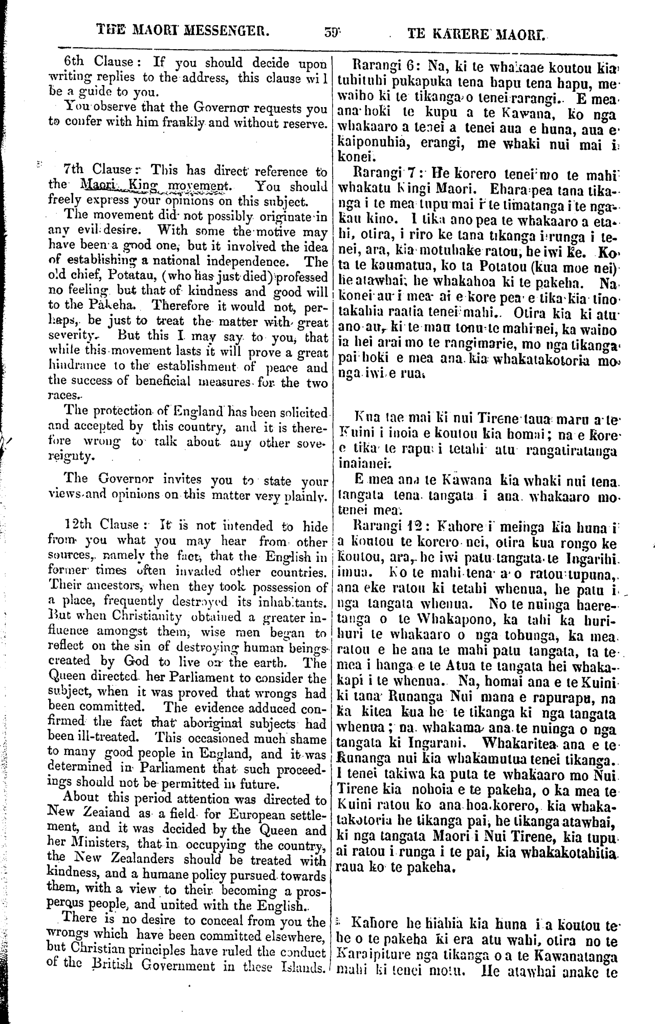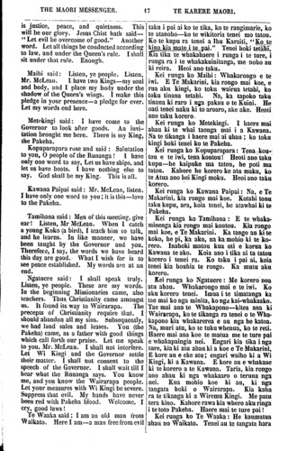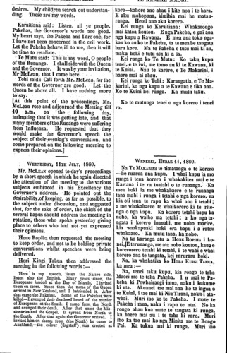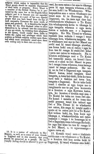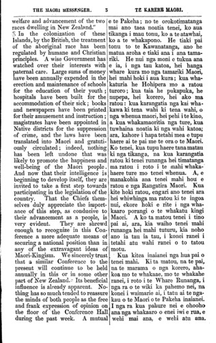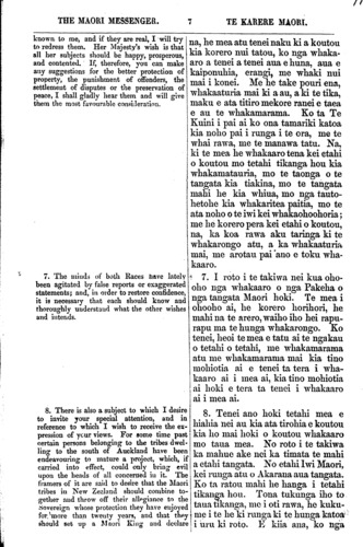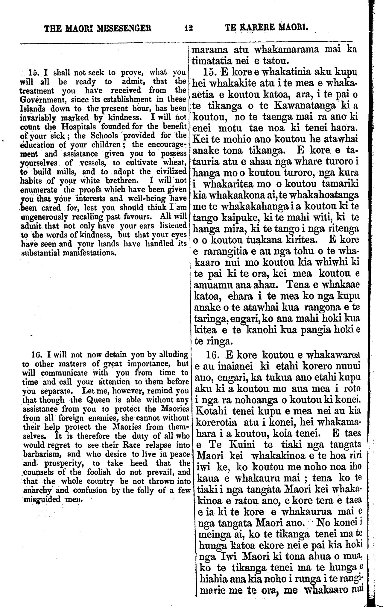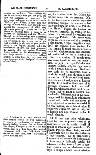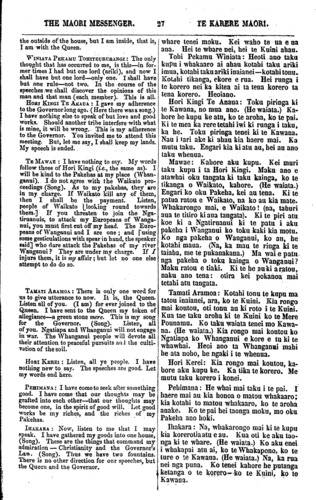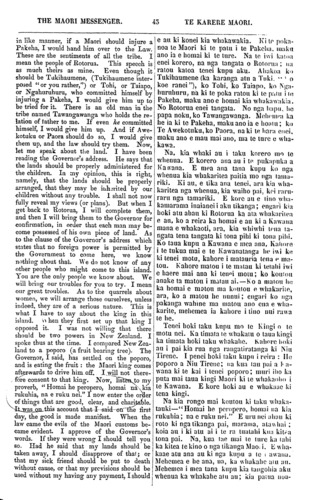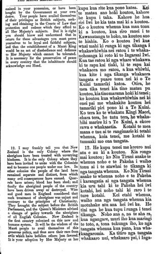 mained in your possession, or have been bought by the Government at your own desire. Your people have availed themselves of their privileges as British subjects, seek- ing and obtaining in the Courts of Law that protection and redress which they afford to all Her Majesty's subjects. But it is right you should know and understand that in return for these advantages you must prove yourselves to be loyal and faithful subjects, and that the establishment of a Maori King would be an act of disobedience and defiance to Her Majesty which cannot be tolerated. It is necessary for the preservation of peace in every country that the inhabitants should acknowledge one Head, 12. I may frankly tell you that New Zealand is the only Colony where the aborigines have been treated with unvarying kindness. It is the only Colony where they have been invited to unite with the Colonists and to become one people under one law. In other colonies the people of the land have remained separate and distinct, from which many evil consequences have ensued. Quar- rels have arisen; blood has been shed; and finally the aboriginal people of the country have been driven away or destroyed. Wise and good men in England considered that such treatment of aborigines was unjust and contrary to the principles of Christianity. They brought the subject before the British Parliament, and the Queen's Ministers advised a change of policy towards the aborigines of all English Colonies. New Zealand is the first country colonised on this new and humane system. It will be the wisdom of the Maori people to avail themselves of this generous policy, and thus save their race from evils which have befallen others less favored. It is your adoption by Her Majesty as her kupu kua rite kua pono katoa. Kei te matau ano hoki koutou, kahore he kupu i taka. Kahore he hoa riri Iwi ke kia tata mai ki a koutou. Ko o koutou whenua kua mau tonu ki a koutou, kua riro ranei i te Kawanatanga te hoko, na koutou ano te hiahia. Ko o koutou Iwi kua whai mahi ki runga ki nga tikanga i whakawhiwhia nei ratou i te whaka- nohoanga ki roto ki to Ingarani Iwi. Kua tae ratou ki nga whare whakawa ki te rapu kai tiaki, Id te rapu kai whakaora mo ratou, a kua whiwhi, kua kite i nga tikanga whakaora tangata e puare tonu nei ki o Te Kuini tamariki katoa. Otira, he mea tika tenei kia tino matau pu koutou, kia tino marama hoki ki tenei; ko koutou kua whakawhiwhia nei ki enei pai me whakakite koutou hei tamariki piri pono ki a Te Kuini. Ko tera ko te whakatu Kingi Maori, ehara tera, he tutu tera he whaka- hihi marire ki a Te Kuini, a ekore rawa e whakaaetia, Kotahi te mea mana e tau ai te rangimarie ki tetahi whenua, koia tenei, me kotahi te tumuaki mo ona tangata. 12. He kupu tenei me korero nui atu e au ki a koutou. Kia rongo mai koutou; ko Niu Tirani anake te whenua noho e te Pakeha i waiho tonu ai i te atawhai te tikanga ki nga tangata whenua. Ko Niu Tirani anake te whenua noho e te Pakeha i karangatia ai nga tangata whenua kia uru tahi ki te Pakeha hei iwi kotahi, hei noho tahi ki raro i te ture kotahi. Kei etahi whenua, waiho ana nga tangata whenua kia motuhake atu ana hei iwi ke. He tini nga he kua tupu i runga i tenei tikanga. Noho ana a, na te aha ra, kua ngangare, muri iho kua maringi te toto, a, tona tukunga iho, ko nga tangata whenua kua pana, kua wha- kangaromia. Ka titiro nga tangata whakaaro nui, whakaaro pai, i Inga-