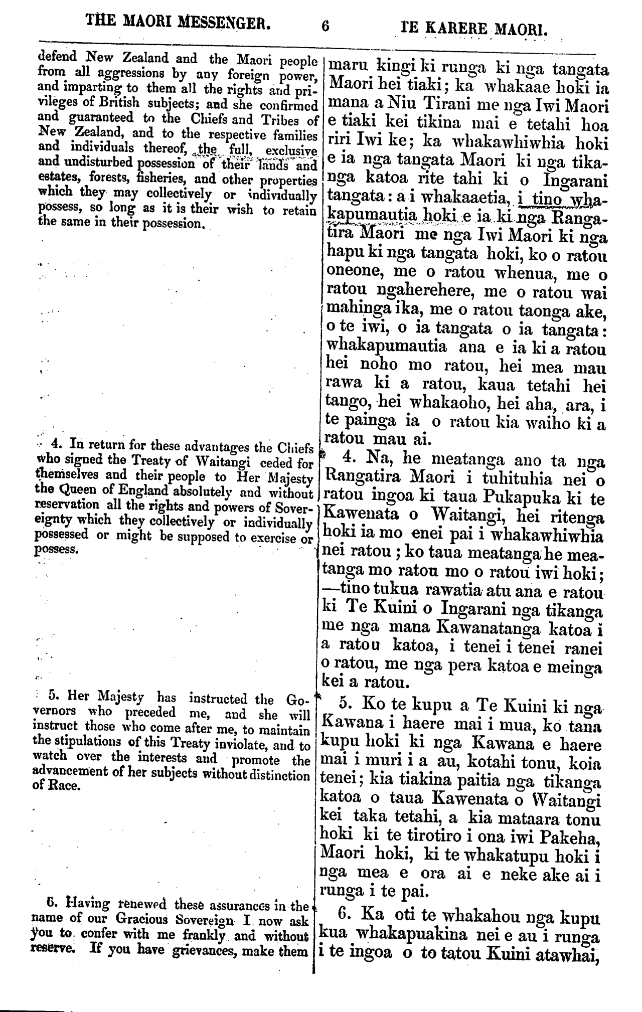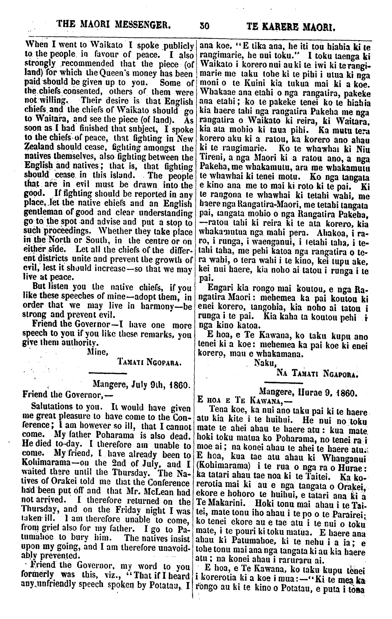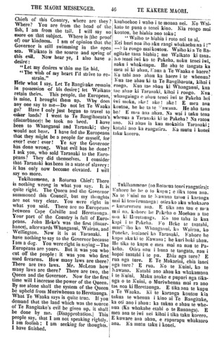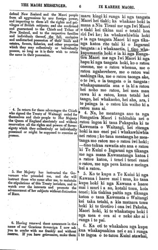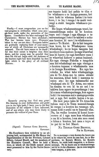 mained in your possession, or have been bought by the Government at your own desire. Your people have availed themselves of their privileges as British subjects, seek- ing and obtaining in the Courts of Law that protection and redress which they afford to all Her Majesty's subjects. But it is right you should know and understand that in return for these advantages you must prove yourselves to be loyal and faithful subjects, and that the establishment of a Maori King would be an act of disobedience and defiance to Her Majesty which cannot be tolerated. It is necessary for the preservation of peace in every country that the inhabitants should acknowledge one Head, 12. I may frankly tell you that New Zealand is the only Colony where the aborigines have been treated with unvarying kindness. It is the only Colony where they have been invited to unite with the Colonists and to become one people under one law. In other colonies the people of the land have remained separate and distinct, from which many evil consequences have ensued. Quar- rels have arisen; blood has been shed; and finally the aboriginal people of the country have been driven away or destroyed. Wise and good men in England considered that such treatment of aborigines was unjust and contrary to the principles of Christianity. They brought the subject before the British Parliament, and the Queen's Ministers advised a change of policy towards the aborigines of all English Colonies. New Zealand is the first country colonised on this new and humane system. It will be the wisdom of the Maori people to avail themselves of this generous policy, and thus save their race from evils which have befallen others less favored. It is your adoption by Her Majesty as her kupu kua rite kua pono katoa. Kei te matau ano hoki koutou, kahore he kupu i taka. Kahore he hoa riri Iwi ke kia tata mai ki a koutou. Ko o koutou whenua kua mau tonu ki a koutou, kua riro ranei i te Kawanatanga te hoko, na koutou ano te hiahia. Ko o koutou Iwi kua whai mahi ki runga ki nga tikanga i whakawhiwhia nei ratou i te whaka- nohoanga ki roto ki to Ingarani Iwi. Kua tae ratou ki nga whare whakawa ki te rapu kai tiaki, Id te rapu kai whakaora mo ratou, a kua whiwhi, kua kite i nga tikanga whakaora tangata e puare tonu nei ki o Te Kuini tamariki katoa. Otira, he mea tika tenei kia tino matau pu koutou, kia tino marama hoki ki tenei; ko koutou kua whakawhiwhia nei ki enei pai me whakakite koutou hei tamariki piri pono ki a Te Kuini. Ko tera ko te whakatu Kingi Maori, ehara tera, he tutu tera he whaka- hihi marire ki a Te Kuini, a ekore rawa e whakaaetia, Kotahi te mea mana e tau ai te rangimarie ki tetahi whenua, koia tenei, me kotahi te tumuaki mo ona tangata. 12. He kupu tenei me korero nui atu e au ki a koutou. Kia rongo mai koutou; ko Niu Tirani anake te whenua noho e te Pakeha i waiho tonu ai i te atawhai te tikanga ki nga tangata whenua. Ko Niu Tirani anake te whenua noho e te Pakeha i karangatia ai nga tangata whenua kia uru tahi ki te Pakeha hei iwi kotahi, hei noho tahi ki raro i te ture kotahi. Kei etahi whenua, waiho ana nga tangata whenua kia motuhake atu ana hei iwi ke. He tini nga he kua tupu i runga i tenei tikanga. Noho ana a, na te aha ra, kua ngangare, muri iho kua maringi te toto, a, tona tukunga iho, ko nga tangata whenua kua pana, kua wha- kangaromia. Ka titiro nga tangata whakaaro nui, whakaaro pai, i Inga-