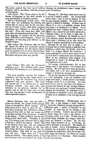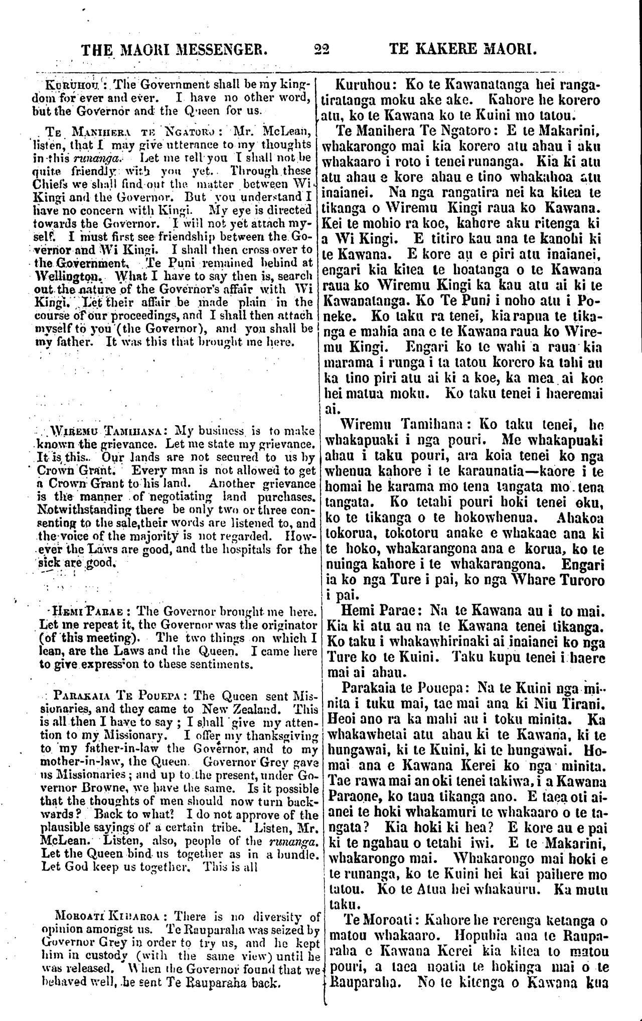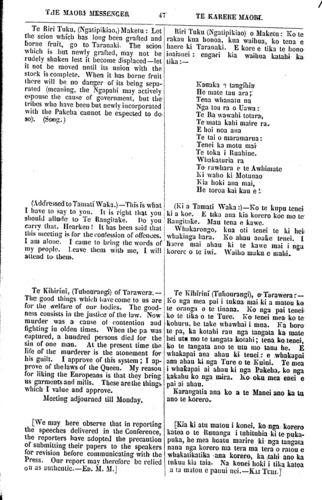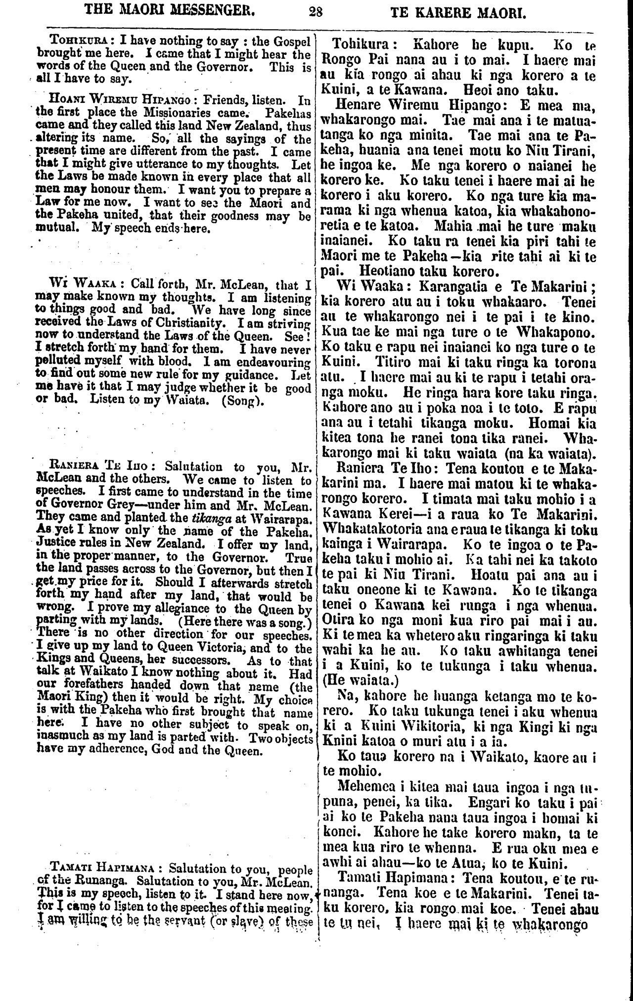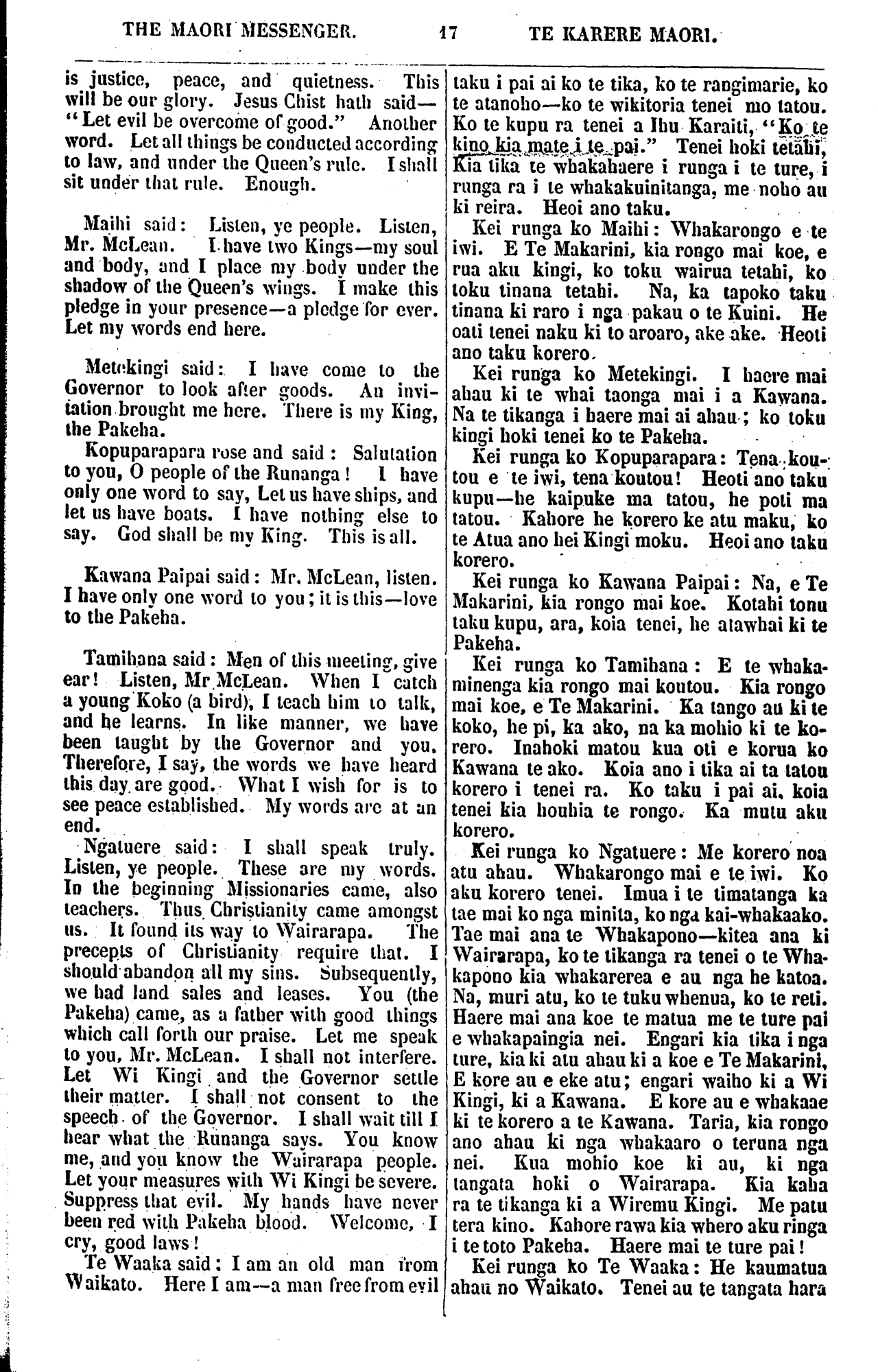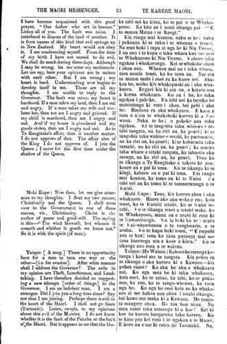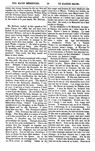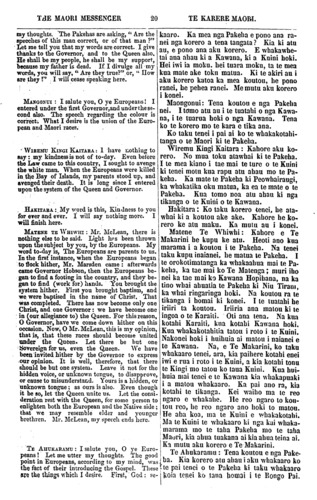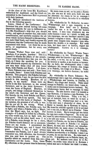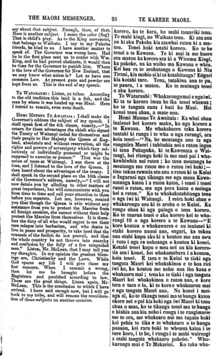 THE MAORI MESSENGER. TE KARERE MAORI. At the close of the levee His Excellency embarked for Auckland, and the Chiefs re- assembled in the Conference Hall to proceed with their business. Mr. MCLEAN introduced the business of day in the following speech: Listen, Chiefs of the Conference! The Governor has now retired having left some important subjects for you to deliberate on. It is His Excellency's wish that you should to-day, and again on another day, take under consideration, and carefully examine the ad- dress which we have listened to this morning Let each Chief freely and frankly express his sentiments that the Conference may be made acquainted with them. Let there be no re- serve, or suppression, but let every one speak freely. Thomas Walker Nene rose and said: Hearken, 0 ye people, hearken! This is a Council to discuss the affairs of the people. have come forward first; but you are the bead, so I leave the speaking for you. I shall afterwards express my sentiments that you may hear them—that all may know them, both Pakeha and Maori. I sit down. Paora Tuhaere rose and said: Now listen ye people, listen! Listen both Pakehas and Maories. This property (the Pakeha) belongs to me; therefore, I say, let me have the first speech in this meeting. Hearken. all ye people, to my words! These were my words to the first Governor, to the second Governor, and to the third Governor: I want the Laws of England. Hearken, ye people, two things commend themselves to my mind—the Governor and the Queen. For thereby do we, both Pakeha and Maori, reap good. This is my speech. The best riches for us are the Laws of England. In my opinion, the greatest of all evils is war. But we are all in the wrong. When a Maori kills a Pakeha, the Pakeha says. Let us fight; and when a Pakeha kills a Maori, then the Maori says, Let us fight. For example—if I should be killed by a Pakeha, my tribe would say, Let us fight with the Pakeha; and on the other hand were I to kill a Pakeha, even though be be a slave, the Pakeha would demand me as payment. These are my words. I entertained the Pakeha a long time ago, and I found him good. Hence, I say, I shall always rememeber the Pakeha, and I shall always remember too, with affection, the Governor who was sent here to protect us. The benefits which we received from him are— Christianity and the Laws. Now, listen! My affections at the present time lie between Ka mutu taua ru nei, na ka puta a Kawa- na, eke atu ana ki tana poti, hoki atu ana ko Akarana: ko ratou ia ko te runanga i hoki atu ki te whare, ka noho ki te whakatu korero. Ka whakatika ko Te Makarini, ka mea: Whakarongo mai e nga rangatira o te runanga. Kua hoki atu a Kawana, waiho iho ana e ia ko enei hei korero ma tatou. I mea tana whakaaro me ata noho koutou i tenei ra i tetahi ra hoki, me ata rapurapu, me ata hurihuri marire i ana korero i rangona e tatou. Heoi me whaka- puaki tena tangata tena tangata i tana wha- kaaro kia tirohia e te runanga. Kei wehi noa, kei huna noa i te korero, engari me whakapuaki. Korero ra e te runanga, korero! Ka whakatika ko Tamati Waaka Nene: Whakarongo e te iwi, Whakarongo! He runanga tenei hei korero i nga mea o te iwi. Ko tenei, e te iwi, ko au ki mua. Otira. ko koutou te upoko, a ma koutou te korero. Ko au hoki, me whakapuaki ahau i taku whakaaro kia rongo ai koutou—-kia rongo ai te Pakeha, kia rongo ai te Maori. Tena, e te runanga, me korero koutou; ka noho au. Ka whakatika ko Paora Tuhaere: Na, whakarongo mai e nga iwi, whakarongo mai —Whakarongo mai koutou, te Pakeha, te Maori; kia rongo mai koutou. Naku tenei taonga te Pakeha; na konei ahau i mea ai, maku ano te timatanga korero inaianei. Na, whakarongo katoa mai te runanga ki taku korero. Ko aku korero tenei i te tuatahi o nga Kawana, i te tuarua o nga Kawana, i te matoru o nga Kawana. Taku, e te iwi, i pai ai inaianei, koia ra tenei ko te ture o Ingarani. Na, whakarongo mai e te iwi. e rua enei mea i ahuareka ai ahau, ko te Kuini te tuatahi, ko te Kawana te tuarua. Ma konei ka whiwhi ngatahi ai ki te pai enei iwi e rua nei, te Maori me te Pakeha. Taku korero ra tenei. Ko te taonga pai mo tatou ko nga ture anake o Ingarani. Ko te he nui tenei ki taku whakaaro ko te whawhai. Otira e he tahi ana tatou. Ka patu tetahi tangata Maori i te Pakeha, na, ka mea te Pakeha, me whawhai; ka patu te Pakeha i te tangata Maori, ka mea ano te Maori, me whawhai. Koiano hoki, ka mate ahau i te Pakeha, ka mea taku iwi kia whawhai ki te Pakeha. Ahakoa taurekareka o te Pakeha i mate i au te patu, ko au ano hei utu. Ko taku tenei e te iwi. I tangohia e au te Pakeha imua, oa, kua pai. Ea mahara tonu ahau ki te Pa- keha; ka aroha tonu ahau ki te Kawana i tukua mai nei e te Kuini hei tiaki i a tatou.