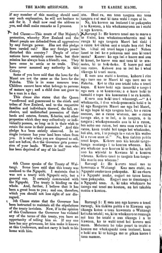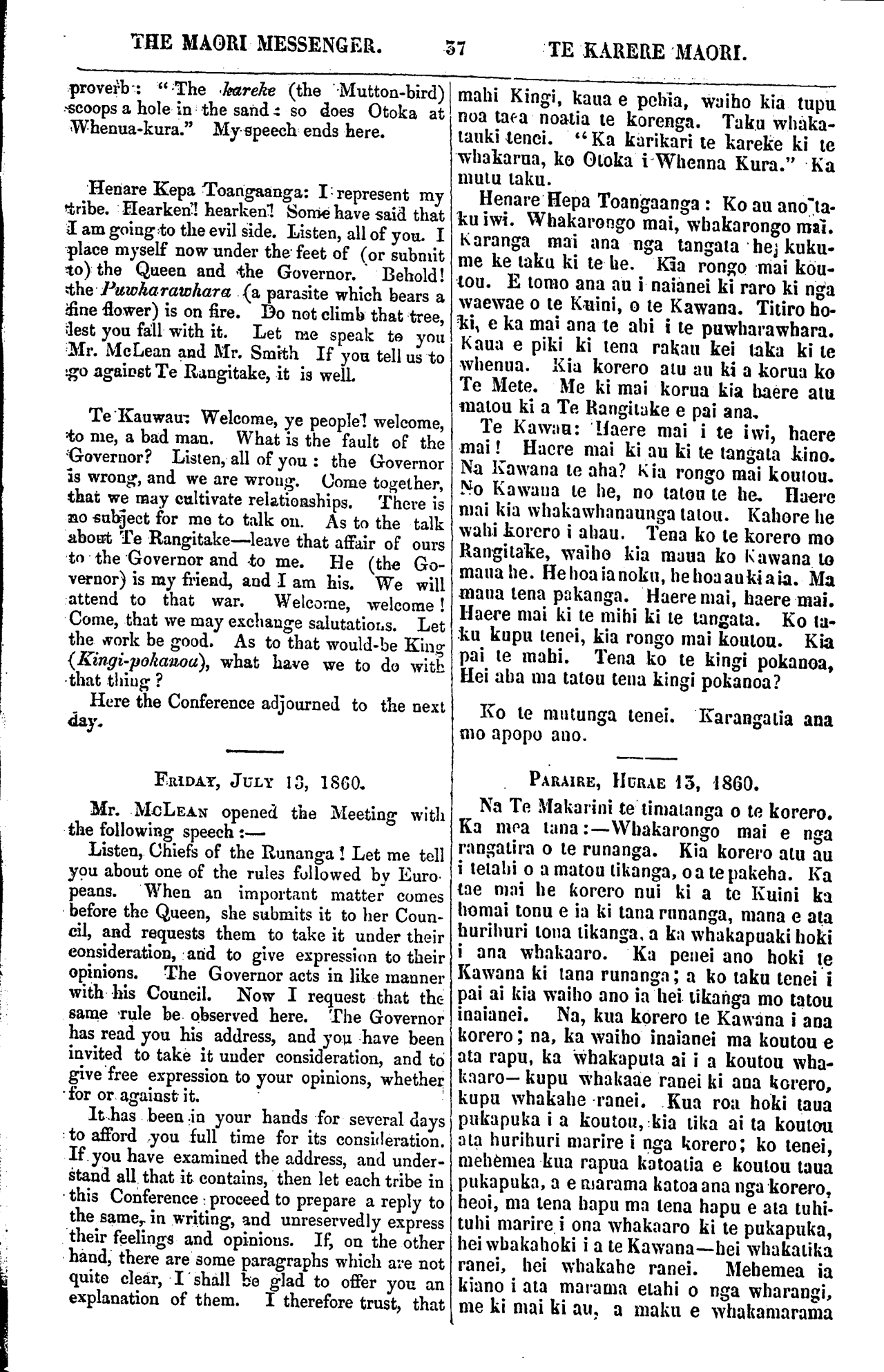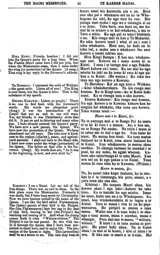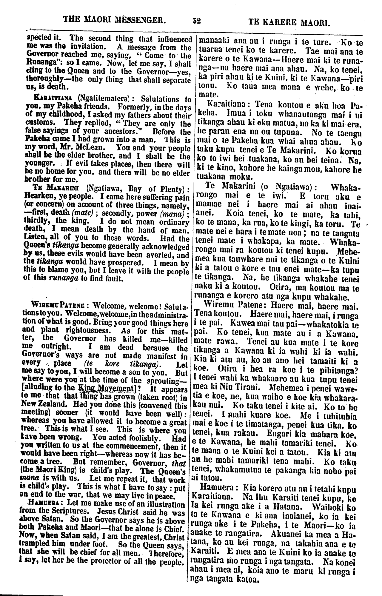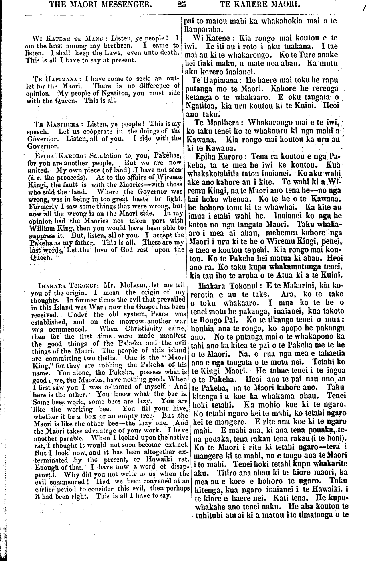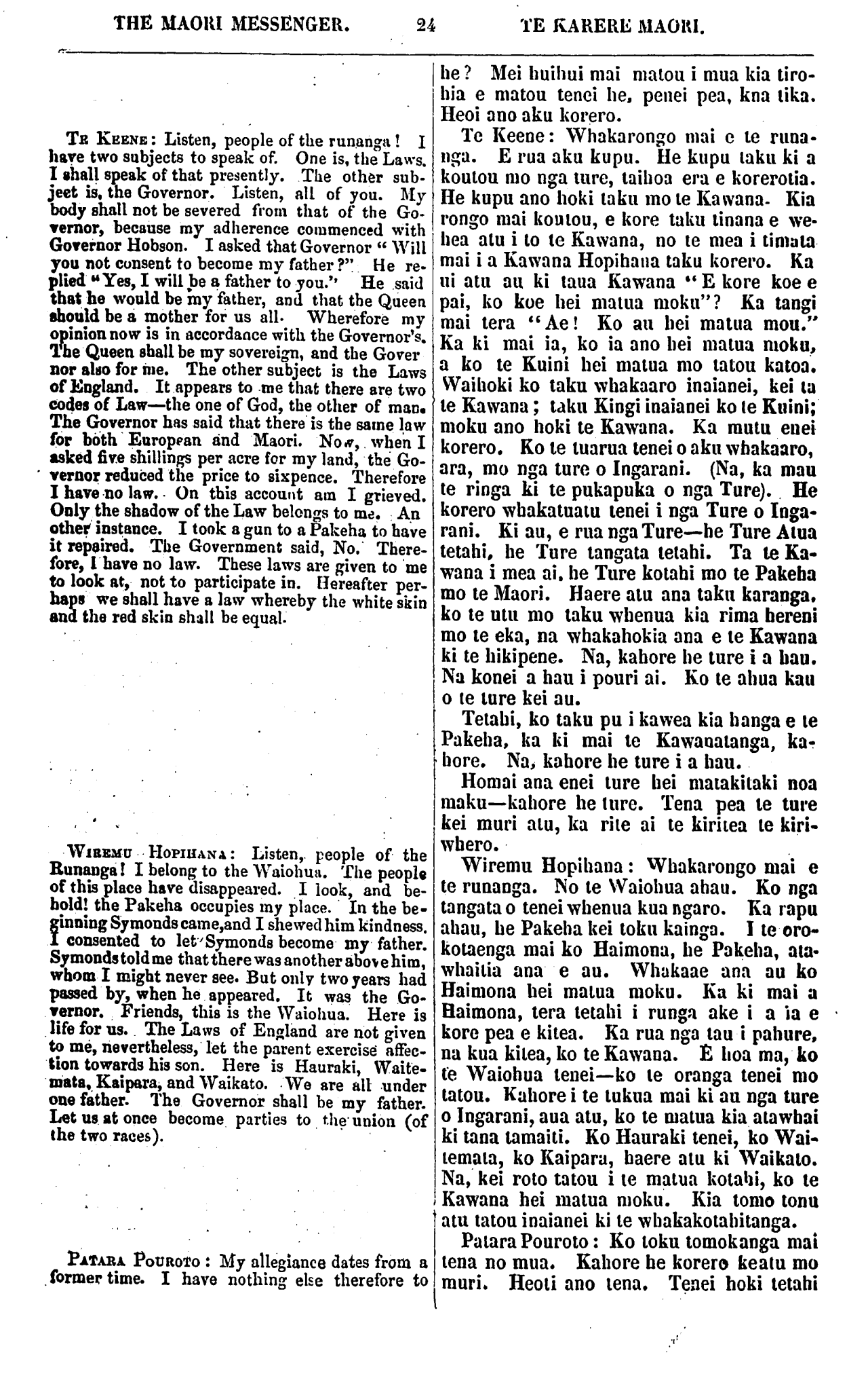THE MAORI MESSENGER. TE KARERE MAORI. At the close of the levee His Excellency embarked for Auckland, and the Chiefs re- assembled in the Conference Hall to proceed with their business. Mr. MCLEAN introduced the business of day in the following speech: Listen, Chiefs of the Conference! The Governor has now retired having left some important subjects for you to deliberate on. It is His Excellency's wish that you should to-day, and again on another day, take under consideration, and carefully examine the ad- dress which we have listened to this morning Let each Chief freely and frankly express his sentiments that the Conference may be made acquainted with them. Let there be no re- serve, or suppression, but let every one speak freely. Thomas Walker Nene rose and said: Hearken, 0 ye people, hearken! This is a Council to discuss the affairs of the people. have come forward first; but you are the bead, so I leave the speaking for you. I shall afterwards express my sentiments that you may hear them—that all may know them, both Pakeha and Maori. I sit down. Paora Tuhaere rose and said: Now listen ye people, listen! Listen both Pakehas and Maories. This property (the Pakeha) belongs to me; therefore, I say, let me have the first speech in this meeting. Hearken. all ye people, to my words! These were my words to the first Governor, to the second Governor, and to the third Governor: I want the Laws of England. Hearken, ye people, two things commend themselves to my mind—the Governor and the Queen. For thereby do we, both Pakeha and Maori, reap good. This is my speech. The best riches for us are the Laws of England. In my opinion, the greatest of all evils is war. But we are all in the wrong. When a Maori kills a Pakeha, the Pakeha says. Let us fight; and when a Pakeha kills a Maori, then the Maori says, Let us fight. For example—if I should be killed by a Pakeha, my tribe would say, Let us fight with the Pakeha; and on the other hand were I to kill a Pakeha, even though be be a slave, the Pakeha would demand me as payment. These are my words. I entertained the Pakeha a long time ago, and I found him good. Hence, I say, I shall always rememeber the Pakeha, and I shall always remember too, with affection, the Governor who was sent here to protect us. The benefits which we received from him are— Christianity and the Laws. Now, listen! My affections at the present time lie between Ka mutu taua ru nei, na ka puta a Kawa- na, eke atu ana ki tana poti, hoki atu ana ko Akarana: ko ratou ia ko te runanga i hoki atu ki te whare, ka noho ki te whakatu korero. Ka whakatika ko Te Makarini, ka mea: Whakarongo mai e nga rangatira o te runanga. Kua hoki atu a Kawana, waiho iho ana e ia ko enei hei korero ma tatou. I mea tana whakaaro me ata noho koutou i tenei ra i tetahi ra hoki, me ata rapurapu, me ata hurihuri marire i ana korero i rangona e tatou. Heoi me whaka- puaki tena tangata tena tangata i tana wha- kaaro kia tirohia e te runanga. Kei wehi noa, kei huna noa i te korero, engari me whakapuaki. Korero ra e te runanga, korero! Ka whakatika ko Tamati Waaka Nene: Whakarongo e te iwi, Whakarongo! He runanga tenei hei korero i nga mea o te iwi. Ko tenei, e te iwi, ko au ki mua. Otira. ko koutou te upoko, a ma koutou te korero. Ko au hoki, me whakapuaki ahau i taku whakaaro kia rongo ai koutou—-kia rongo ai te Pakeha, kia rongo ai te Maori. Tena, e te runanga, me korero koutou; ka noho au. Ka whakatika ko Paora Tuhaere: Na, whakarongo mai e nga iwi, whakarongo mai —Whakarongo mai koutou, te Pakeha, te Maori; kia rongo mai koutou. Naku tenei taonga te Pakeha; na konei ahau i mea ai, maku ano te timatanga korero inaianei. Na, whakarongo katoa mai te runanga ki taku korero. Ko aku korero tenei i te tuatahi o nga Kawana, i te tuarua o nga Kawana, i te matoru o nga Kawana. Taku, e te iwi, i pai ai inaianei, koia ra tenei ko te ture o Ingarani. Na, whakarongo mai e te iwi. e rua enei mea i ahuareka ai ahau, ko te Kuini te tuatahi, ko te Kawana te tuarua. Ma konei ka whiwhi ngatahi ai ki te pai enei iwi e rua nei, te Maori me te Pakeha. Taku korero ra tenei. Ko te taonga pai mo tatou ko nga ture anake o Ingarani. Ko te he nui tenei ki taku whakaaro ko te whawhai. Otira e he tahi ana tatou. Ka patu tetahi tangata Maori i te Pakeha, na, ka mea te Pakeha, me whawhai; ka patu te Pakeha i te tangata Maori, ka mea ano te Maori, me whawhai. Koiano hoki, ka mate ahau i te Pakeha, ka mea taku iwi kia whawhai ki te Pakeha. Ahakoa taurekareka o te Pakeha i mate i au te patu, ko au ano hei utu. Ko taku tenei e te iwi. I tangohia e au te Pakeha imua, oa, kua pai. Ea mahara tonu ahau ki te Pa- keha; ka aroha tonu ahau ki te Kawana i tukua mai nei e te Kuini hei tiaki i a tatou.