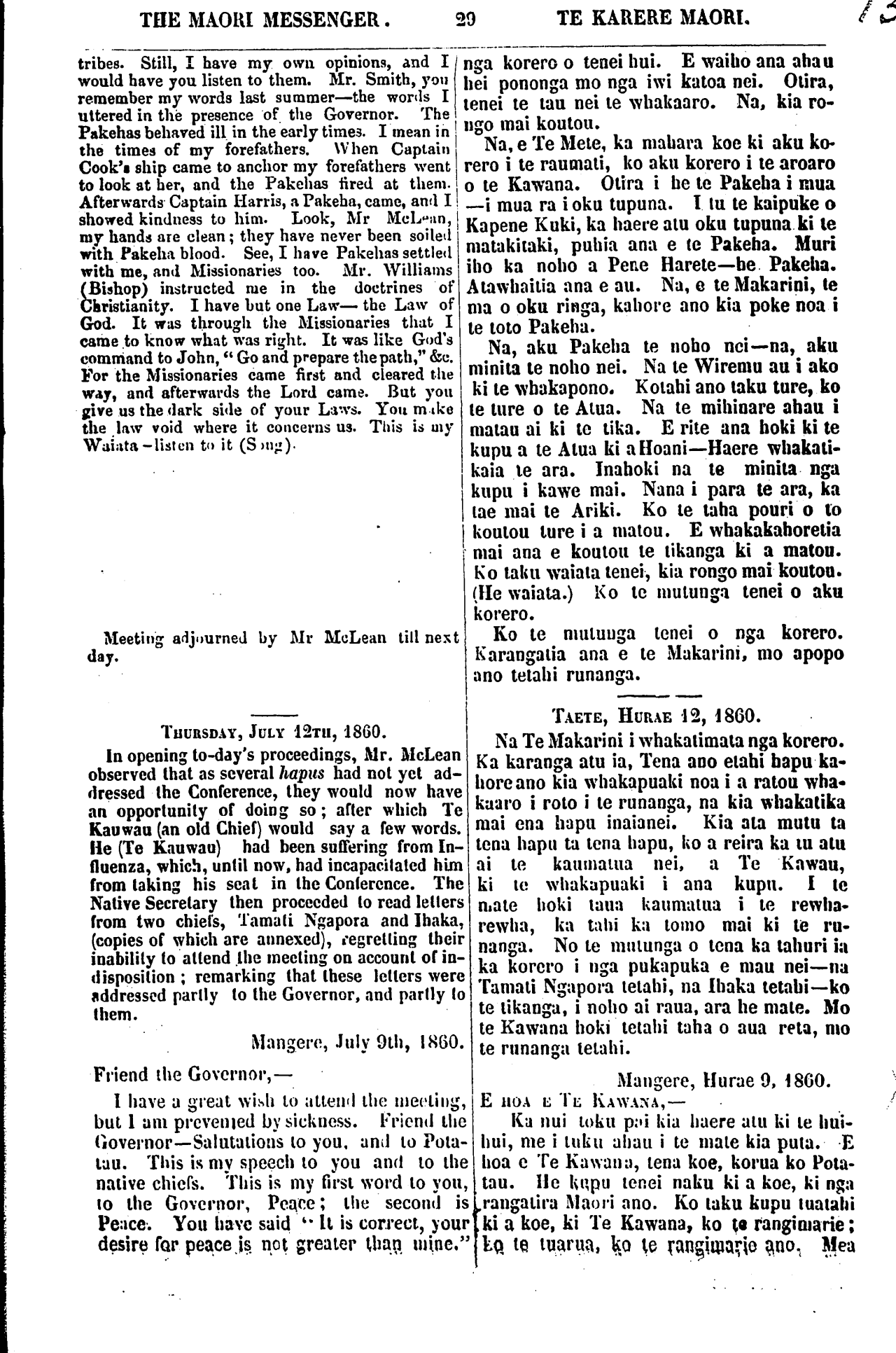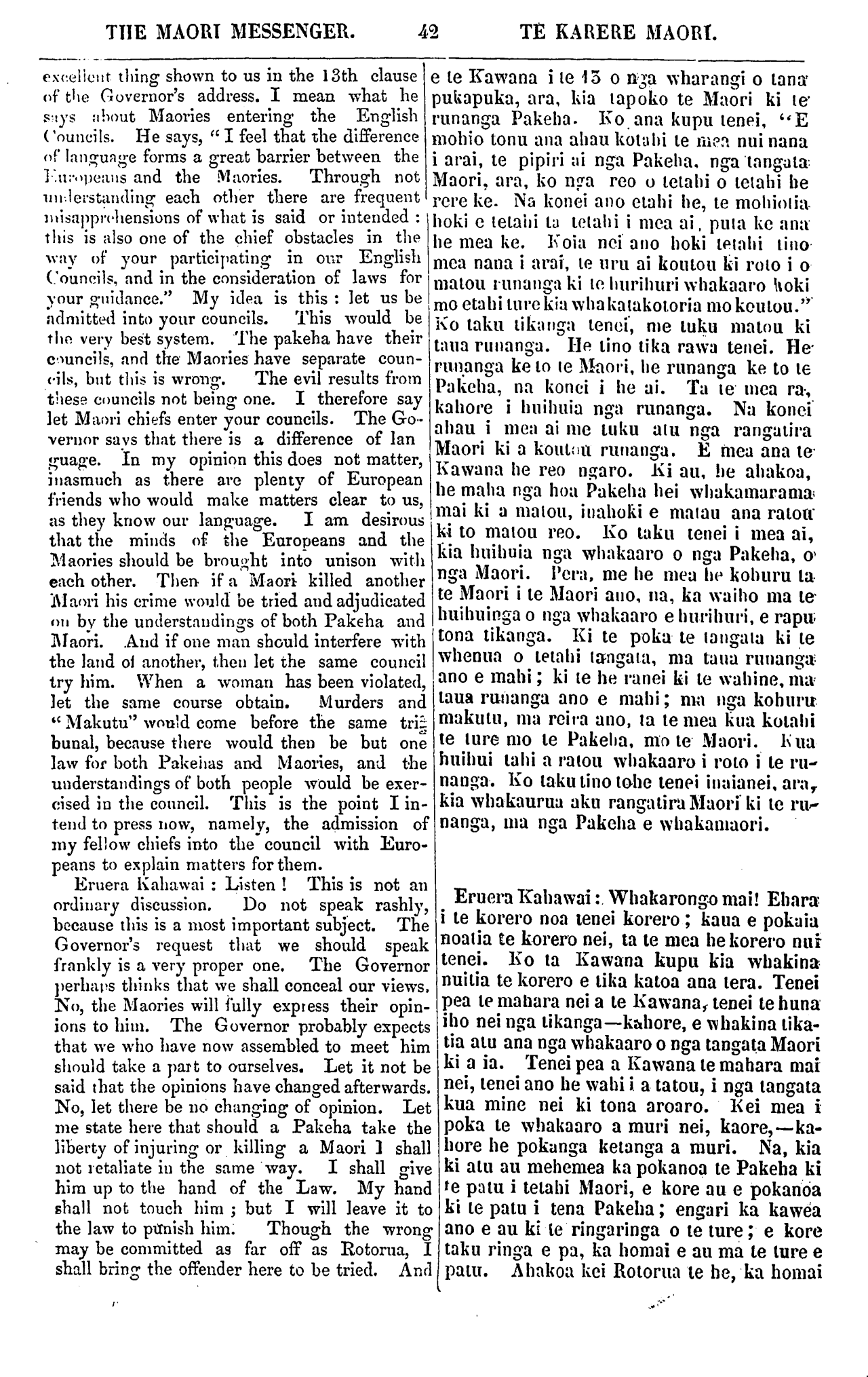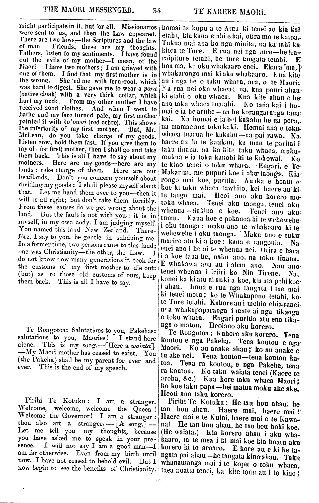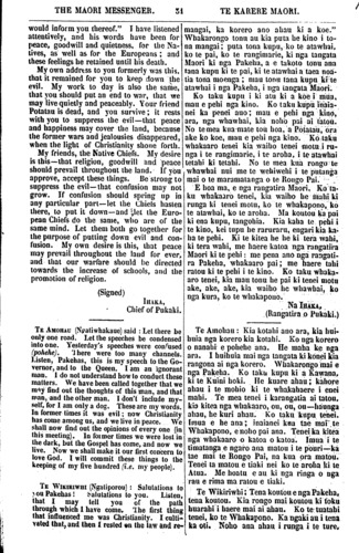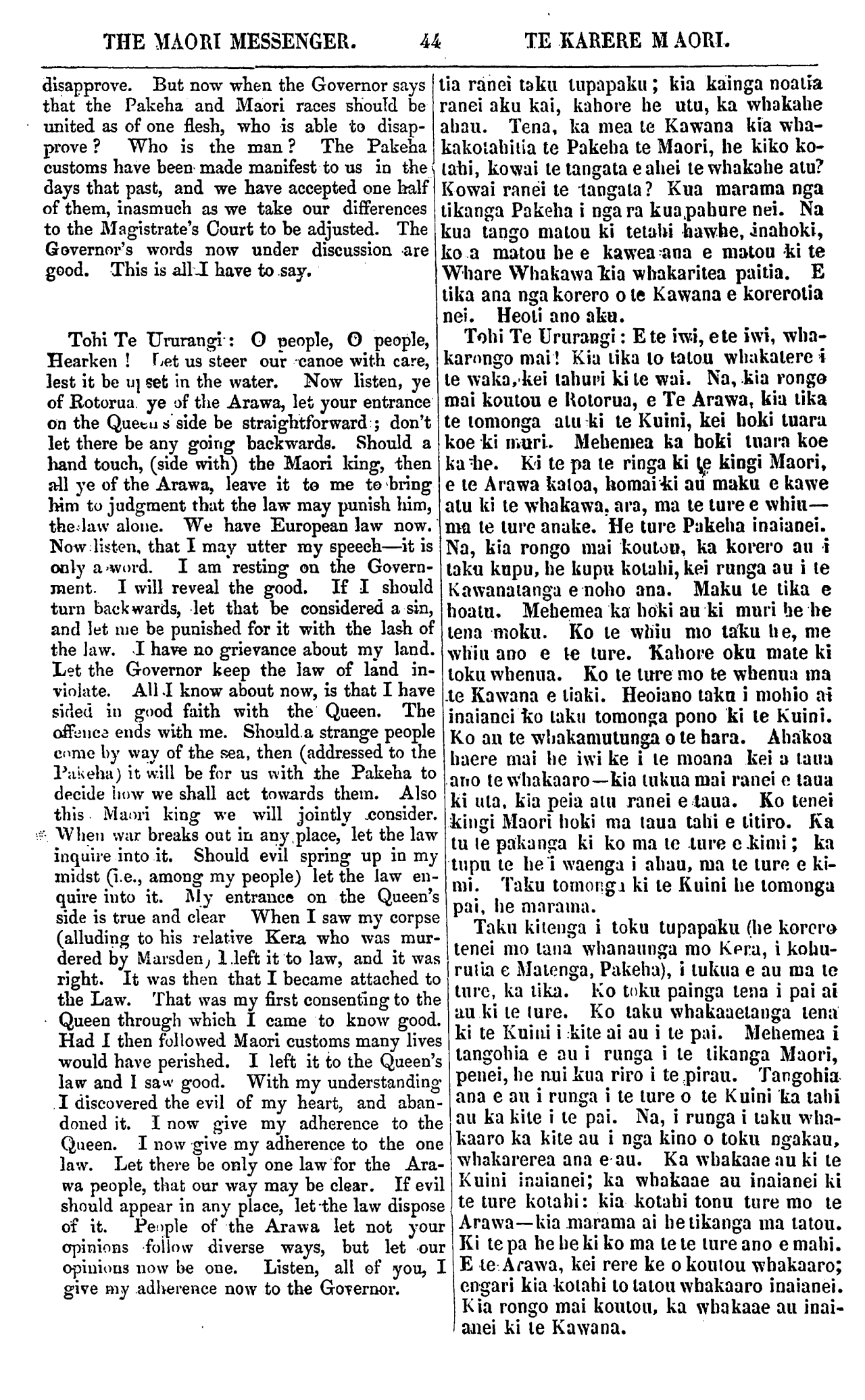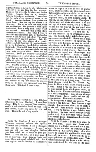 THE MAORI MESSENGER. TE KARERE MAORI. At the close of the levee His Excellency embarked for Auckland, and the Chiefs re- assembled in the Conference Hall to proceed with their business. Mr. MCLEAN introduced the business of day in the following speech: Listen, Chiefs of the Conference! The Governor has now retired having left some important subjects for you to deliberate on. It is His Excellency's wish that you should to-day, and again on another day, take under consideration, and carefully examine the ad- dress which we have listened to this morning Let each Chief freely and frankly express his sentiments that the Conference may be made acquainted with them. Let there be no re- serve, or suppression, but let every one speak freely. Thomas Walker Nene rose and said: Hearken, 0 ye people, hearken! This is a Council to discuss the affairs of the people. have come forward first; but you are the bead, so I leave the speaking for you. I shall afterwards express my sentiments that you may hear them—that all may know them, both Pakeha and Maori. I sit down. Paora Tuhaere rose and said: Now listen ye people, listen! Listen both Pakehas and Maories. This property (the Pakeha) belongs to me; therefore, I say, let me have the first speech in this meeting. Hearken. all ye people, to my words! These were my words to the first Governor, to the second Governor, and to the third Governor: I want the Laws of England. Hearken, ye people, two things commend themselves to my mind—the Governor and the Queen. For thereby do we, both Pakeha and Maori, reap good. This is my speech. The best riches for us are the Laws of England. In my opinion, the greatest of all evils is war. But we are all in the wrong. When a Maori kills a Pakeha, the Pakeha says. Let us fight; and when a Pakeha kills a Maori, then the Maori says, Let us fight. For example—if I should be killed by a Pakeha, my tribe would say, Let us fight with the Pakeha; and on the other hand were I to kill a Pakeha, even though be be a slave, the Pakeha would demand me as payment. These are my words. I entertained the Pakeha a long time ago, and I found him good. Hence, I say, I shall always rememeber the Pakeha, and I shall always remember too, with affection, the Governor who was sent here to protect us. The benefits which we received from him are— Christianity and the Laws. Now, listen! My affections at the present time lie between Ka mutu taua ru nei, na ka puta a Kawa- na, eke atu ana ki tana poti, hoki atu ana ko Akarana: ko ratou ia ko te runanga i hoki atu ki te whare, ka noho ki te whakatu korero. Ka whakatika ko Te Makarini, ka mea: Whakarongo mai e nga rangatira o te runanga. Kua hoki atu a Kawana, waiho iho ana e ia ko enei hei korero ma tatou. I mea tana whakaaro me ata noho koutou i tenei ra i tetahi ra hoki, me ata rapurapu, me ata hurihuri marire i ana korero i rangona e tatou. Heoi me whaka- puaki tena tangata tena tangata i tana wha- kaaro kia tirohia e te runanga. Kei wehi noa, kei huna noa i te korero, engari me whakapuaki. Korero ra e te runanga, korero! Ka whakatika ko Tamati Waaka Nene: Whakarongo e te iwi, Whakarongo! He runanga tenei hei korero i nga mea o te iwi. Ko tenei, e te iwi, ko au ki mua. Otira. ko koutou te upoko, a ma koutou te korero. Ko au hoki, me whakapuaki ahau i taku whakaaro kia rongo ai koutou—-kia rongo ai te Pakeha, kia rongo ai te Maori. Tena, e te runanga, me korero koutou; ka noho au. Ka whakatika ko Paora Tuhaere: Na, whakarongo mai e nga iwi, whakarongo mai —Whakarongo mai koutou, te Pakeha, te Maori; kia rongo mai koutou. Naku tenei taonga te Pakeha; na konei ahau i mea ai, maku ano te timatanga korero inaianei. Na, whakarongo katoa mai te runanga ki taku korero. Ko aku korero tenei i te tuatahi o nga Kawana, i te tuarua o nga Kawana, i te matoru o nga Kawana. Taku, e te iwi, i pai ai inaianei, koia ra tenei ko te ture o Ingarani. Na, whakarongo mai e te iwi. e rua enei mea i ahuareka ai ahau, ko te Kuini te tuatahi, ko te Kawana te tuarua. Ma konei ka whiwhi ngatahi ai ki te pai enei iwi e rua nei, te Maori me te Pakeha. Taku korero ra tenei. Ko te taonga pai mo tatou ko nga ture anake o Ingarani. Ko te he nui tenei ki taku whakaaro ko te whawhai. Otira e he tahi ana tatou. Ka patu tetahi tangata Maori i te Pakeha, na, ka mea te Pakeha, me whawhai; ka patu te Pakeha i te tangata Maori, ka mea ano te Maori, me whawhai. Koiano hoki, ka mate ahau i te Pakeha, ka mea taku iwi kia whawhai ki te Pakeha. Ahakoa taurekareka o te Pakeha i mate i au te patu, ko au ano hei utu. Ko taku tenei e te iwi. I tangohia e au te Pakeha imua, oa, kua pai. Ea mahara tonu ahau ki te Pa- keha; ka aroha tonu ahau ki te Kawana i tukua mai nei e te Kuini hei tiaki i a tatou.