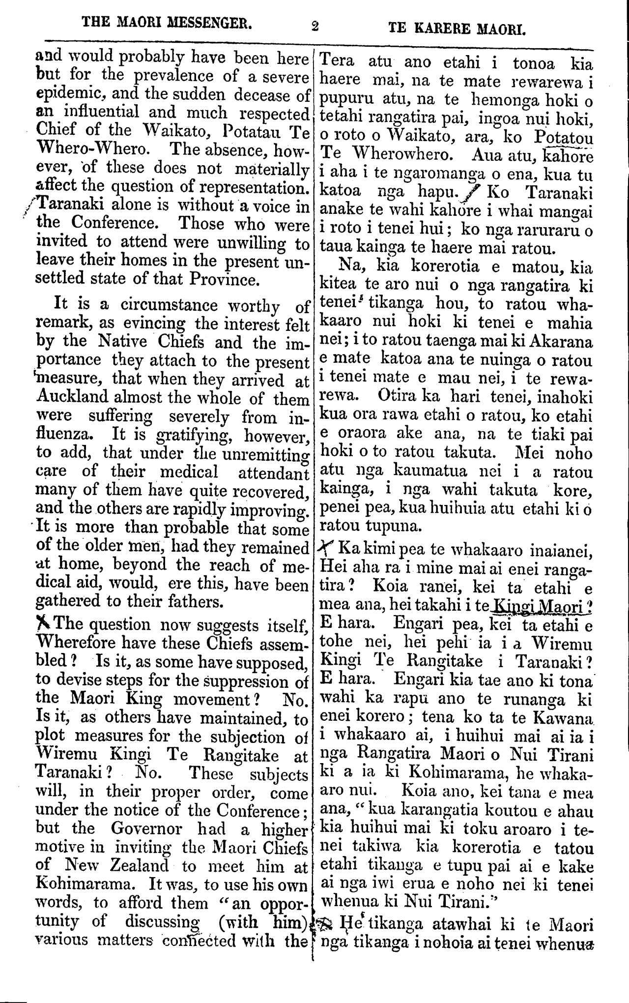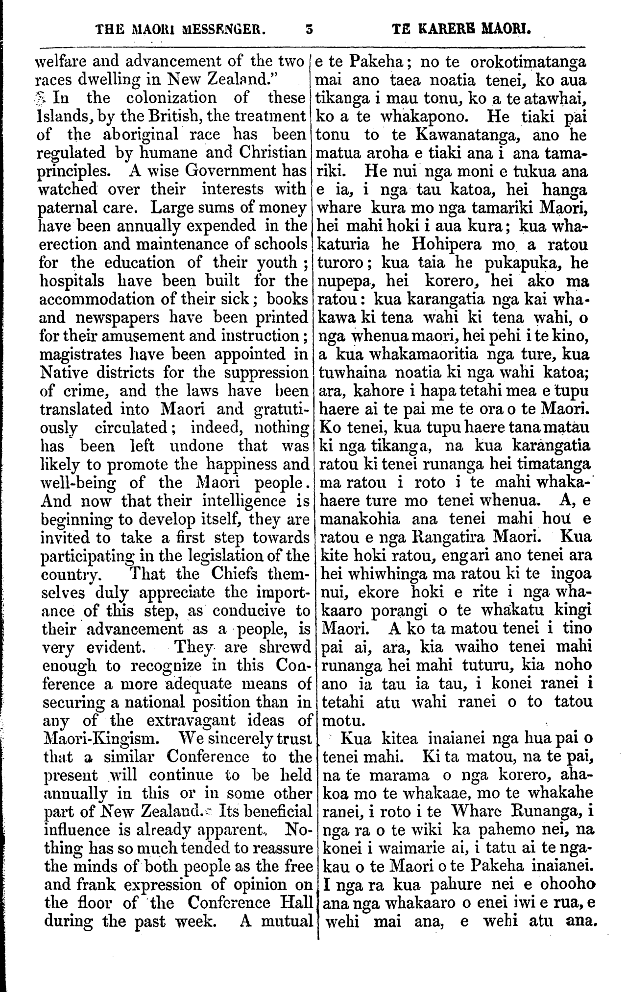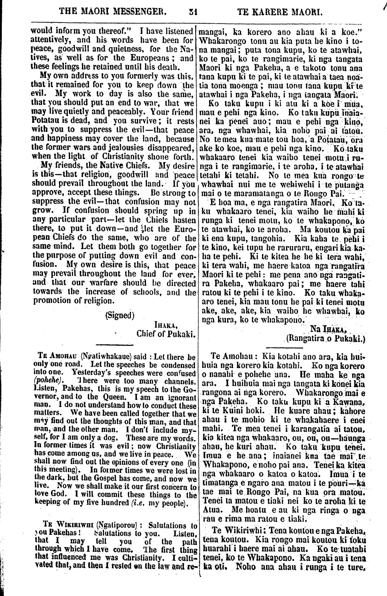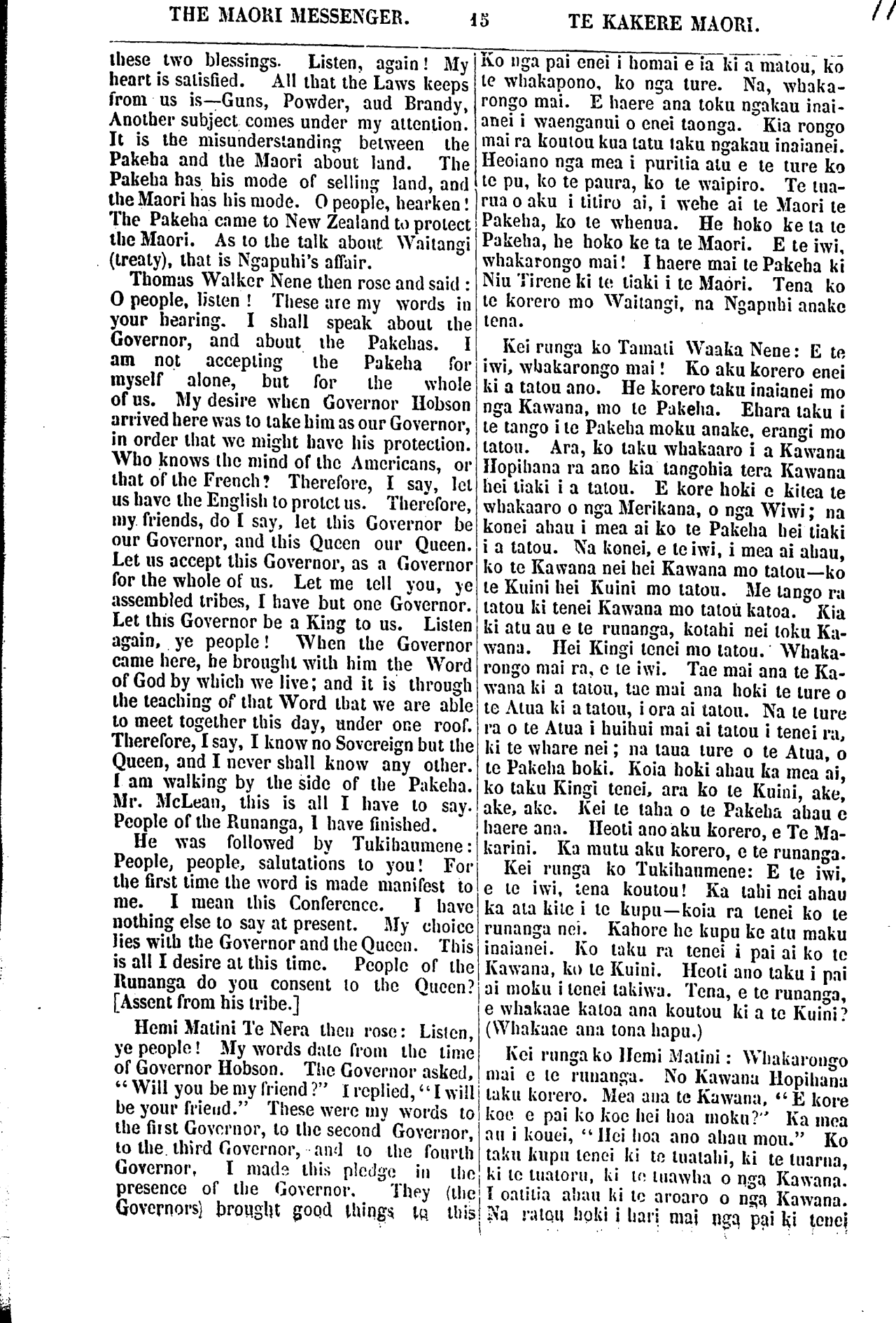 THE MAORI MESSENGER. TE KARERE MAORI. At the close of the levee His Excellency embarked for Auckland, and the Chiefs re- assembled in the Conference Hall to proceed with their business. Mr. MCLEAN introduced the business of day in the following speech: Listen, Chiefs of the Conference! The Governor has now retired having left some important subjects for you to deliberate on. It is His Excellency's wish that you should to-day, and again on another day, take under consideration, and carefully examine the ad- dress which we have listened to this morning Let each Chief freely and frankly express his sentiments that the Conference may be made acquainted with them. Let there be no re- serve, or suppression, but let every one speak freely. Thomas Walker Nene rose and said: Hearken, 0 ye people, hearken! This is a Council to discuss the affairs of the people. have come forward first; but you are the bead, so I leave the speaking for you. I shall afterwards express my sentiments that you may hear them—that all may know them, both Pakeha and Maori. I sit down. Paora Tuhaere rose and said: Now listen ye people, listen! Listen both Pakehas and Maories. This property (the Pakeha) belongs to me; therefore, I say, let me have the first speech in this meeting. Hearken. all ye people, to my words! These were my words to the first Governor, to the second Governor, and to the third Governor: I want the Laws of England. Hearken, ye people, two things commend themselves to my mind—the Governor and the Queen. For thereby do we, both Pakeha and Maori, reap good. This is my speech. The best riches for us are the Laws of England. In my opinion, the greatest of all evils is war. But we are all in the wrong. When a Maori kills a Pakeha, the Pakeha says. Let us fight; and when a Pakeha kills a Maori, then the Maori says, Let us fight. For example—if I should be killed by a Pakeha, my tribe would say, Let us fight with the Pakeha; and on the other hand were I to kill a Pakeha, even though be be a slave, the Pakeha would demand me as payment. These are my words. I entertained the Pakeha a long time ago, and I found him good. Hence, I say, I shall always rememeber the Pakeha, and I shall always remember too, with affection, the Governor who was sent here to protect us. The benefits which we received from him are— Christianity and the Laws. Now, listen! My affections at the present time lie between Ka mutu taua ru nei, na ka puta a Kawa- na, eke atu ana ki tana poti, hoki atu ana ko Akarana: ko ratou ia ko te runanga i hoki atu ki te whare, ka noho ki te whakatu korero. Ka whakatika ko Te Makarini, ka mea: Whakarongo mai e nga rangatira o te runanga. Kua hoki atu a Kawana, waiho iho ana e ia ko enei hei korero ma tatou. I mea tana whakaaro me ata noho koutou i tenei ra i tetahi ra hoki, me ata rapurapu, me ata hurihuri marire i ana korero i rangona e tatou. Heoi me whaka- puaki tena tangata tena tangata i tana wha- kaaro kia tirohia e te runanga. Kei wehi noa, kei huna noa i te korero, engari me whakapuaki. Korero ra e te runanga, korero! Ka whakatika ko Tamati Waaka Nene: Whakarongo e te iwi, Whakarongo! He runanga tenei hei korero i nga mea o te iwi. Ko tenei, e te iwi, ko au ki mua. Otira. ko koutou te upoko, a ma koutou te korero. Ko au hoki, me whakapuaki ahau i taku whakaaro kia rongo ai koutou—-kia rongo ai te Pakeha, kia rongo ai te Maori. Tena, e te runanga, me korero koutou; ka noho au. Ka whakatika ko Paora Tuhaere: Na, whakarongo mai e nga iwi, whakarongo mai —Whakarongo mai koutou, te Pakeha, te Maori; kia rongo mai koutou. Naku tenei taonga te Pakeha; na konei ahau i mea ai, maku ano te timatanga korero inaianei. Na, whakarongo katoa mai te runanga ki taku korero. Ko aku korero tenei i te tuatahi o nga Kawana, i te tuarua o nga Kawana, i te matoru o nga Kawana. Taku, e te iwi, i pai ai inaianei, koia ra tenei ko te ture o Ingarani. Na, whakarongo mai e te iwi. e rua enei mea i ahuareka ai ahau, ko te Kuini te tuatahi, ko te Kawana te tuarua. Ma konei ka whiwhi ngatahi ai ki te pai enei iwi e rua nei, te Maori me te Pakeha. Taku korero ra tenei. Ko te taonga pai mo tatou ko nga ture anake o Ingarani. Ko te he nui tenei ki taku whakaaro ko te whawhai. Otira e he tahi ana tatou. Ka patu tetahi tangata Maori i te Pakeha, na, ka mea te Pakeha, me whawhai; ka patu te Pakeha i te tangata Maori, ka mea ano te Maori, me whawhai. Koiano hoki, ka mate ahau i te Pakeha, ka mea taku iwi kia whawhai ki te Pakeha. Ahakoa taurekareka o te Pakeha i mate i au te patu, ko au ano hei utu. Ko taku tenei e te iwi. I tangohia e au te Pakeha imua, oa, kua pai. Ea mahara tonu ahau ki te Pa- keha; ka aroha tonu ahau ki te Kawana i tukua mai nei e te Kuini hei tiaki i a tatou.