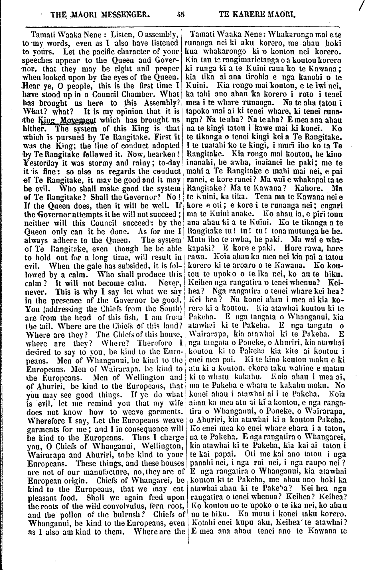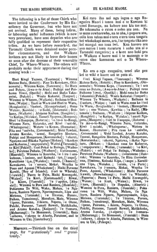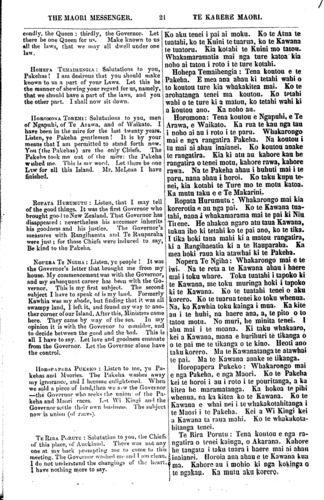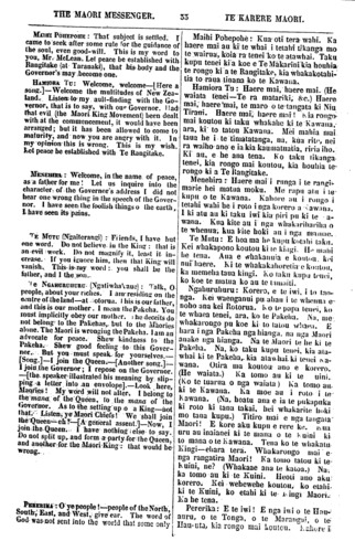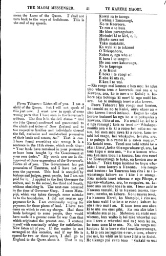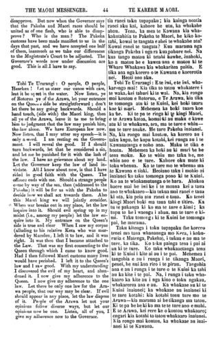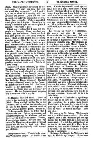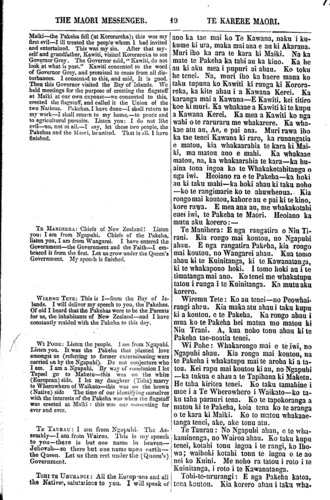 THE MAORI MESSENGER. TE KAKERE MAORI. KURUHOU: The Government shall be my king- dom for ever and ever. I have no other word, but (he Governor and the Queen for us. TE MANIHERA TU NGATORO: Mr. McLean, listen, that I may give utterance to my thoughts in-? his runanga. Let me tell you I shall not be quite friendiy with you yet. Through these Chief's we shall find out the matter between Wi. Kingi and the Governor. But you understand I have no concern with Kingi. My eye is directed towards the Governor. I wiil not yet attach my- self. I must first see friendship between the Go- vernor and Wi Kingi. I shall then cross over to the Government, Te Puni remained behind at Wellington. What I have to say then is, search out the nature of the Governor's affair with Wi Kingi. Let their affair be made plain in the course or our proceedings, and I shall then attach myself to you (the Governor), and you shall be my father. It was this that brought me here. WIREMU TAMIHANA: My business is to make known the grievance. Let me state my grievance. It is this. Our lands are not secured to us by Crown Grant. Every man is not allowed to get a Crown Grant to his land. Another grievance is the manner of negotiating land purchases. Notwithstanding there be only two or three con- senting to the sale, their words are listened to, and the voice of the majority is not regarded. How- ever the Laws are good, and the hospitals for the sick are good. HEMI PARAE: The Governor brought me here. Let me repeat it, the Governor was the originator (of this meeting). The two things on which I lean, are the Laws and the Queen. I came here to give expression to these sentiments. PARAKAIA TE POUEPA: The Queen sent Mis- sionaries, and they came to New Zealand. This is all then I have to say; I shall give my atten- tion to my Missionary. I offer my thanksgiving to my father-in-law the Governor, and to my mother-in-law, the Queen Governor Grey gave us Missionaries; and up to the present, under Go- vernor Browne, we have the same. Is it possible that the thoughts of men should now turn back- wards? Back to what; I do not approve of the plausible sayings of a certain tribe. Listen, Mr. McLean. Listen, also, people of the runanga. Let the Queen bind us together as in a bundle. Let God keep us together. This is all MOHOATI KIHAROA: There is no diversity of opinion amongst us. Te Rauparaha was seized by Governor Grey in order to try us, and he kept him in custody (with the same view) until he was released. When the Governor found that we behaved well,, be sent Te Rauparaha back. Kuruhou: Ko te Kawanatanga hei ranga- tiratanga moku ake ake. Kahore he korero atu, ko te Kawana ko te Kuini mo tatou. Te Manihera Te Ngatoro: E te Makarini, whakarongo mai kia korero atu ahau i uku whakaaro i roto i tenei runanga. Kia ki atu atu ahau e kore ahau e tino whakahoa atu inaianei. Na nga rangatira nei ka kitea te tikanga o Wiremu Kingi raua ko Kawana. Kei te mohio ra koe, kahore aku ritenga ki a Wi Kingi. E titiro kau ana te kanohi ki te Kawana. E kore au e piri atu inaianei, engari kia kitea te hoatanga o te Kawana raua ko Wiremu Kingi ka kau atu ai ki te Kawanatanga. Ko Te Puni i noho atu i Po- neke. Ko taku ra tenei, kia rapua te tika- nga e mahia ana e te Kawana raua ko Wire- mu Kingi. Engari ko te wahi a raua kia mamma i runga i ta tatou korero ka tahi au ka tino piri atu ai ki a koe, ka mea ai koe hei matua moku. Ko taku tenei i haeremai ai. Wiremu Tamihana: Ko taku tenei, he whakapuaki i nga pouri. Me whakapuaki ahau i taku pouri, ara koia tenei ko nga whenua kahore i te karaunatia— kaore i te homai he karama mo tena tangata mo tena tangata. Ko tetahi pouri hoki tenei oku, ko te tikanga o te hokowhenua. Ahakoa tokorua, tokotoru anake e whakaae ana ki te hoko, whakarangona ana e korua, ko te nuinga kahore i te whakarangona. Engari ia ko nga Ture i pai, ko nga Whare Turoro i pai. Hemi Parae: Na te Kawana au i to mai. Kia ki atu au na te Kawana tenei tikanga. Ko taku i whakawhirinaki ai inaianei ko nga Ture ko te Kuini. Taku kupu tenei i haere mai ai ahau. Parakaia te Pouepa: Na te Kuini nga mi- nita i tuku mai, tae mai ana ki Niu Tirani. Heoi ano ra ka mahi au i toku minita. Ka whakawhetai atu ahau ki te Kawana, ki te hungawai, ki te Kuini, ki te hungawai. Ho- mai ana e Kawana Kerei ko nga minita. Tae rawa mai an oki tenei takiwa, i a Kawana Paraone, ko taua tikanga ano. E taea oti ai- anei te hoki whakamuri te whakaaro o te ta- ngata? Kia hoki ki hea? E kore au e pai ki te ngahau o tetahi iwi. E te Makarini, whakarongo mai. Whakarongo mai hoki e te runanga, ko te Kuini hei kai paihere mo tatou. Ko te Atua hei whakauru. Ka mutu taku. Te Moroati: Kahore he rerenga ketanga o matou whakaaro. Hopuhia ana te Raupa- raha e Kawana Kerei kia kitea to matou pouri, a taea noatia te hokinga mai o te Rauparaha. No te kitenga o Kawana kua